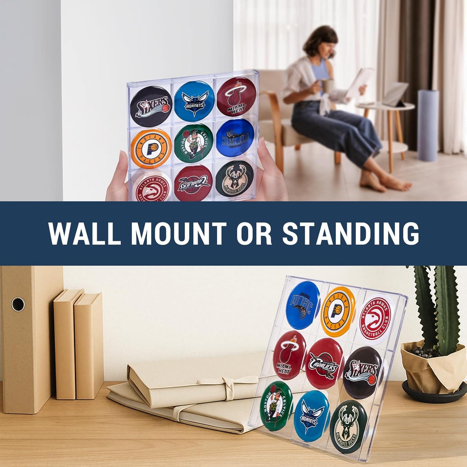 Grande lattice: grande reticolo spaziale da 5,8 cm, adatto per mostre sotto i 5,7 cm di diametro inferiore a 5,7 cm, spille da collezione per fan sportivi o pulsanti da collezione ANIME. (bottoni non inclusi) Supporto per display a perno: attaccare le gambe di supporto incluse al supporto in una forma "7" in modo che rimangano più saldamente sul tavolo. Migliora una parete noiosa: il supporto da parete con pulsante pinback può trasformare le pareti in una galleria in casa o in ufficio. Display trasparente: è perfetto per esporre e conservare una gamma di distintivi da collezione di grandi dimensioni come film, sport, personaggi dei cartoni animati, anime, giochi. Esposizione speciale: questi bottoni a tema assumeranno un significato completamente nuovo, ed è allora che brillano davvero.