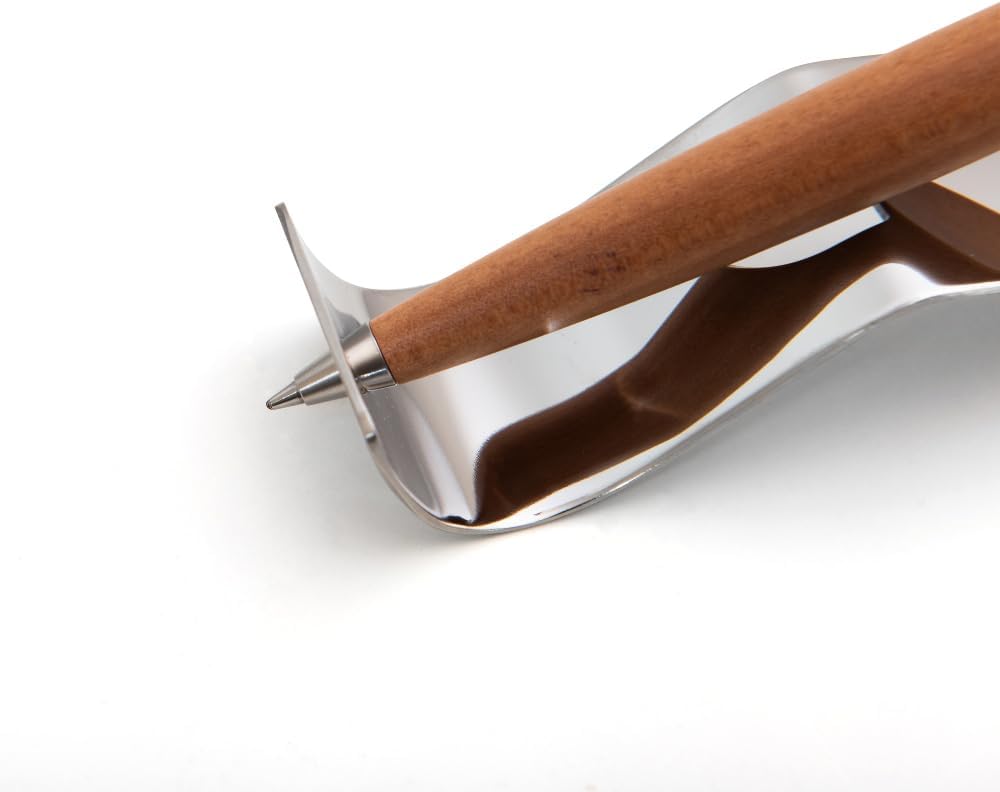 Stilo in legno massello con punta a sfera e basamento in acciaio. A seguito del grande successo della versione in Ethergraf abbiamo creato il modello ad inchiostro. Nei primi anni del Cinquecento Leonardo dedicò attenzione allo studio del volo e al progetto di una macchina volante. Pensò di produrre un trattato sul volo diviso in quattro capitoli, che non fu mai completato ma, nei primi mesi del 1505, scrisse parte del Codice sul volo degli uccelli, conservato presso la Biblioteca Reale di Torino, nel quale si proponeva di comprendere il segreto del volo. La riflessione su questi testi lasciati da Leonardo ha portato alla creazione di Piuma, uno strumento da scrittura realizzato completamente in legno, dalla forma dinamica, che rimanda alla penna d’oca e agli studi sul volo. Piuma appoggia in costante equilibrio sul suo baricentro grazie al piedistallo in acciaio specchiato attraverso il quale è riflessa la firma speculare del maestro. Punta a sfera Cartuccia inchiostro standard Schmidt S635 (D1) o equivalente Lunghezza 15,5 cm Diametro 6 mm Peso 57 gr Corpo in legno di pero o acero Completa di basamento in acciaio inossidabile Prodotto artigianalmente in Italia