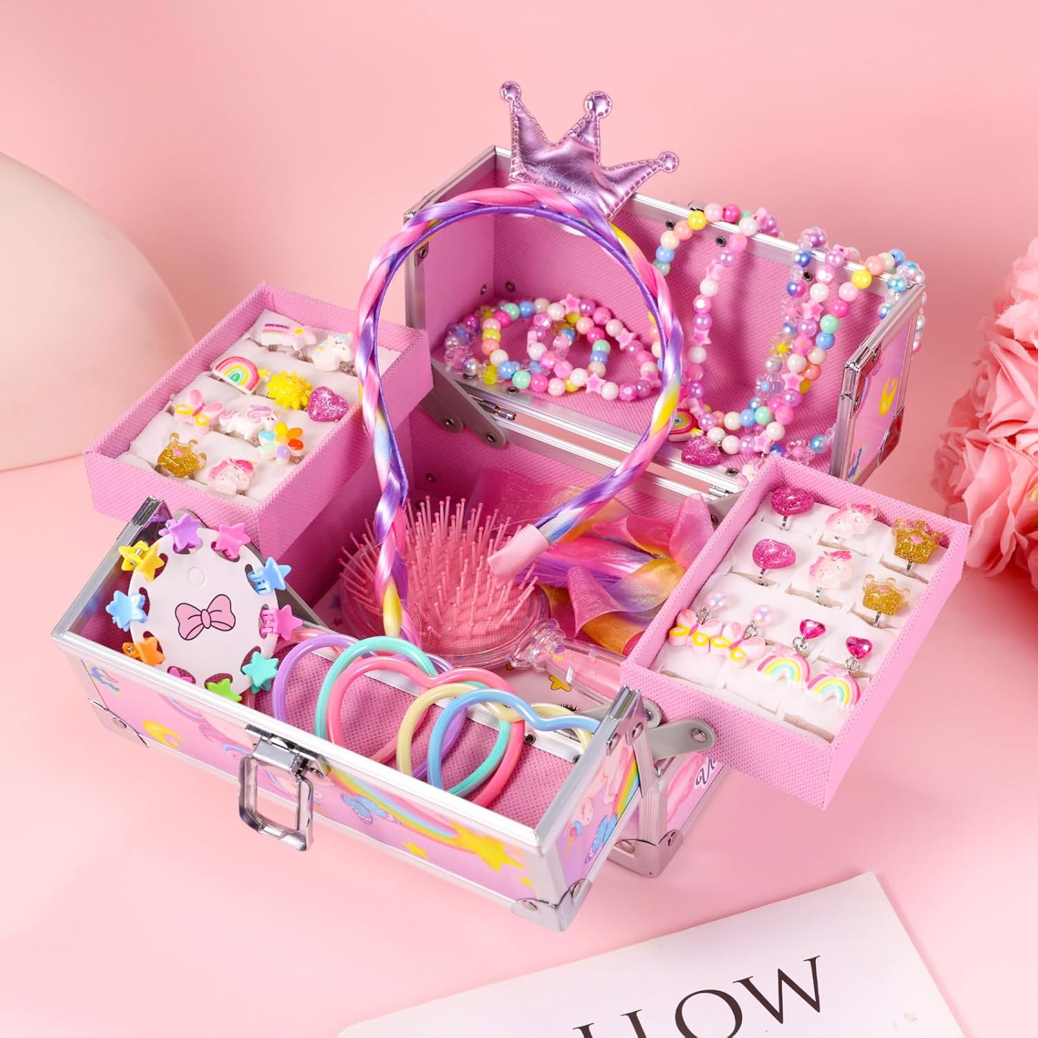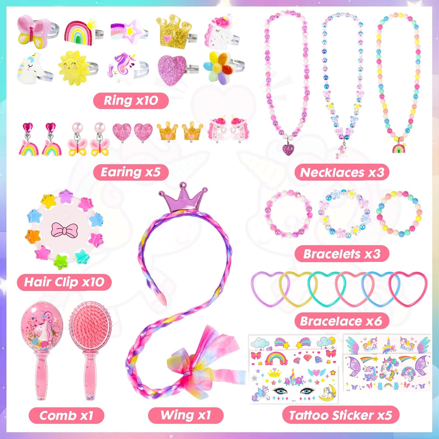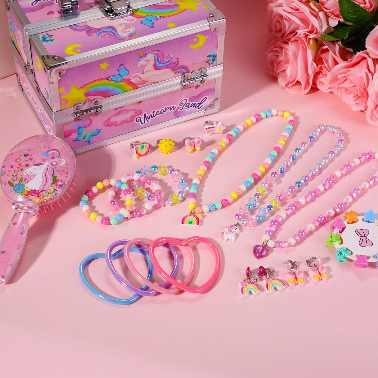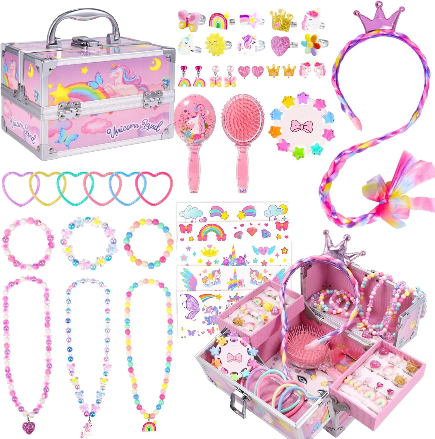 💝【Design per Uniocrn】Il set di gioielli per vestire la principessa Pinksheep è un adorabile scrigno del tesoro, un giocattolo a tema unicorno con un design unico e raffinato, un mix stravagante di rosa pastello e colori vivaci, decorato con magici unicorni, arcobaleni e stelle, dando al regalo un senso di cerimonia. La squisita scatola di unicorno è un tesoro che ogni bambino desidera e i ricchi accessori possono soddisfare tutte le sue esigenze di personalizzazione. Oltre alla moda, possono anche sentire bellissime benedizioni 🎉 【Nella confezione】 Confezione da 45 giocattoli di unicorno gioielli per ragazze che soddisfano tutte le fantasie della tua bambina. Include 1 confezione di portagioie in alluminio con unicorno, 10 anelli di gioielli, 10 fermagli per capelli con caramelle, 6 pezzi di camicia a cuore, 5 paia di clip per le orecchie, 5 adesivi per il viso, 3 set di collane e braccialetti con unicorno arcobaleno, 1 parrucca con corona, 1 pettine. Ogni prodotto è di alta qualità e si rifiuta di riempire la folla con prodotti economici 🦄 【Decora un portagioie unico con unicorno】 Questo simpatico portagioie con unicorno misura 5,9 pollici di lunghezza x 7,8 pollici di larghezza x 9,8 pollici di altezza, alluminio di grado A resistente e robusto su tutti i telai e una struttura di alta qualità per una maggiore durata e protezione, morbida maniglia antiscivolo per afferrare la custodia e partire. La superficie impermeabile rende questa scatola per cosmetici un'eccellente protezione per i cosmetici da esterno. Lo stoccaggio multistrato è pulito e ordinato, con spazio sufficiente per riporre kit per realizzare fasce per capelli, fermagli per orecchie, anulari, collane, orecchini, ecc., può facilmente riporre i gioielli delle bambine. 🎀 【Set di gioielli sicuri】 PinkSheep è sempre stata impegnata a fornire prodotti di alta qualità, testati secondo gli standard US CPSIA e ASTM per bambini dai 3 anni in su nipote, figlie, nipote, sorella, bambini dai 4-6 ai 5-7 anni Perfetto per feste per ragazze, feste in maschera, regali di compleanno, regali di Halloween, regali di Natale, attività familiari.