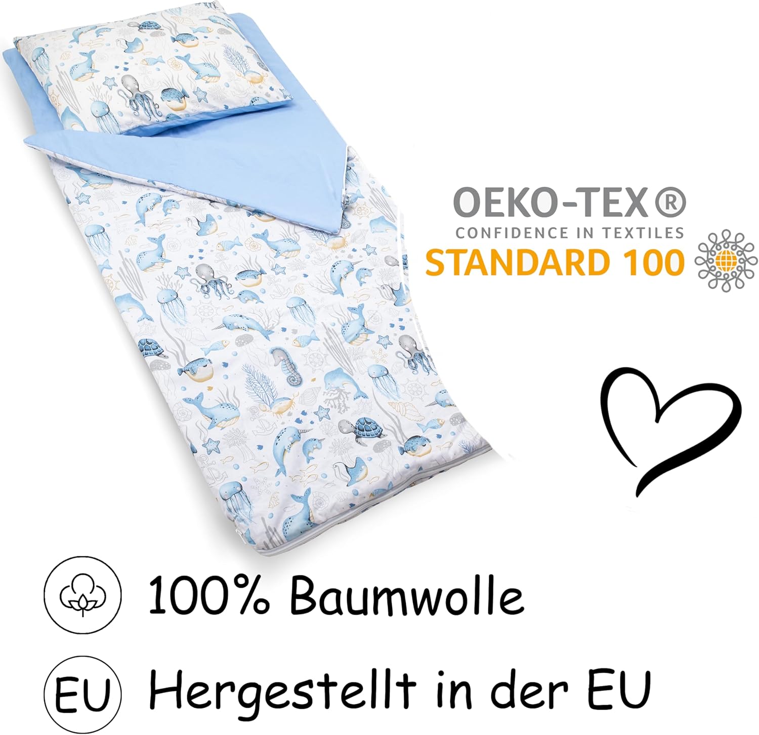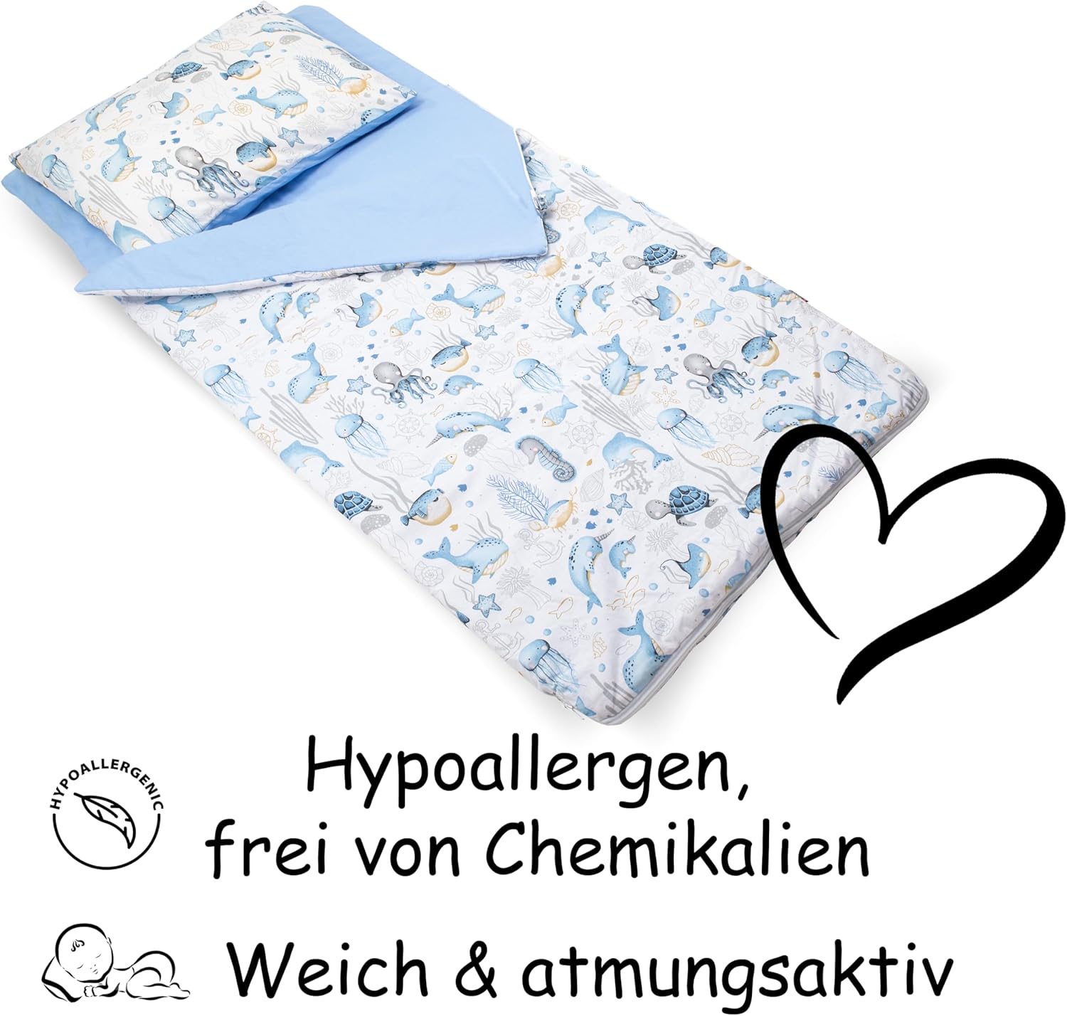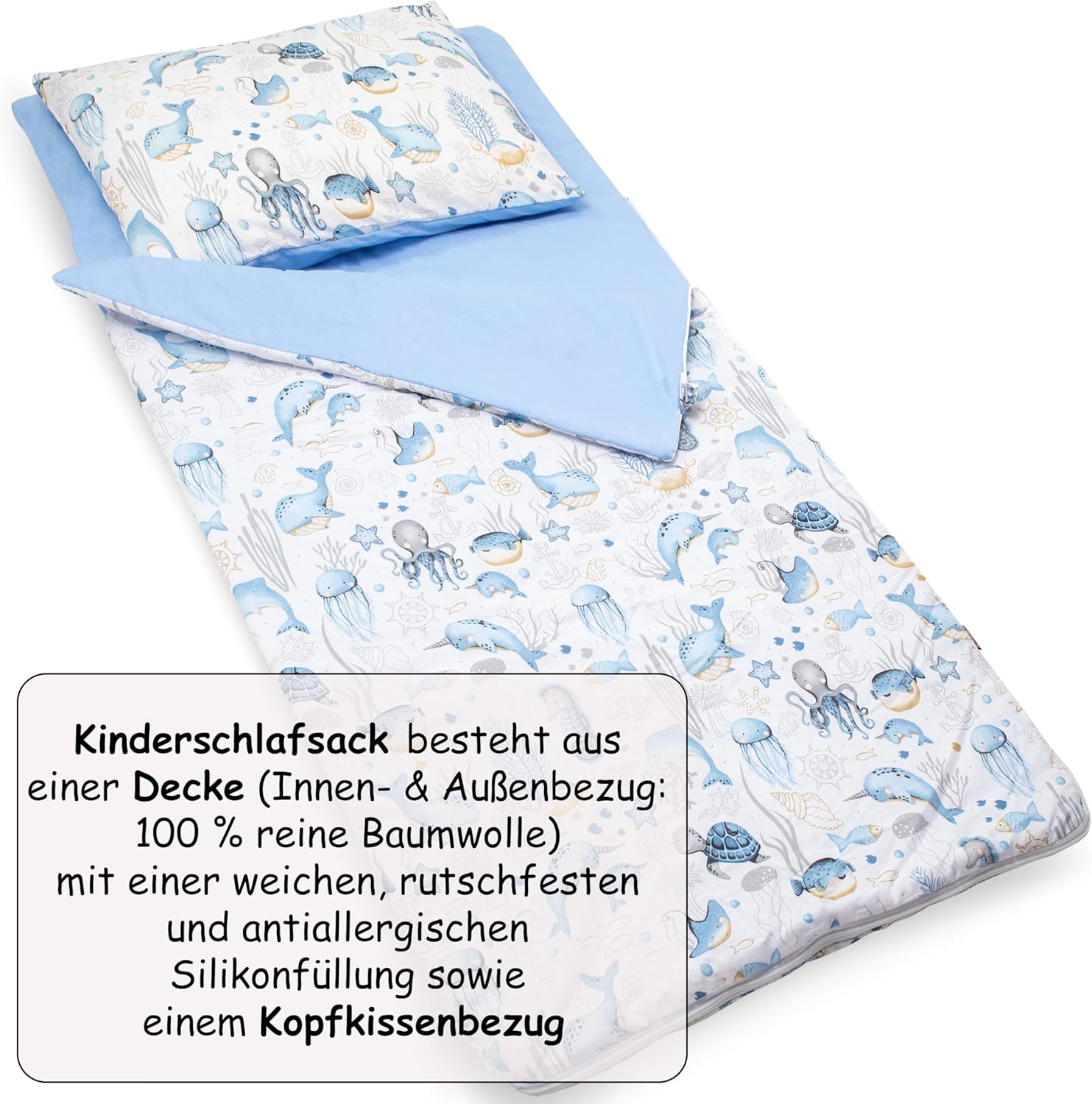 Pratico e piacevole: il nostro sacco nanna per bambini di alta qualità è composto da una coperta (rivestimento interno ed esterno: 100% puro cotone) con imbottitura in silicone morbido, antiscivolo e anallergico, e una federa per cuscino. Il sacco a pelo è dotato di una cerniera a due vie con un blocco automatico e un garage con zip. Per un sonno riposante in ogni stagione. ✅ Dimensioni e contenuto della confezione: sacco nanna 75 x 140 cm + 1 federa 40 x 60 cm + sacchetto. I nostri sacchi a pelo sono prodotti in Europa. Testato: i nostri sacchi a pelo sono testati secondo lo standard Öko-Tex 100 per la presenza di sostanze nocive. Ciò significa che sono dimostrati delicati sulla pelle e quindi adatti anche per chi soffre di allergie. Istruzioni per il lavaggio: lavabile a 40 °C, non candeggiare, adatto all'asciugatrice, stirare a temperatura media, non lavare a secco. Si prega di lavare separatamente prima del primo utilizzo. Attenzione: Il colore può variare leggermente a seconda della luce mostrata nelle foto (naturale/artificiale), del lotto di materiale o delle impostazioni del monitor.