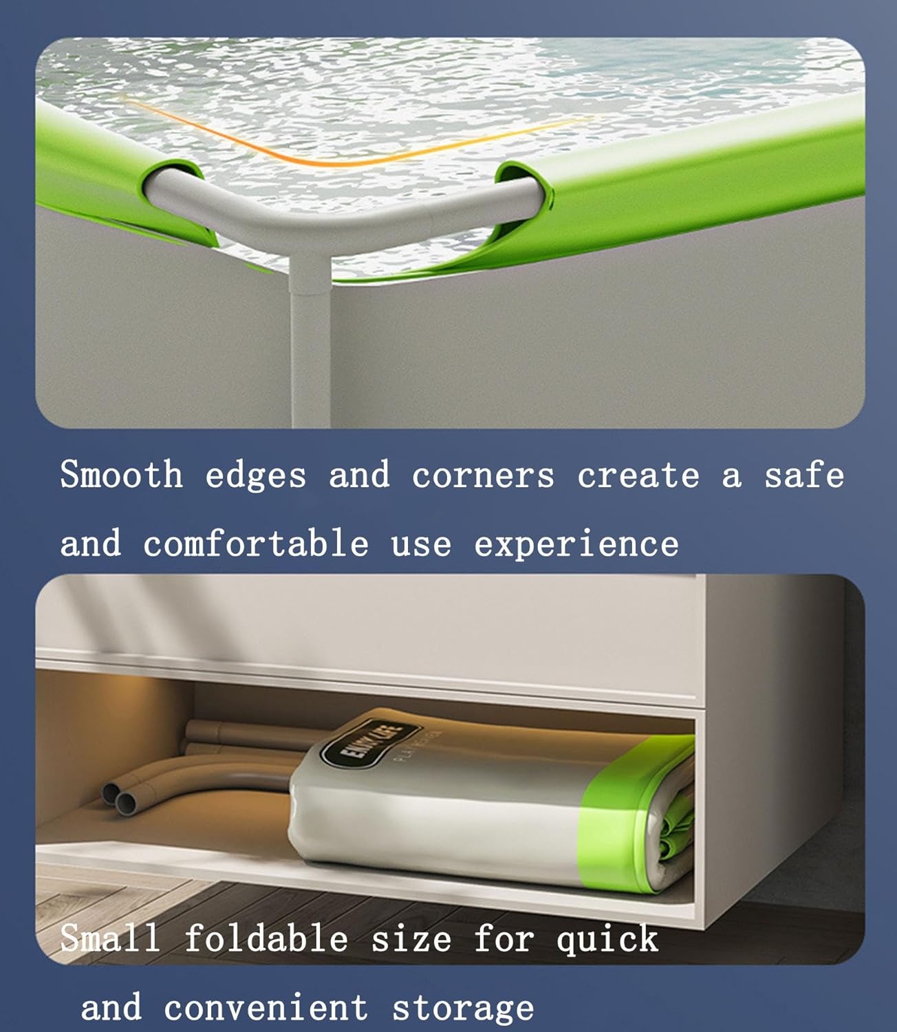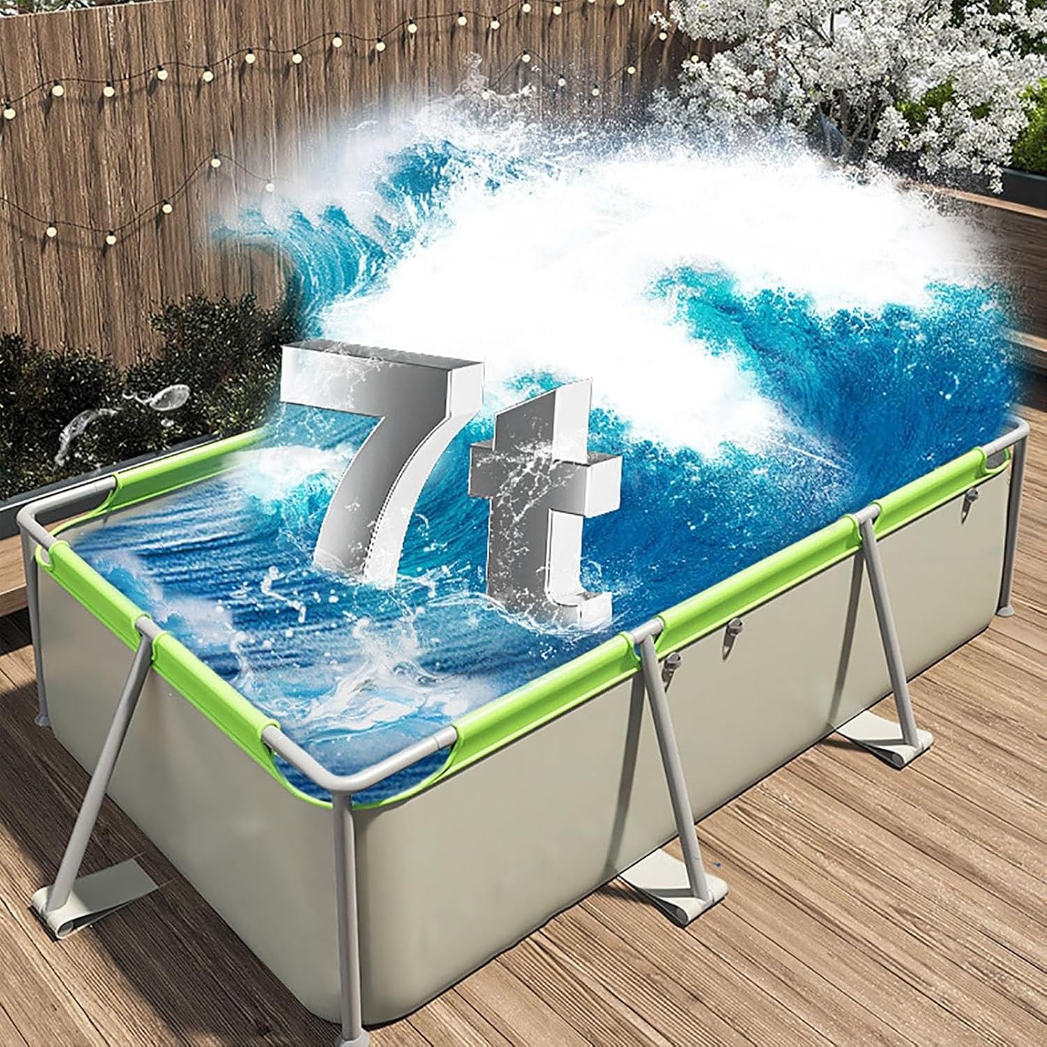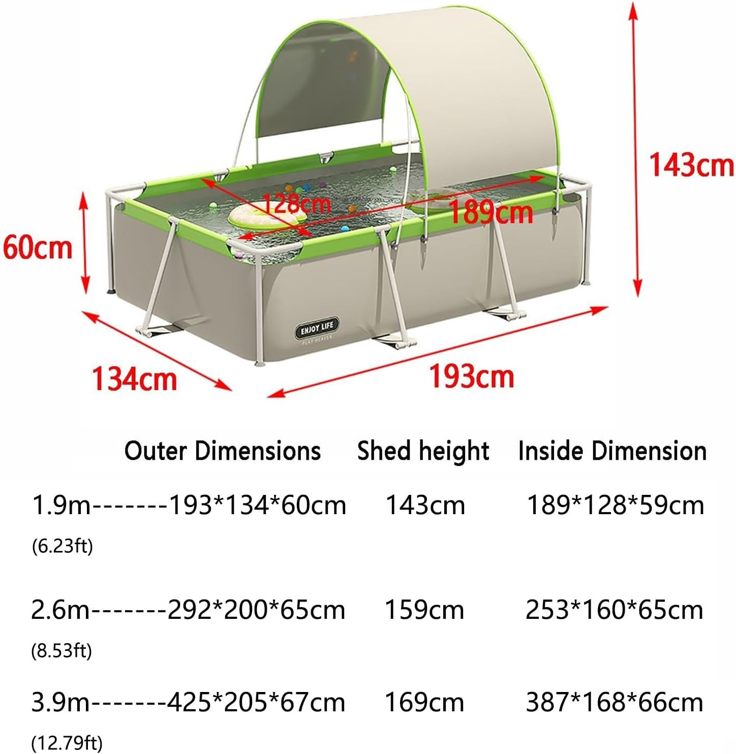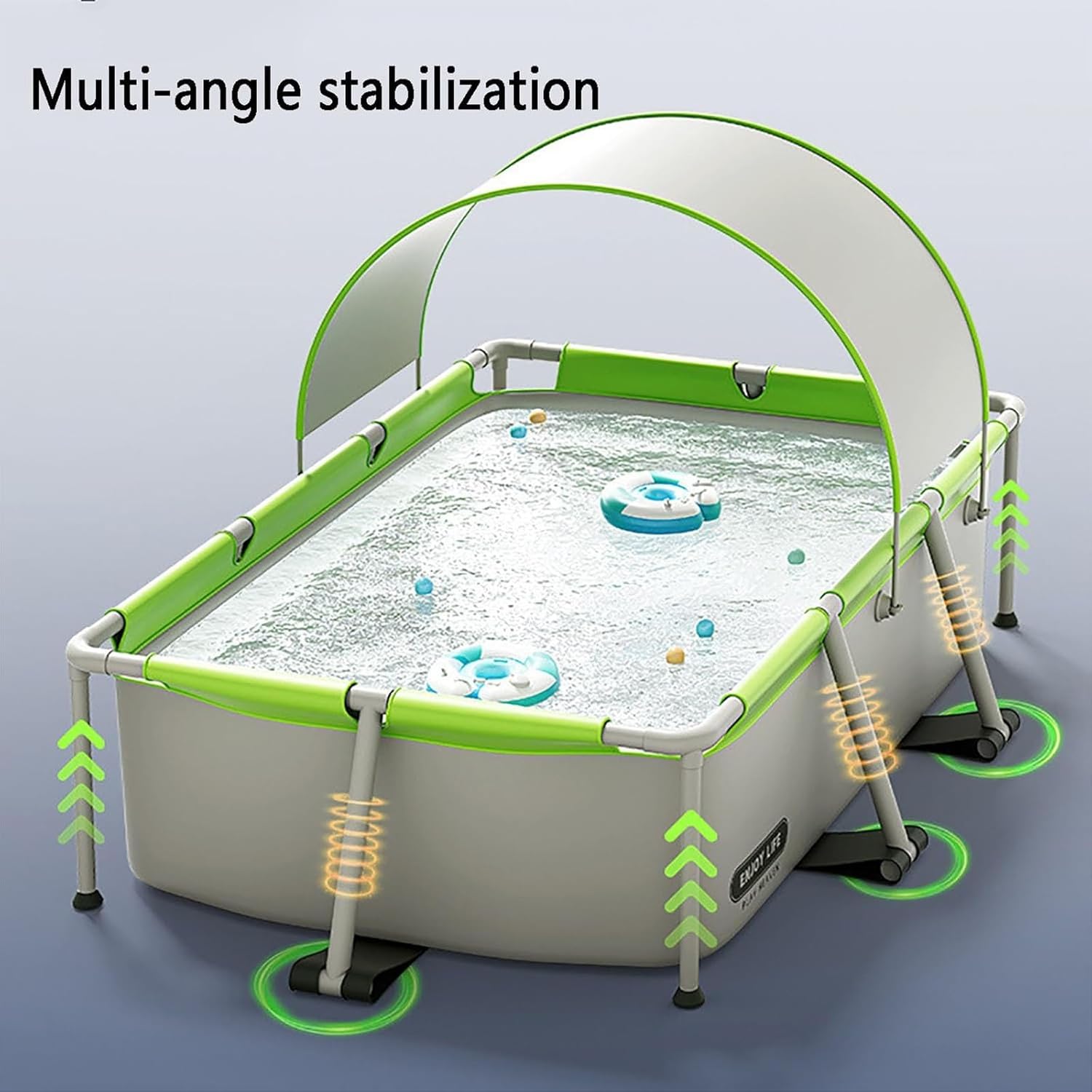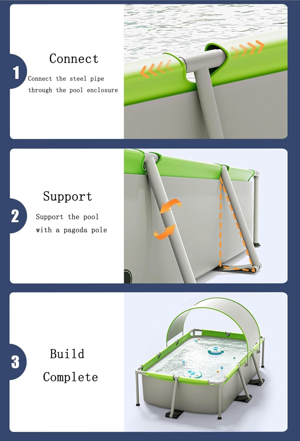 Piscina gonfiabile per adulti di grandi dimensioni con tettoia ombreggiante, ideale per giocare a casa, ideale per rilassarsi, prendere il sole, galleggiare e divertirsi. Non c'è bisogno di preoccuparsi di abbronzarsi durante le calde giornate estive; (Nota: ≥50%, l'area d'ombra varia a seconda delle dimensioni della piscina, si prega di prevalere in natura) Contenitore pieghevole, posizionamento flessibile, risparmio di spazio, consiglio d'uso: controllare l'area sotto e intorno alla piscina per verificare la presenza di oggetti appuntiti e/o detriti che potrebbero causare forature. Piscina con telaio, scheletro in tubo d'acciaio rinforzato, 3 strati di PVC, resistente, connessione + supporto = installazione completa; 6 supporti discreti, surround a 360°, in modo che la piscina sia più stabile Installazione semplice: collegamento + supporto = installazione completa (1. collegare il tubo in acciaio attraverso la zona pranzo; 2. sostenere la piscina con il palo della pagoda; 3. la costruzione è completata) Si consiglia di utilizzare la stessa acqua della piscina per non più di 3 giorni, poiché ci impegniamo a migliorare il vostro senso di benessere e ci auguriamo che la piscina possa rendere felice la vostra famiglia.