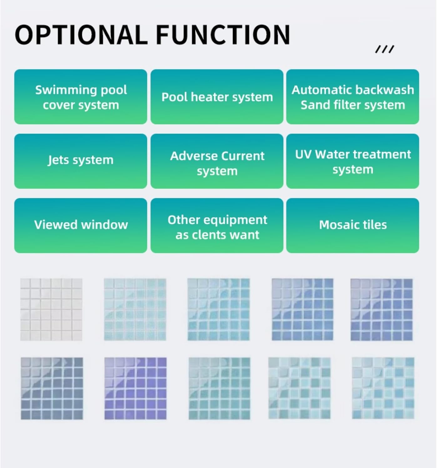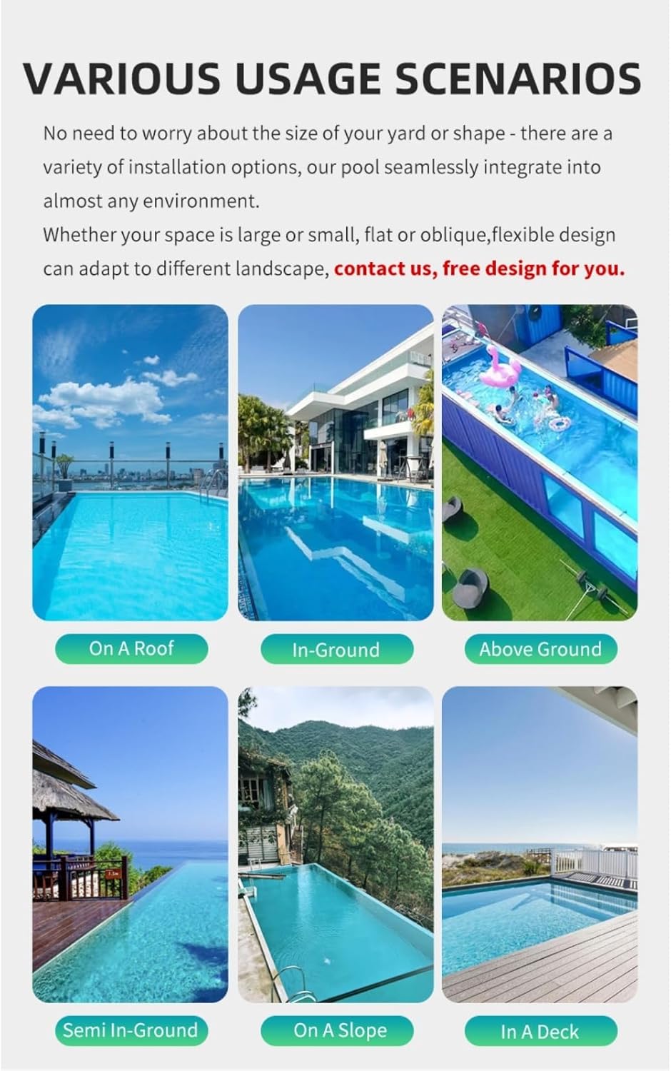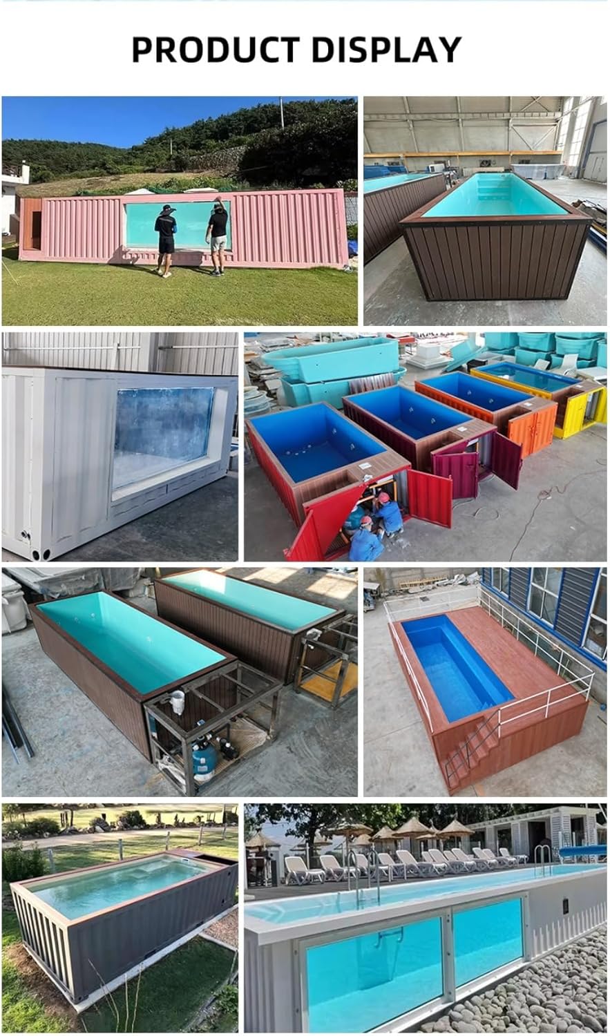 Opzioni personalizzabili: questo prodotto è disponibile in diversi modelli. I prezzi indicati sono solo di riferimento. Lasciaci un messaggio o contatta direttamente il produttore tramite +86 15003837827. Ti forniremo informazioni e video più dettagliati in base alle tue esigenze. Design personalizzabile: La struttura modulare del pool di contenitori consente una completa personalizzazione. Dimensioni della piscina, profondità (da poco profonda a 8 piedi), aspetto, funzionalità aggiuntive come filtri, pompe, dispositivi