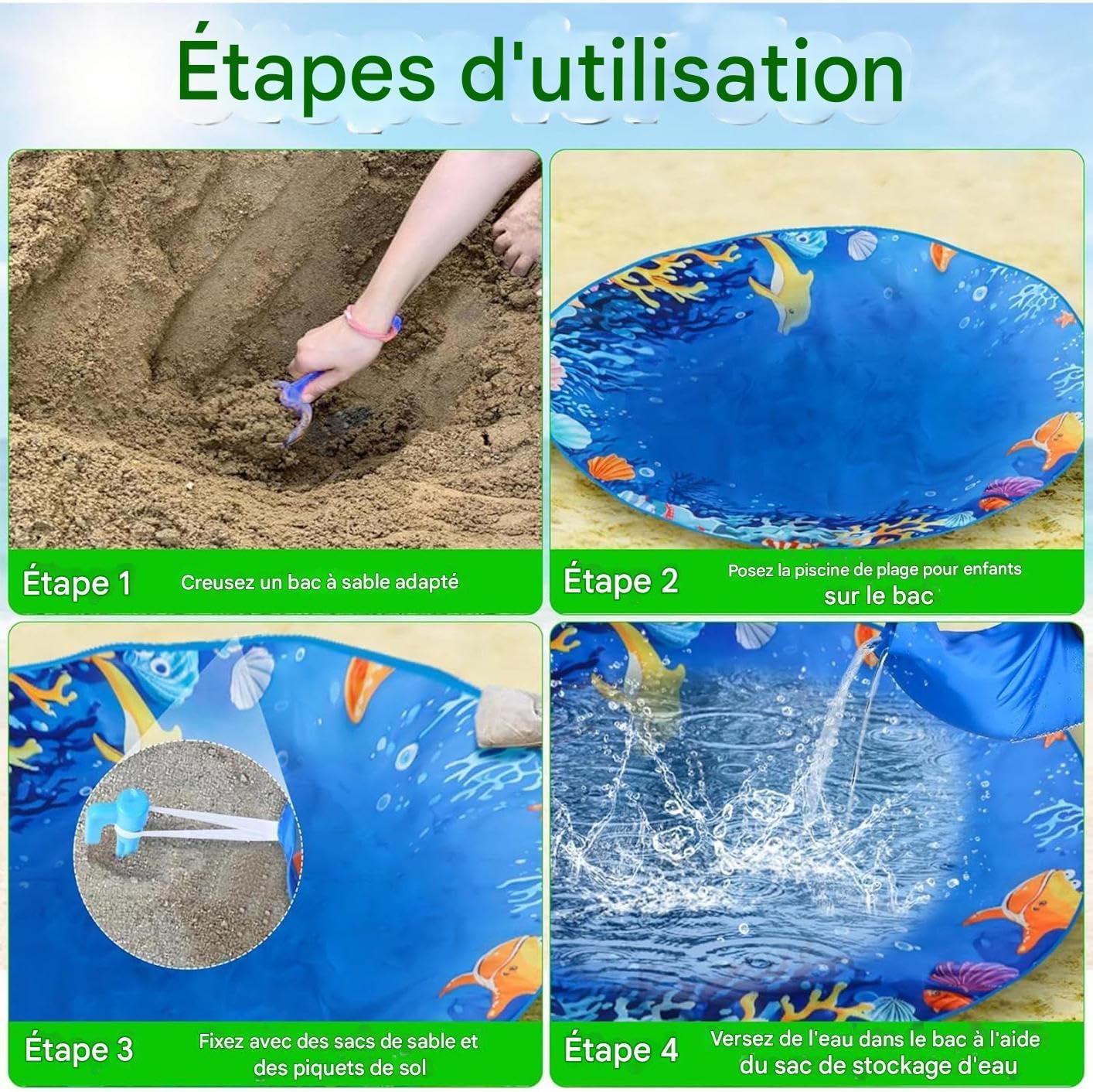 Gioco educativo: i motivi sub stimolano la scoperta e offrono un ambiente di gioco piacevole che rafforza i legami familiari all'aperto. Stabilità garantita: componenti solidi e picchetti inclusi per un montaggio stabile senza attrezzi aggiuntivi. Riempimento diretto dell'acqua e borsa per il trasporto per una portabilità senza sforzo durante gli spostamenti. Comfort Outdoor Ridefinito: design innovativo 2 in 1 con tappetino anti-sabbia integrato e piscina poco profonda, creando uno spazio di gioco sicuro per la felicità dei bambini all'aperto Nessun gonfiaggio: questa pratica piscina per bambini non richiede alcuna inflazione, eliminando il fastidio e i rischi legati alle perdite d'aria, e offre uno spazio di gioco d'acqua stabile e sicuro all'aperto grazie al suo riempimento di sabbia. Costruzione Robusto: innovativo rivestimento impermeabile che impedisce la penetrazione della sabbia. Garantisce una manutenzione minima e una pulizia prolungata per i giochi