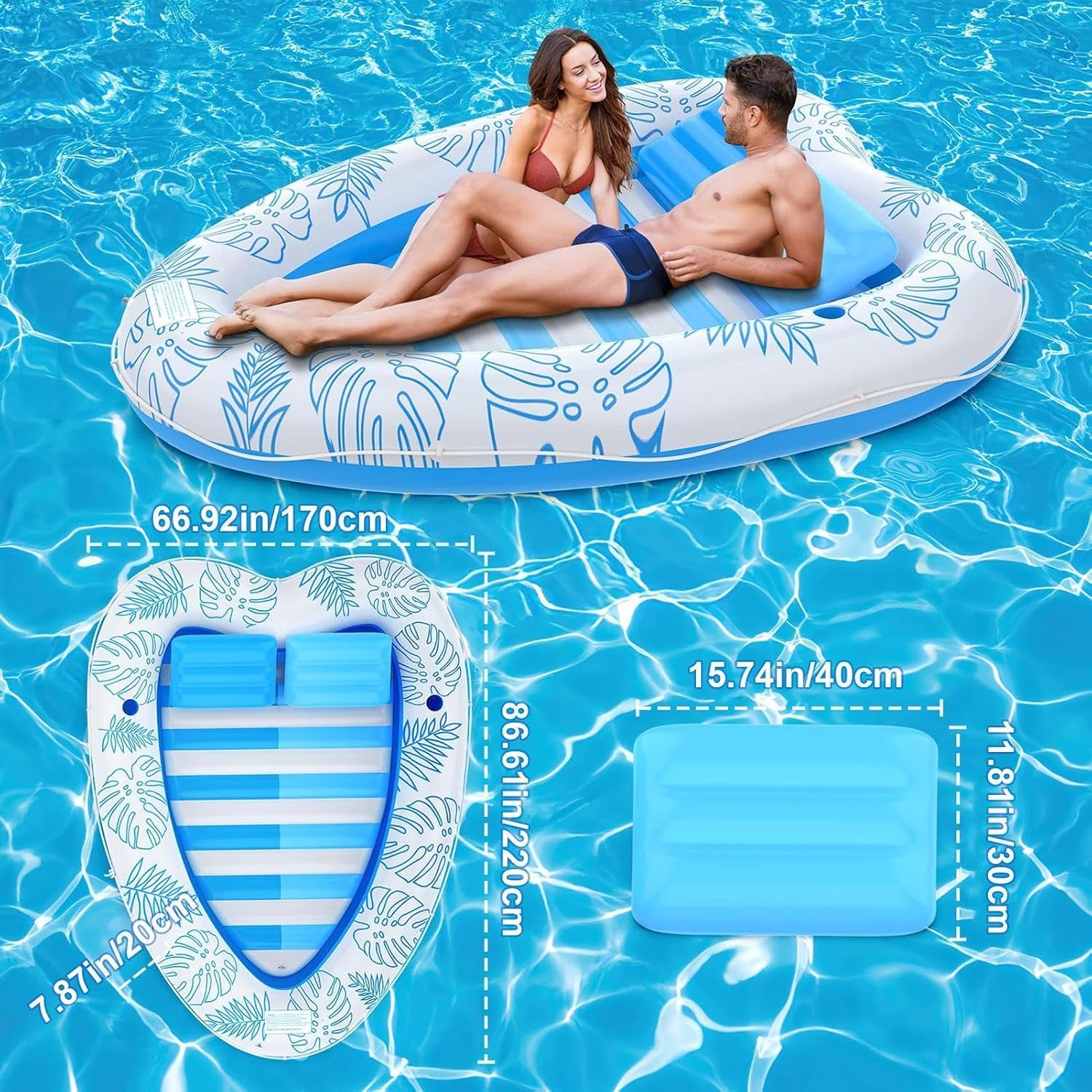 【Ultimate rilassamento per le coppie】: sperimentare un comfort senza pari con il nostro lettino float gonfiabile progettato appositamente per le coppie. Questo grande galleggiante, che misura 86,61 x 66,93 x 7,87 pollici, offre uno spazio perfetto per rilassarsi insieme durante le feste estive in spiaggia, lago o piscina. 【Comodi porta bevande】: questo rilassante floatie include due grandi portabicchieri, permettendoti di sorseggiare le tue bevande preferite mentre ti godi il sole. I comodi cuscini e il supporto aggiuntivo dai cuscini di comfort mobili lo rendono una scelta ideale per le giornate estive trascorse dall'acqua. 【Portatile e facile da gonfiare】: i nostri galleggianti da piscina per gli adulti sono progettati per comodità u2014asy per gonfiare e sgonfiare, rendendoli portatili per il viaggio. Goditi il tuo lettino gonfiabile in qualsiasi momento, sia che si tratti di una piscina da cortile, una gita in spiaggia o una vacanza sul lago. 【Design durevole e confortevole】: realizzato in PVC ispessito e con filato spesso 0,25 mm, i nostri giocattoli a zattera mobile assicurano una durata pur essendo resistente ai raggi UV. Con una capacità di carico di oltre 400 libbre, puoi goderti la rilassata senza preoccupazioni su questo lettino gonfiabile tutto il giorno. 【Massimizza il divertimento dell'acqua】: migliora la tua esperienza estiva con le nostre comode zattere doppie. Collega più galleggianti o mazzi senza sforzo per un'esperienza completa in piscina, trasformando qualsiasi incontro in ultima festa delle amache!