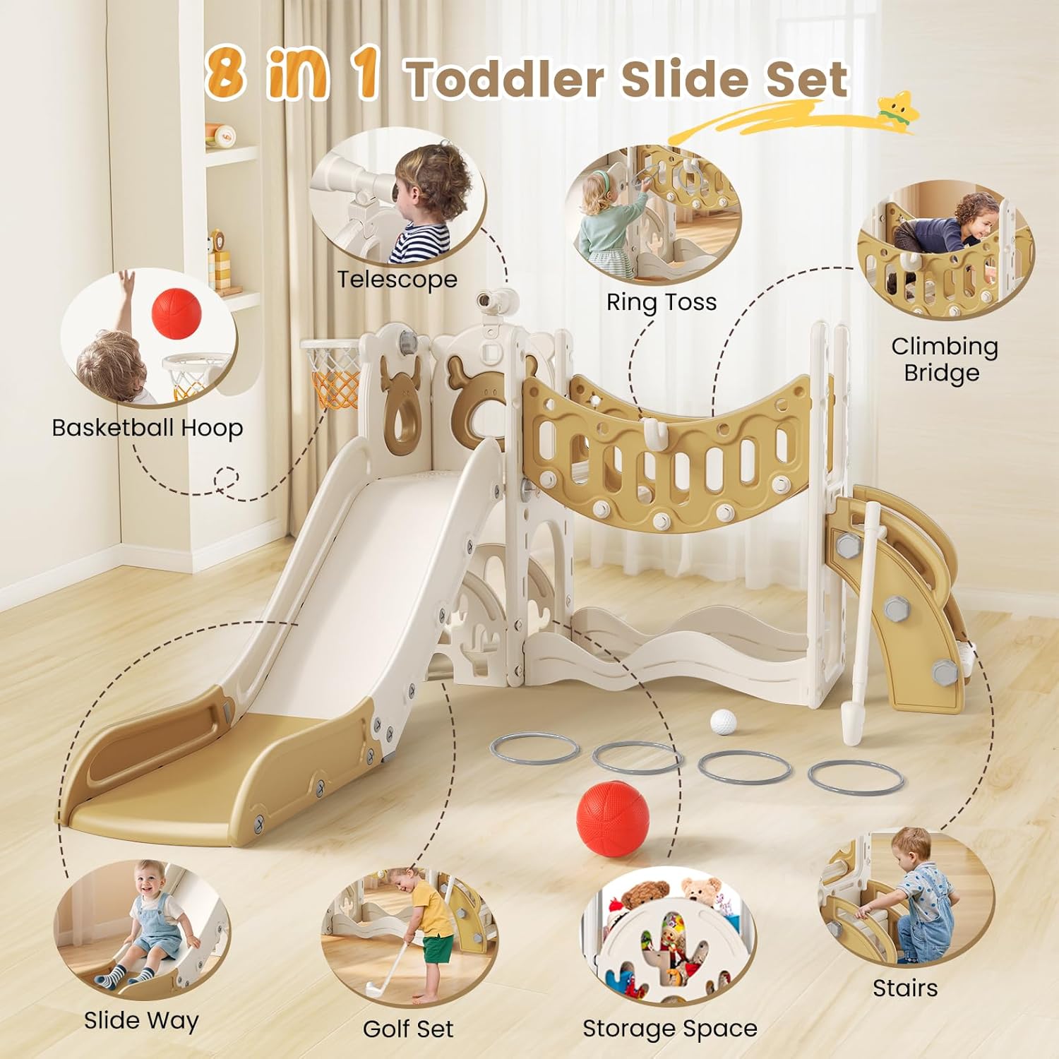 Sicurezza testata: Realizzato in HDPE impermeabile, spesso e di alta qualità, questo set di scivoli per bambini è stato accuratamente testato per la sicurezza ed è conforme agli standard UE e del Regno Unito. I piccoli esploratori possono giocare in tutta sicurezza! Tutto in uno: Questo versatile set di scivoli per bambini include diverse aree attività: una scalata, uno scivolo, un canestro da basket, un telescopio e un tunnel per gattonare. Progettato per coinvolgere e stimolare, il nostro set di scivoli per bambini è perfetto per sviluppare abilità fisiche, cognitive e sociali in un ambiente sicuro e divertente. Scivolo esteso e sicuro: Il nostro scivolo è dotato di una zona di protezione estesa nella parte inferiore per una maggiore sicurezza durante lo scivolamento. Le barre laterali rialzate su entrambi i lati garantiscono ai bambini di sperimentare velocità ed emozioni in tutta sicurezza. Superficie liscia e adatta ai bambini: Il nostro scivolo è progettato per essere adatto ai bambini e presenta una superficie liscia, senza sbavature o altri bordi ruvidi. È il regalo perfetto per i vostri piccoli, offrendo loro un'esperienza di gioco sicura e divertente. Facile da montare: Il nostro kit include tutti gli strumenti di montaggio necessari e viene fornito con istruzioni dettagliate. Contattaci in qualsiasi momento per qualsiasi domanda!