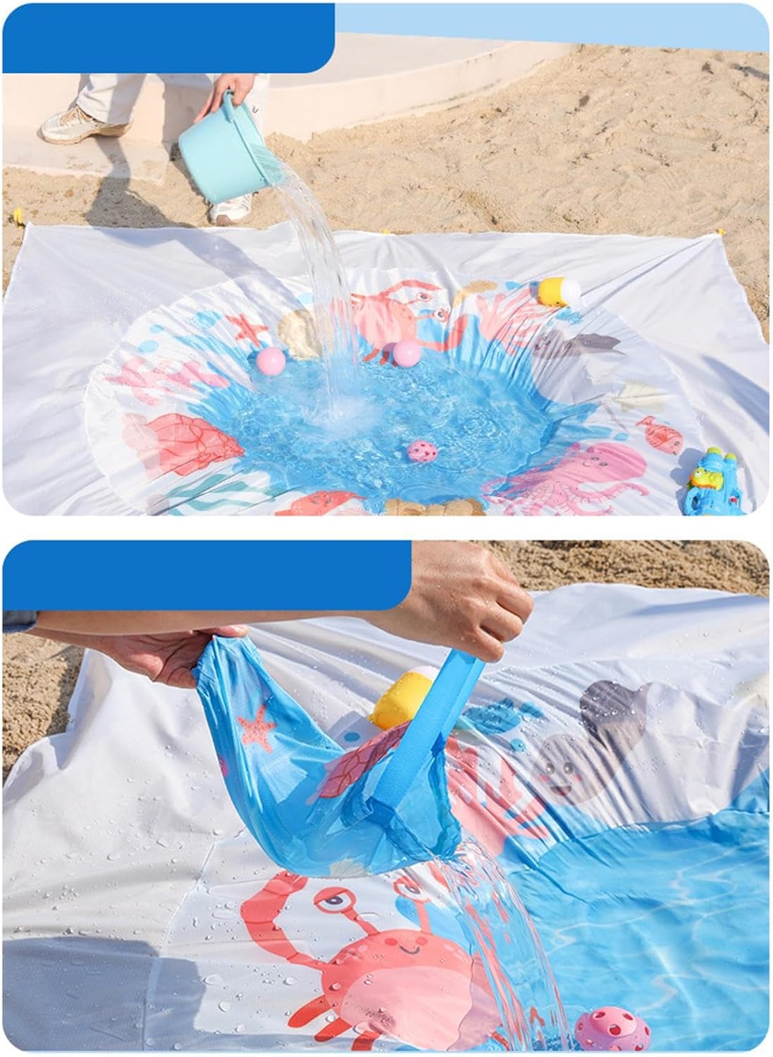Struttura antistabile: Design con ancoraggi rinforzati e cinture resistenti garantisce stabilità su qualsiasi terreno, ideale per attività all'aperto grazie alla resistenza alle raffiche di e adattabilità a superfici irregolari Bordi arrotondati sicuri: Profilo ergonomico senza spigoli assorbe eventuali urti, mentre la speciale struttura contiene la sabbia mantenendo l'acqua pulita per ore di gioco continuativo Gioco multifunzionale: Progettato per adattarsi a diverse capacità d'acqua e spazi, promuove l'interazione familiare e un utilizzo versatile in giardino, spiaggia o cortile Materiale forte: Realizzato in tessuto ad alta densità per offrire resistenza agli strappi e stabilità climatica, abbinato a una protezione UV affidabile, per attività all'aperto prolungate Praticità portatile: Combina design pieghevole compatto e peso leggero per un montaggio immediato, perfetta per avventure all'aperto e viaggi con massima praticità di trasporto grazie alla struttura minimizzata