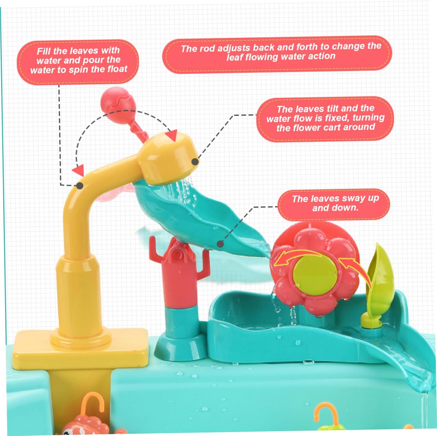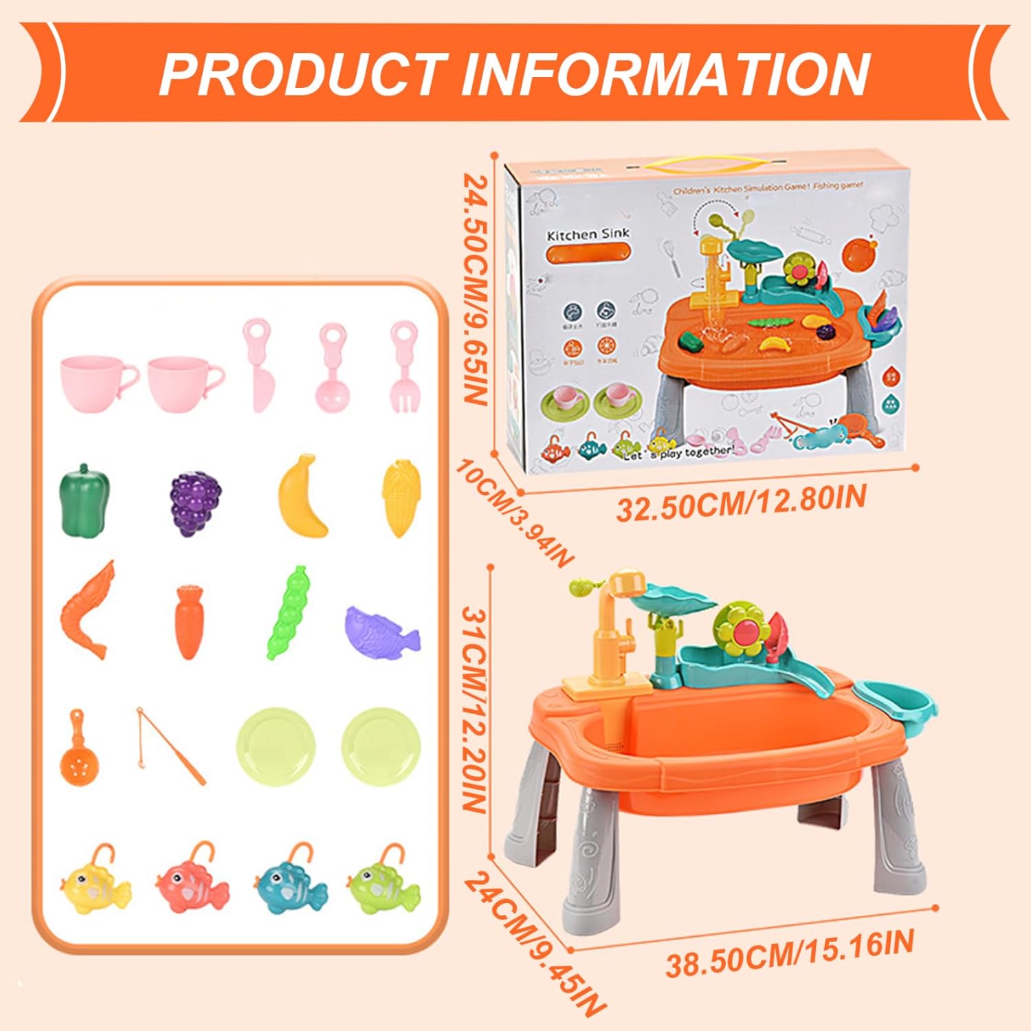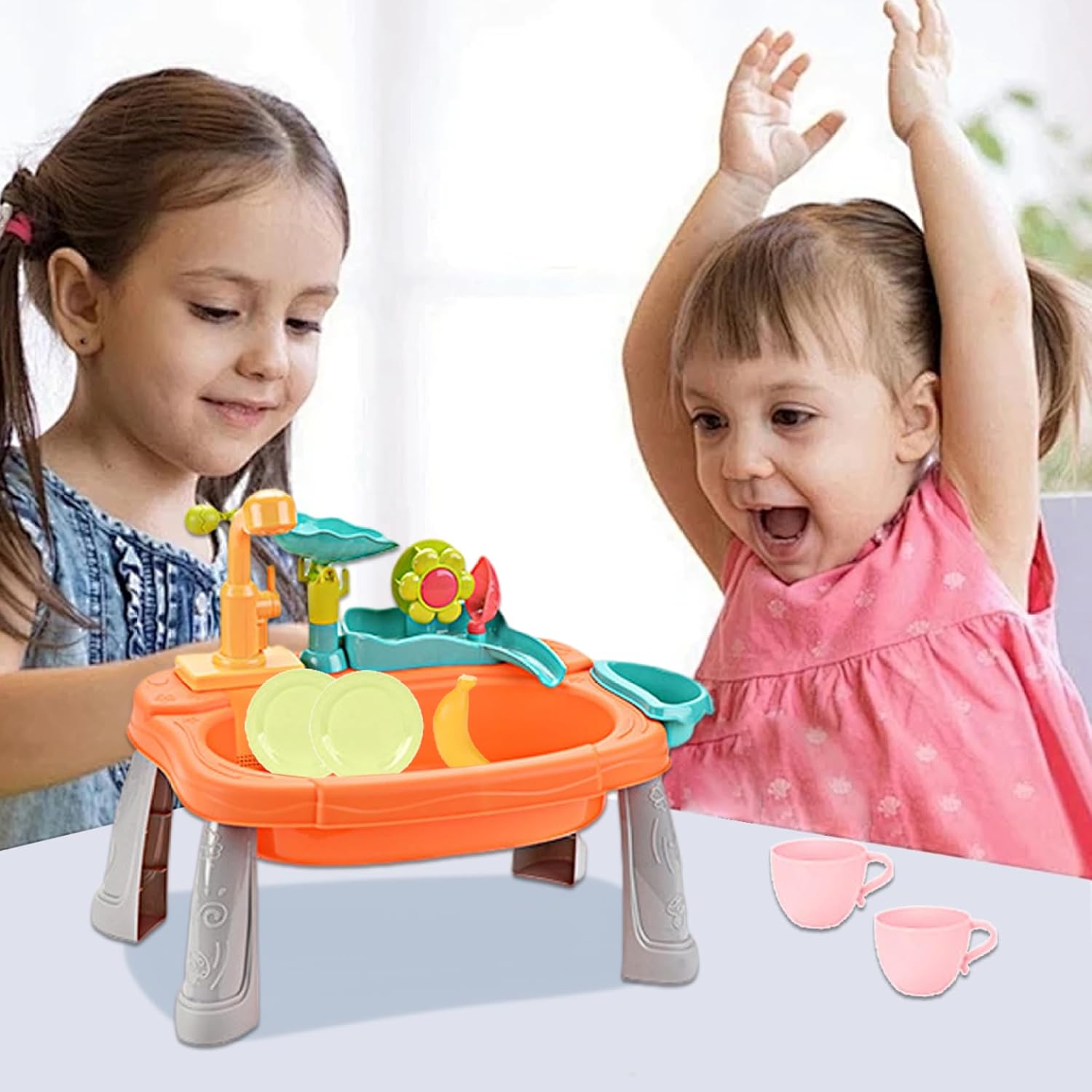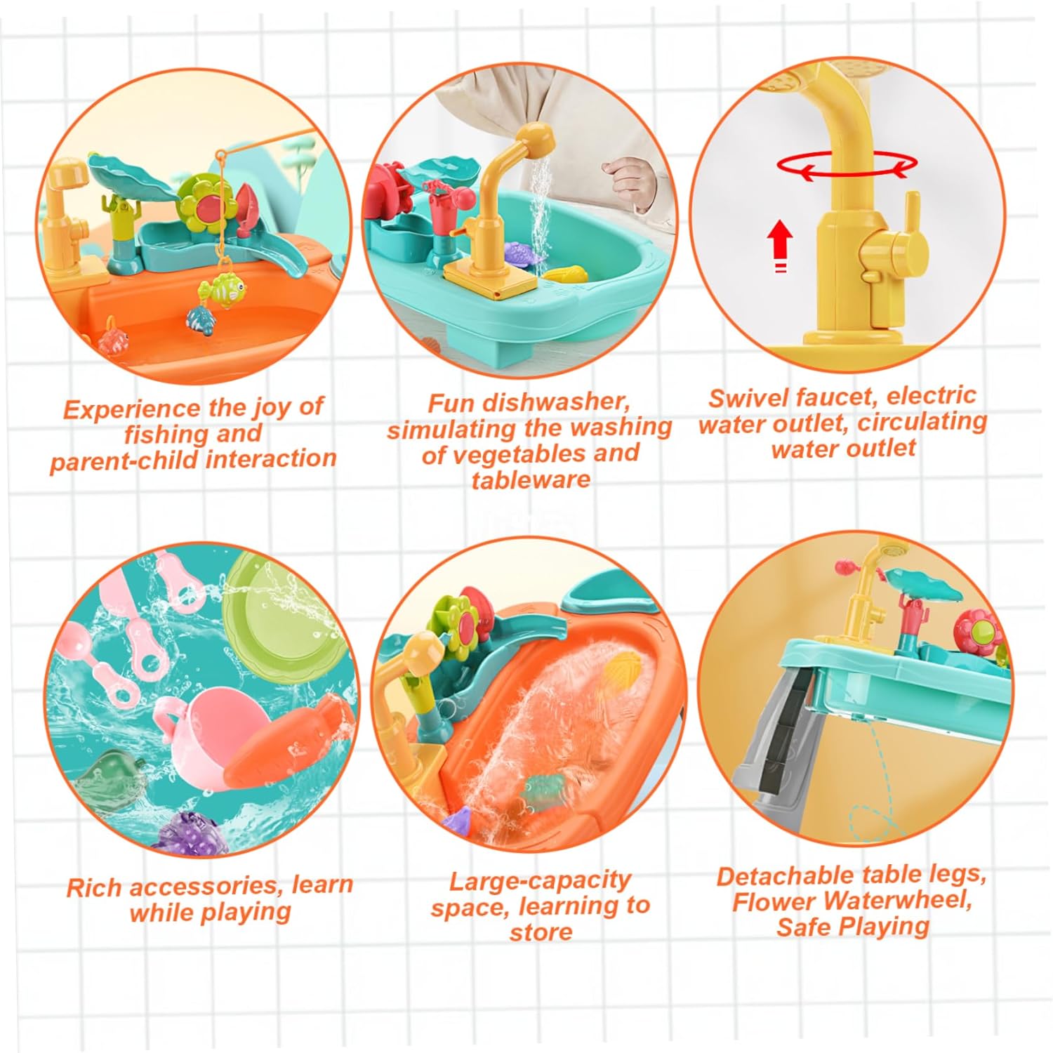 Giochi d'acqua interattivi: progettato con un rubinetto rotante a 180°, questo rubinetto dell'acqua offre giochi d'acqua comodi e pratici che stimolano lo sviluppo sensoriale e le capacità motorie. I bambini possono versare, schizzare e godersi l'acqua corrente in modo sicuro e creativo. Set lavello da gioco: include frutta, verdura, piatti e giocattoli da pesca realistici, offrendo ore di divertimento fantasioso che incoraggia l'interazione sociale e la creatività nei bambini piccoli. Dimensioni perfette per i bambini: l'altezza compatta ma spaziosa del tavolo è ideale per neonati e bambini piccoli, favorendo il gioco indipendente e un facile accesso a tutti i componenti del tavolo, rendendo le impostazioni esterne o interne senza problemi. Materiali sicuri e adatti ai bambini: realizzati con plastica atossica priva di BPA, garantiscono un ambiente sicuro per i più piccoli e possono godersi i giochi d'acqua senza problemi di salute. I bordi arrotondati aggiungono ulteriore sicurezza per le mani dei più piccoli. Design robusto e staccabile: realizzato in plastica di alta qualità, il tavolo ad acqua è dotato di gambe staccabili per riporlo e trasportarlo facilmente, combinando stabilità durante il gioco con praticità di montaggio e pulizia.