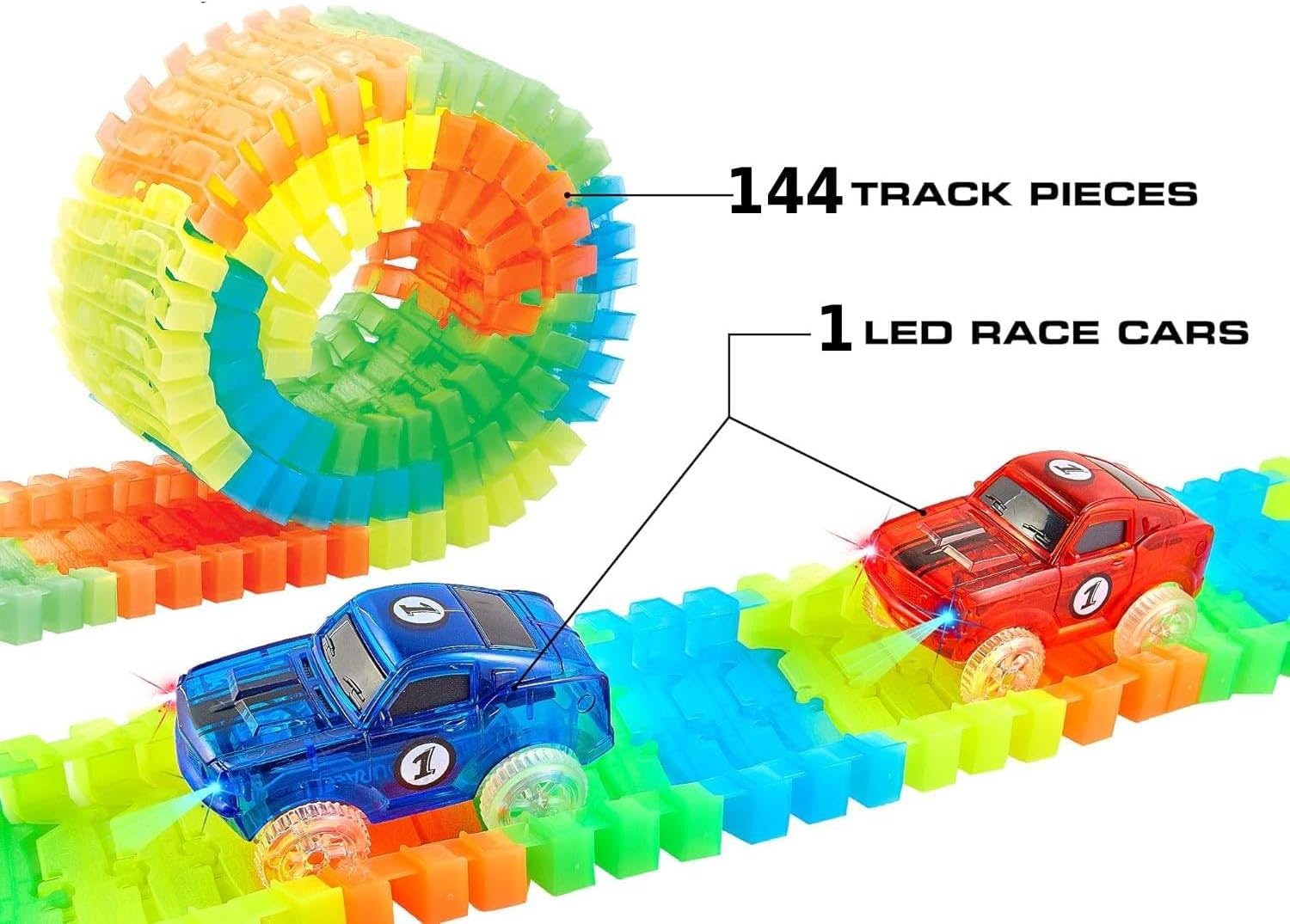 Costruisci una pista lunga 350 cm con loop, curve, sezioni dritte e verticali per infinite combinazioni di gioco. Gioca in condizioni di scarsa illuminazione grazie alle luci dell'auto che esaltano i colori della pista anche al buio. Facile montaggio e smontaggio per creare nuove possibilità di gioco; perfetto per bambini di tutte le età. Auto alimentata da batteria ricaricabile, da posizionare sulla pista per iniziare a giocare. Include 145 pezzi per costruire la pista, un'auto, batteria ricaricabile e cavo di ricarica.