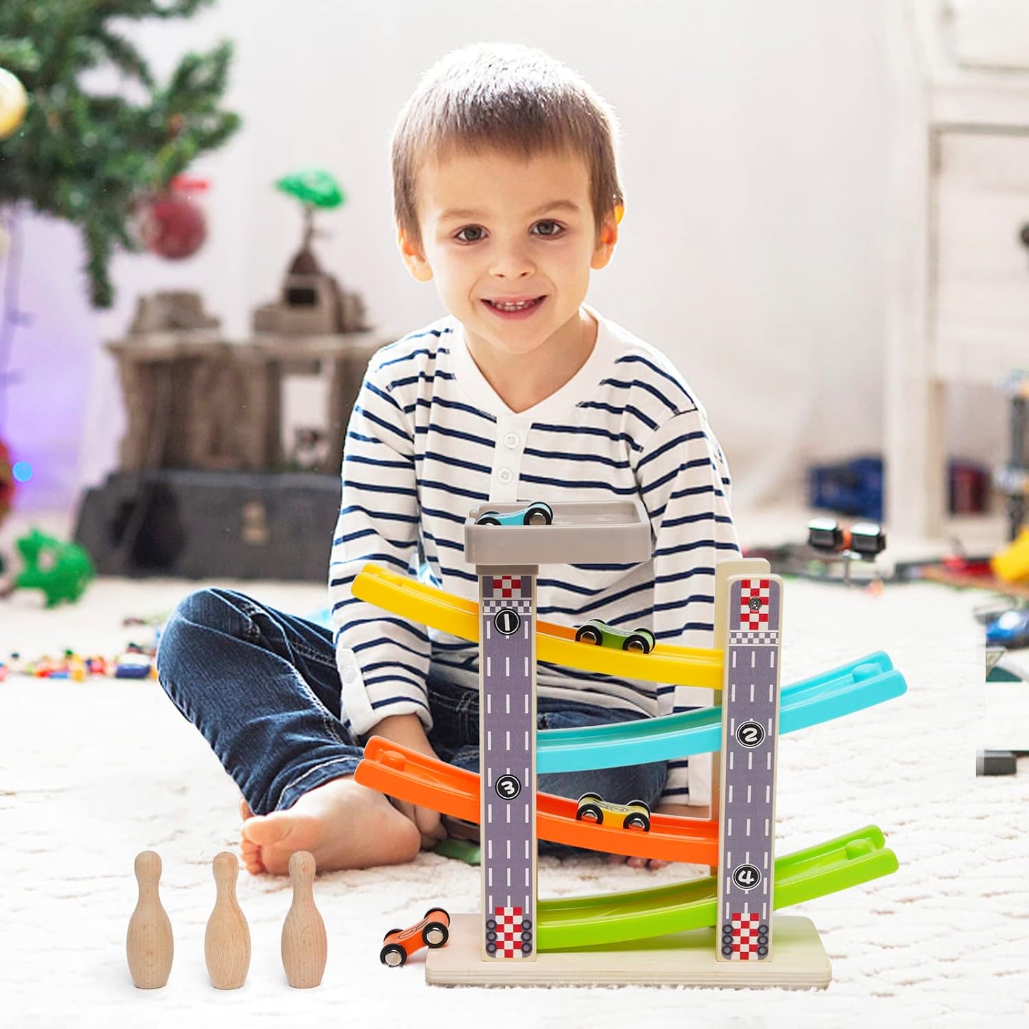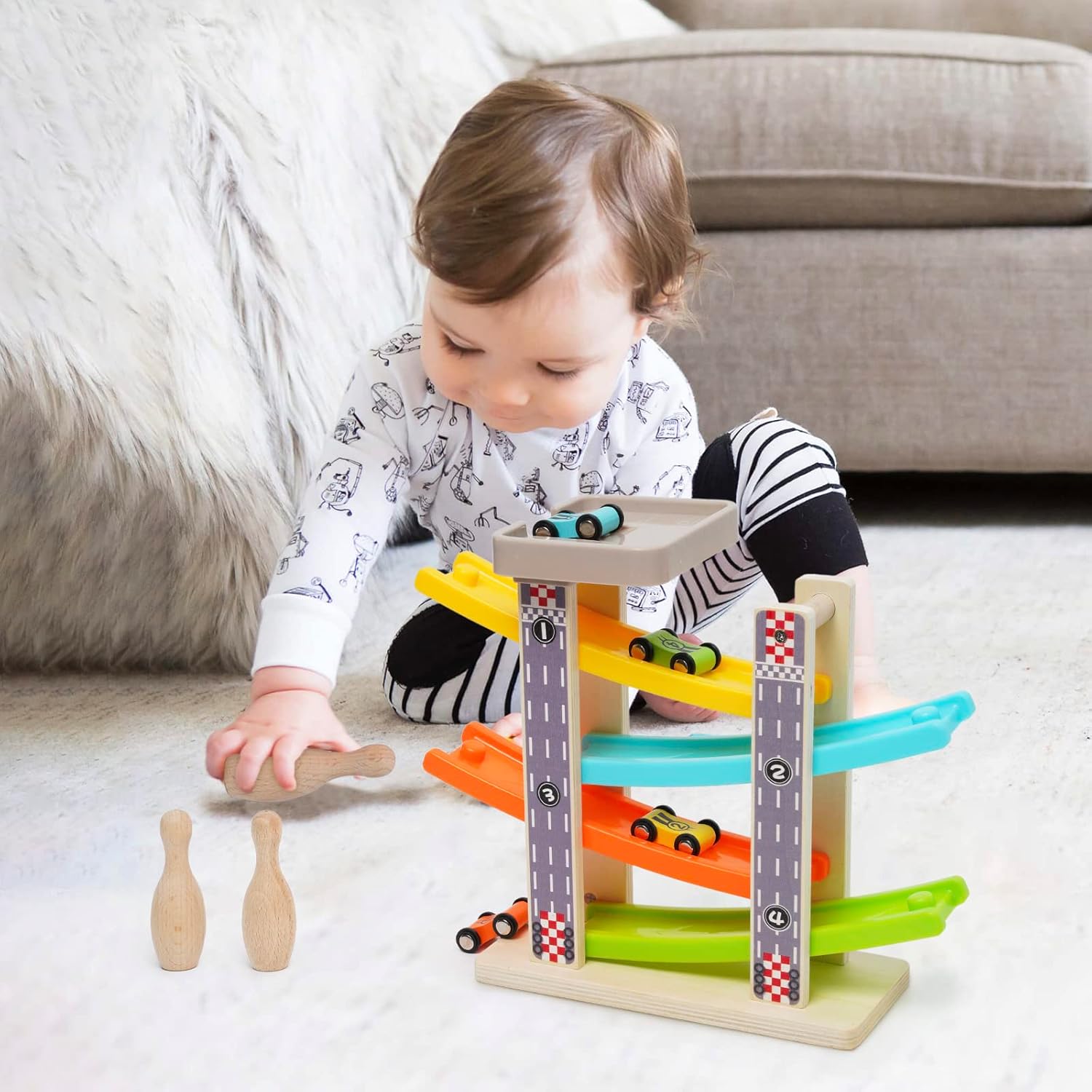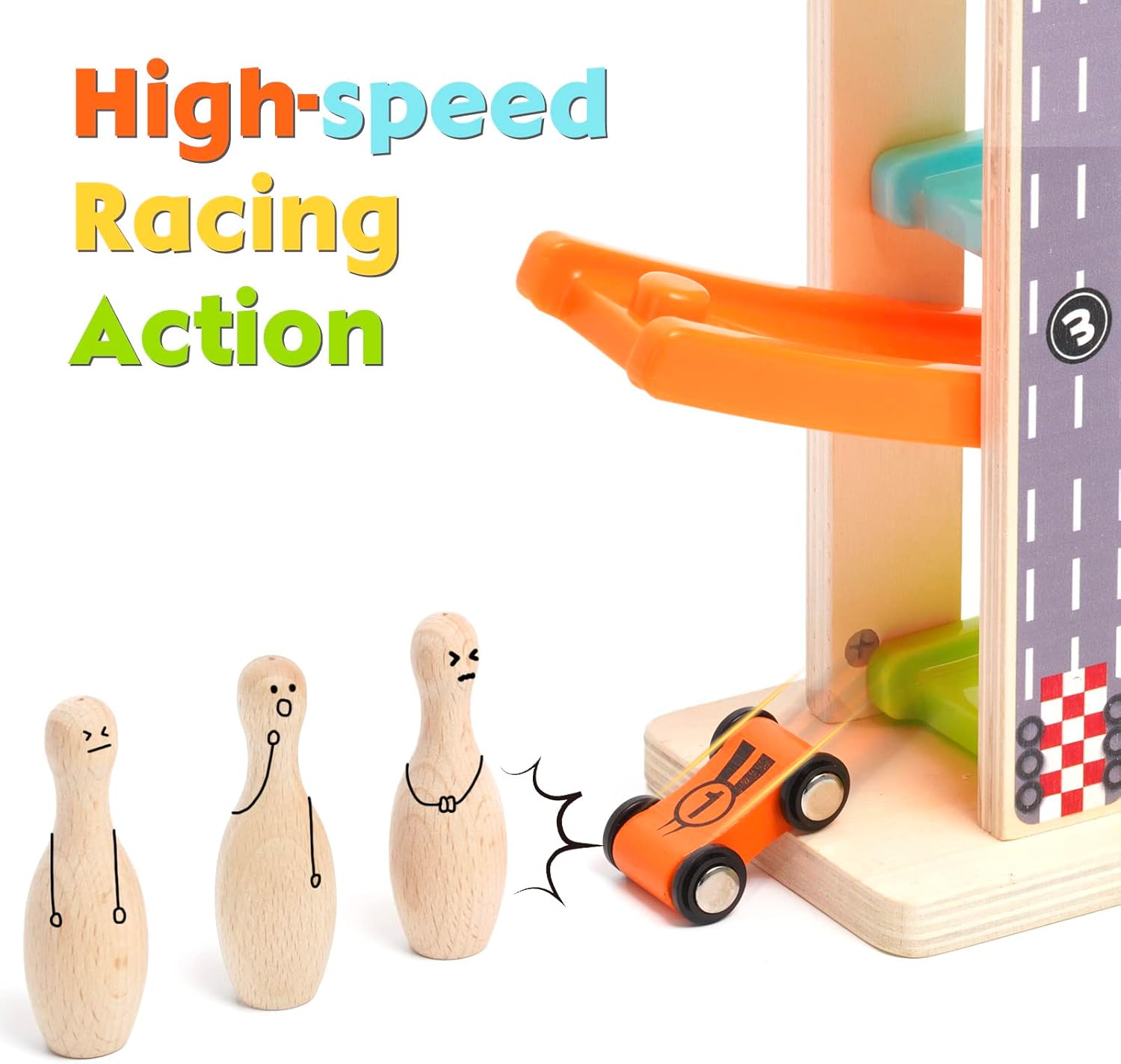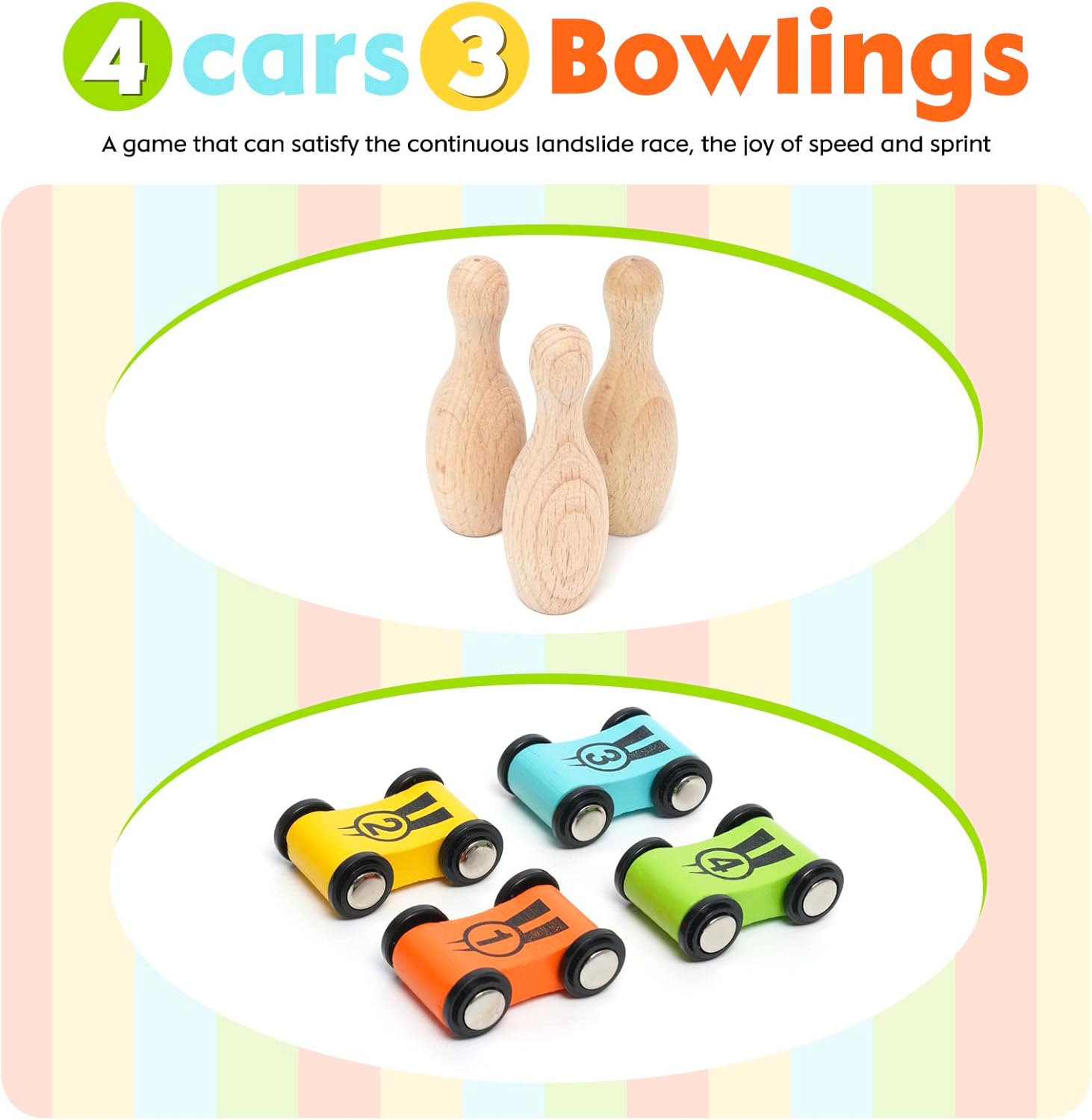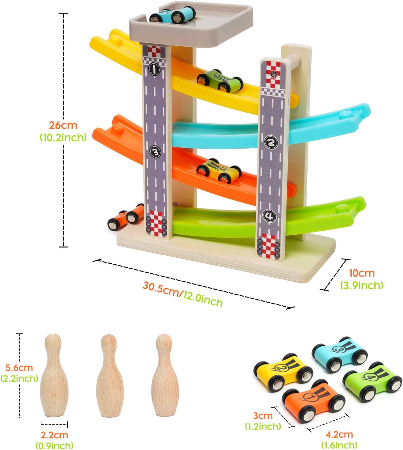 🚗Speedway e parcheggio: ci sono abbastanza posti auto riservati in cima alla rampa di legno. Non solo può posizionare l'auto, ma anche il punto in cui l'auto inizia ad accelerare. Puoi aiutare il tuo bambino a organizzare i giocattoli e sviluppare buone abitudini. 🚗Divertente gioco di bowling: 3 palline da bowling aggiuntive posizionate all'uscita e colpite da un'auto in corsa. Bibi colpisce la maggior parte dei carrelli. - Promuove lo sviluppo della coordinazione occhio-mano e della concentrazione del bambino. - Sviluppa abilità comunicative. 🚗 Effetti attraenti: il suono delle auto da corsa in pista può attirare rapidamente l'attenzione di un bambino quando piange. La rampa da corsa è dotata di 4 auto e 4 rampe, offrendo la possibilità di gareggiare con i vostri bambini. 🚗 Legno di alta qualità: il giocattolo della rampa per auto in legno è realizzato in legno di alta qualità con una vernice brillante a base d'acqua: tutti gli angoli sono lisci e morbidi e le viti sono resistenti e durevoli. 🚗 Miglior regalo per bambini: questo è un fantastico giocattolo per bambini. Bel colore e della dimensione giusta per essere maneggiato facilmente dai bambini. Può essere usato come regalo di compleanno o come premio per i nostri adorabili bambini.