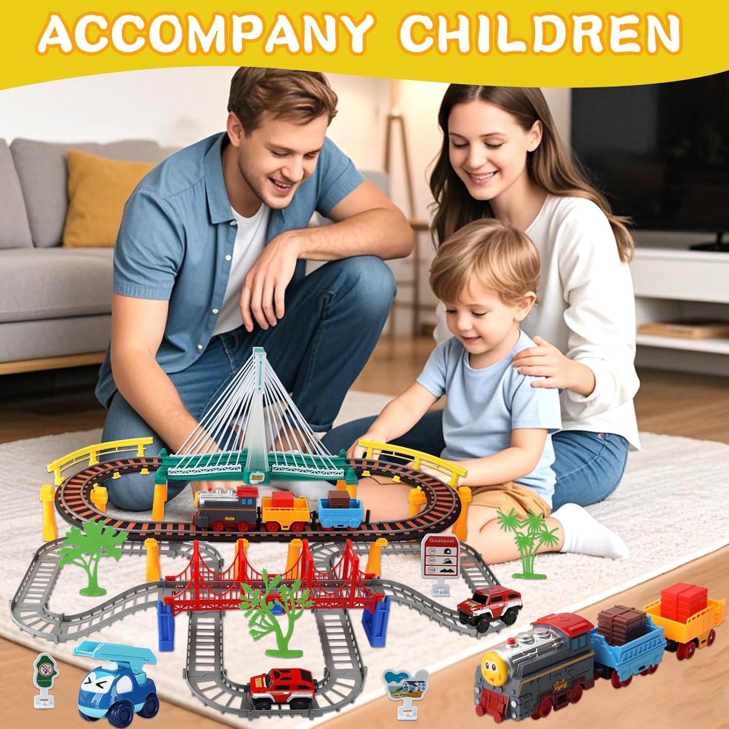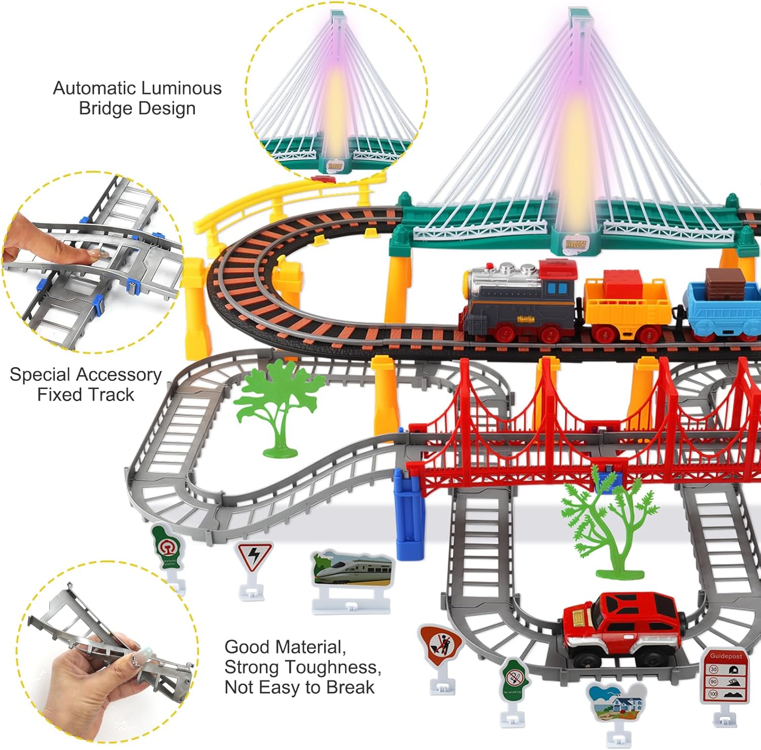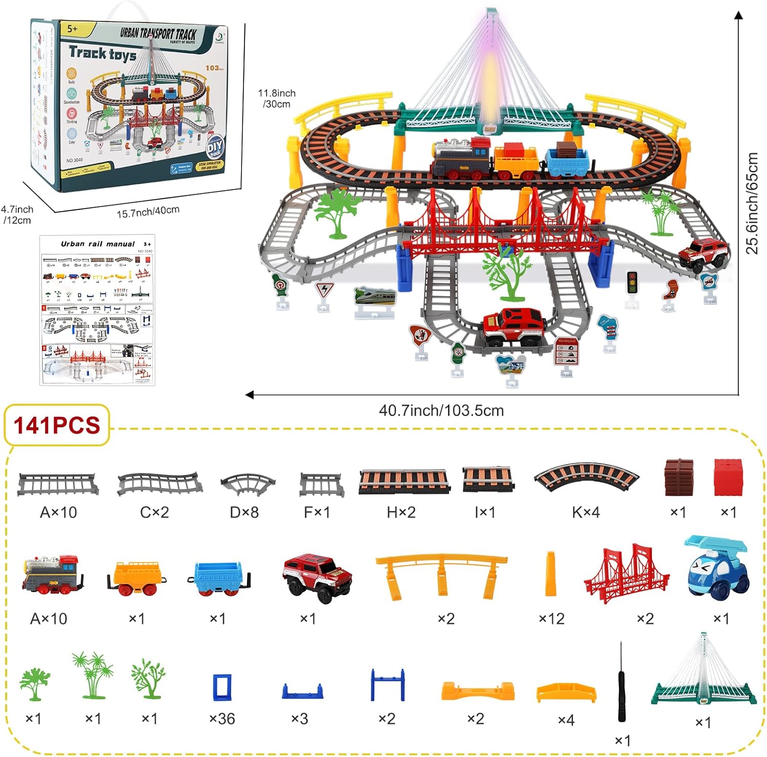 Set Completo di Trenino Giocattolo:Include 141 accessori,tra cui un'auto elettrica e binari.Sono incluse le istruzioni di montaggio per installare il binario a doppio anello,composto da binari per treni e auto,seguendo le istruzioni.Il tuo bambino PUò passare da una modalità all'altra e vivere un'esperienza di gioco varia ed emozionante. Ricchi Accessori per la Pista:Il set di treni elettrici include vari segnali stradali,un ponte illuminato e le istruzioni per la scena della stazione di servizio.La scena ferroviaria cittadina completamente simulata permette ai bambini di seguire I segnali e progettare il proprio treno di trasporto! Suoni e Luci Realistici:Il trenino elettrico emette lo stesso fischio di un treno vero mentre è in corsa e I ponti si illuminano al passaggio! Lascia che I tuoi bambini si immergano nell'azione e costruiscano il loro mondo di piste da corsa! (nota:Il vagone richiede 1 batteria AA,il treno richiede 2 batterie AA e il ponte richiede 3 batterie AA (batterie non incluse).) Facile da Montare,Materiali Sicuri:Questo giocattolo è realizzato in plastica morbida,è privo di bpa,resistente e sicuro,ha una superficie liscia ed è facile da montare.Segui le istruzioni e premi semplicemente I componenti insieme per costruire il binario curvo e il ponte desiderati. Giocattoli per Bambini dai 3 anni in su:Questo trenino elettrico è un giocattolo educativo per I bambini che vogliono imparare a conoscere I cantieri edili.Stimola anche l'immaginazione,le capacità motorie fini e la coordinazione occhio-mano.L'elegante confezione lo rende un regalo popolare per I bambini per compleanni,festività,natale,festa dei bambini o capodanno.