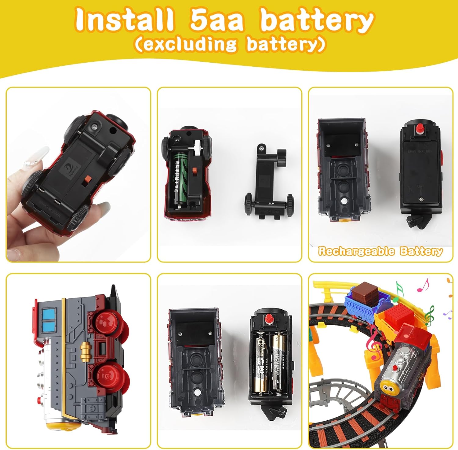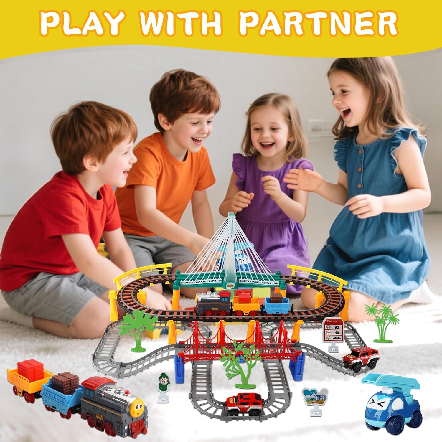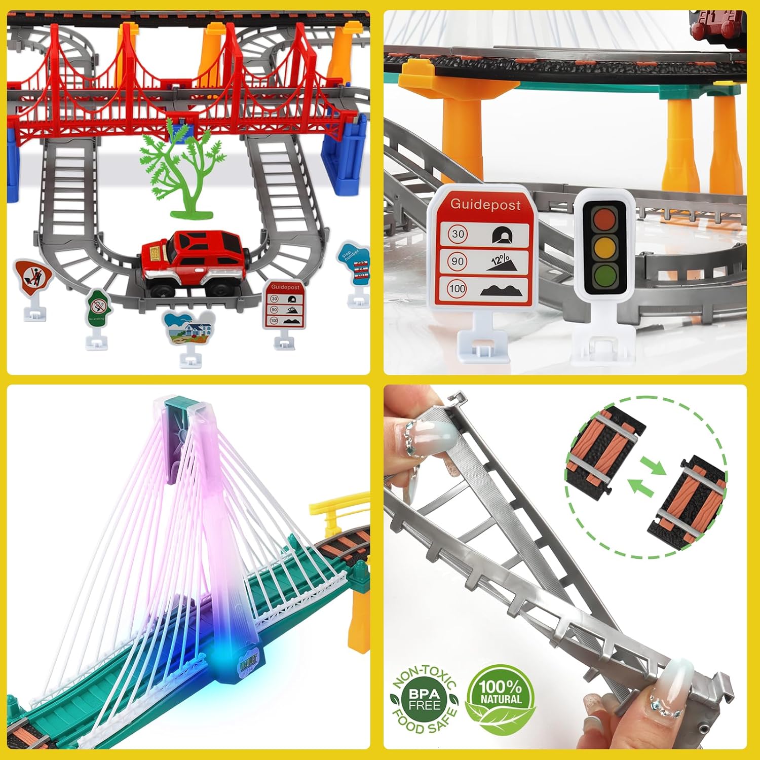 Set Completo di Trenino Giocattolo:Include 141 accessori,tra cui un'auto elettrica e binari.Sono incluse le istruzioni di montaggio per installare il binario a doppio anello,composto da binari per treni e auto,seguendo le istruzioni.Il tuo bambino PUò passare da una modalità all'altra e vivere un'esperienza di gioco varia ed emozionante. Ricchi Accessori per la Pista:Il set di treni elettrici include vari segnali stradali,un ponte illuminato e le istruzioni per la scena della stazione di servizio.La scena ferroviaria cittadina completamente simulata permette ai bambini di seguire I segnali e progettare il proprio treno di trasporto! Suoni e Luci Realistici:Il trenino elettrico emette lo stesso fischio di un treno vero mentre è in corsa e I ponti si illuminano al passaggio! Lascia che I tuoi bambini si immergano nell'azione e costruiscano il loro mondo di piste da corsa! (nota:Il vagone richiede 1 batteria AA,il treno richiede 2 batterie AA e il ponte richiede 3 batterie AA (batterie non incluse).) Facile da Montare,Materiali Sicuri:Questo giocattolo è realizzato in plastica morbida,è privo di bpa,resistente e sicuro,ha una superficie liscia ed è facile da montare.Segui le istruzioni e premi semplicemente I componenti insieme per costruire il binario curvo e il ponte desiderati. Giocattoli per Bambini dai 3 anni in su:Questo trenino elettrico è un giocattolo educativo per I bambini che vogliono imparare a conoscere I cantieri edili.Stimola anche l'immaginazione,le capacità motorie fini e la coordinazione occhio-mano.L'elegante confezione lo rende un regalo popolare per I bambini per compleanni,festività,natale,festa dei bambini o capodanno.