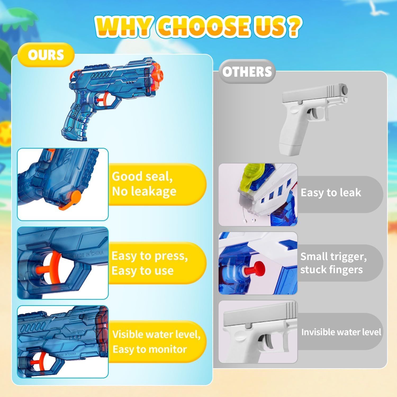 🔥 Set di pistole ad acqua – L'accessorio essenziale per i combattimenti acquatici estivi! Riceverai una pistola ad acqua arancione e una blu, dai colori vivaci che affascinano i bambini e portano un tocco di allegria all'estate! Ultraleggeri e compatti (17×13,5×3,5 cm), sono facili da tenere in mano e garantiscono ore di gioco senza fatica! 💧 Design trasparente: controlla il livello dell'acqua in qualsiasi momento! Grazie al serbatoio trasparente, l'acqua è sempre visibile, permettendo ai bambini di monitorare il livello e regolare il loro gioco. Realizzate in PP durevole e resistente, queste pistole ad acqua sono perfette per i combattimenti in piscina, le avventure in spiaggia o i giochi in giardino! 🎯 Grande capacità + tiro a lunga distanza – Precisione e potenza migliorate! Con una capacità di 180 ml, queste pistole ad acqua riducono la necessità di ricariche frequenti e consentono battaglie più intense. La loro portata da 25 a 30 piedi (da 8 a 9 metri) garantisce tiri precisi e un'esperienza di gioco coinvolgente! ⚡ Ricarica veloce, azione ininterrotta! Grazie alla loro ampia apertura, il riempimento è facile e veloce. Ogni ricarica consente da 50 a 70 colpi consecutivi, assicurandoti un vantaggio strategico sui tuoi avversari! 🎁 Regalo estivo ideale: divertimento per tutti! Adatto a bambini dai 3 anni in su e agli adulti, perfetto come regalo di compleanno o festa! Oltre ai combattimenti in acqua, queste pistole ad acqua per bambini possono essere utilizzate come giochi da piscina, da bagno o anche per addestrare i tuoi animali domestici: un'estate rinfrescante e divertente garantita!