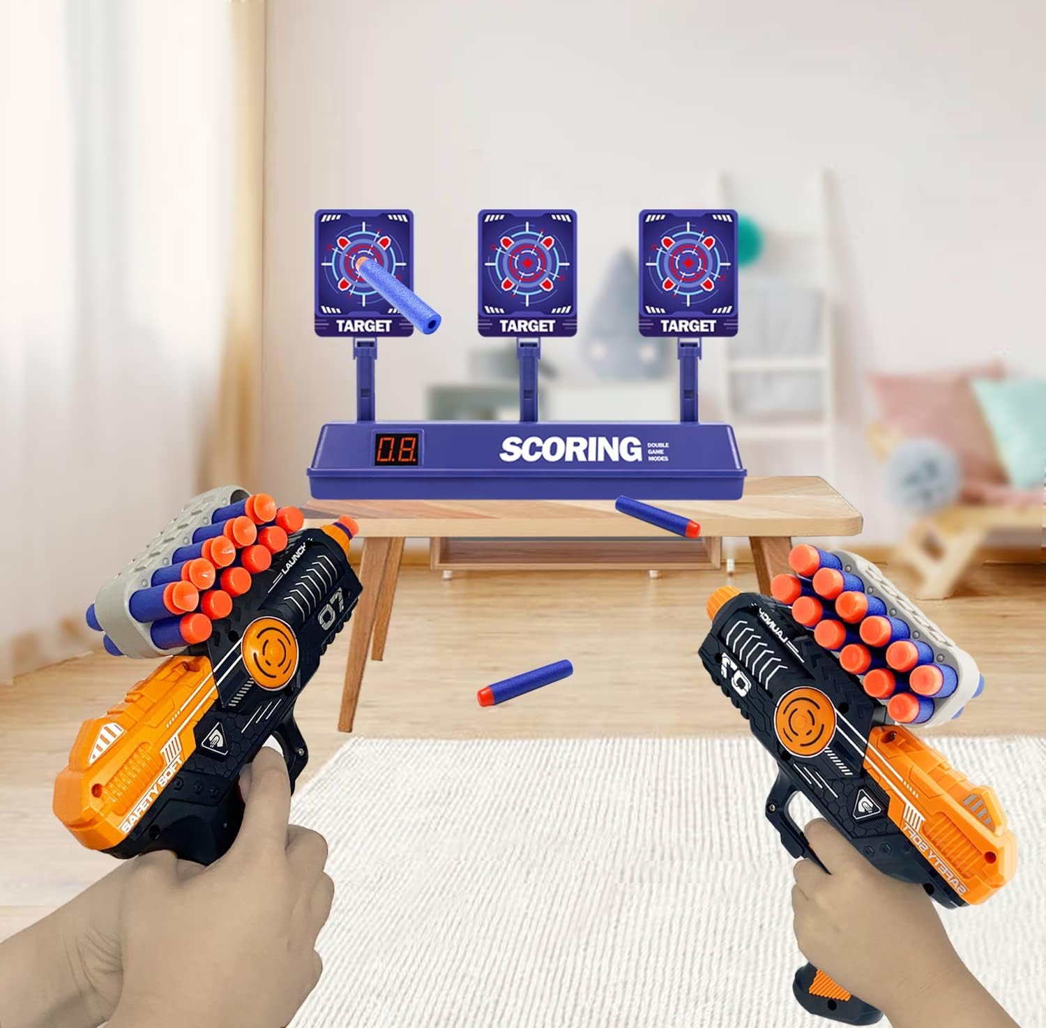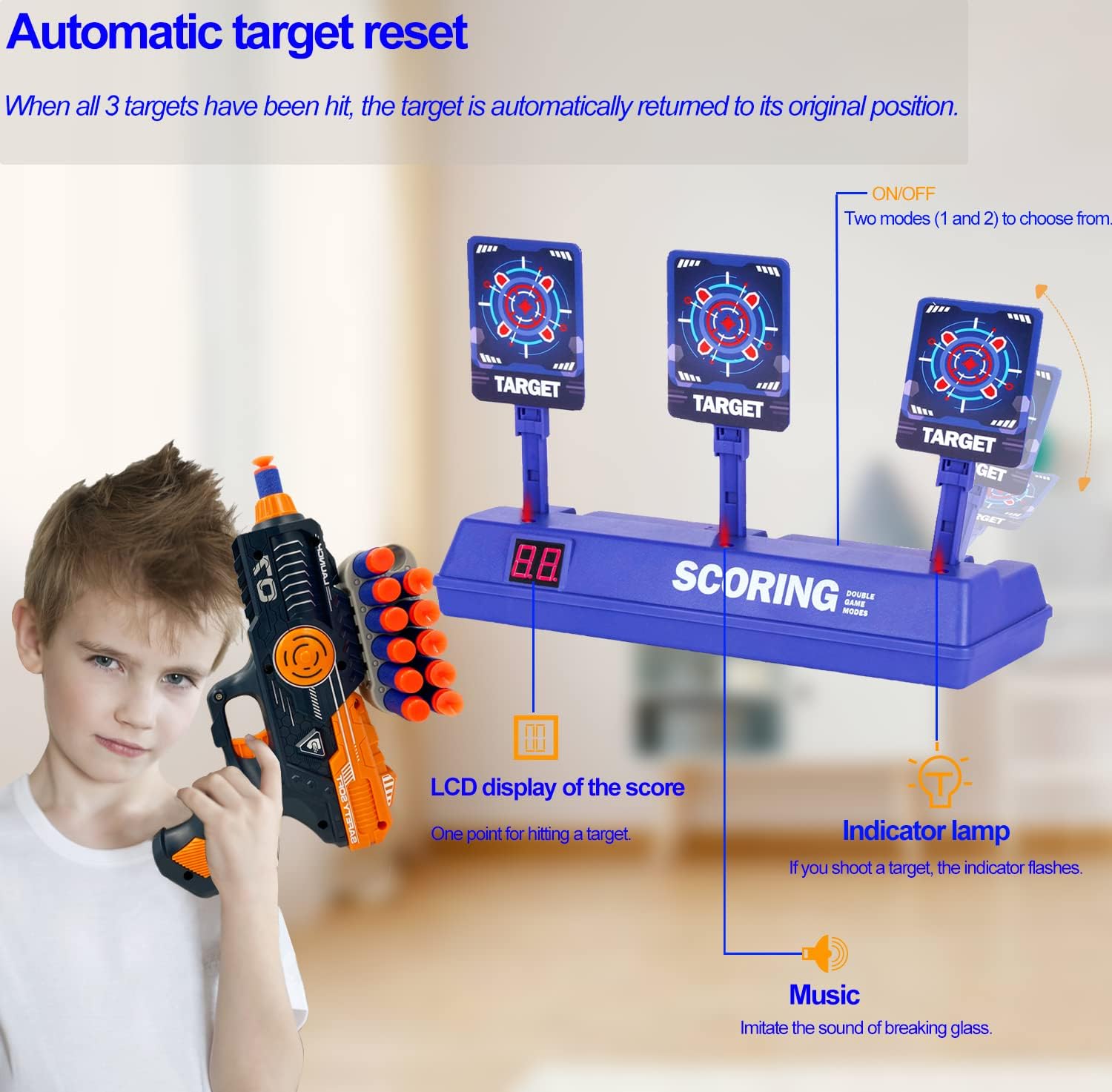 【Set di tiro di nuova concezione】 Il set di bersagli FOR21JOYS comprende una nuova pistola giocattolo, un bersaglio elettronico e 60 freccette - un set per tutte le esigenze.La pistola giocattolo e il bersaglio sono realizzati in plastica ecologica, sicura e durevole.Le 60 freccette sono realizzate in materiale EVA morbido e non pericoloso, che non ferisce i bambini, a misura di bambino e durevole. 【La pistola giocattolo più recente】 La pistola giocattolo FOR21JOYS è un giocattolo da tiro di alta qualità con caricatore staccabile.Con il suo design ergonomico, è facile per i bambini da tenere in mano.Campo di tiro fino a 10 metri.Un gioco di tiro al bersaglio molto attraente per i bambini che amano praticare il tiro! 【Bersaglio elettronico con reset automatico】Quando tutti e 3 i bersagli vengono abbattuti, rimbalzano automaticamente uno alla volta dopo 3 secondi. Il bersaglio emette un suono di rottura del vetro simulato ogni volta che viene colpito, che stimola il tiratore ed eccita e diverte i bambini. I bambini sperimentano il divertimento del tiro in un gioco per famiglie. 【Zwei Spielmodi】regulärer Modus und Zufallsmodus.Regulärer Modus: Sie erhalten einen Punkt,wenn Sie 3 Ziele abschießen,Zufallsmodus: Die Anzeige leuchtet zufällig auf und Sie erhalten einen Punkt,wenn Sie das entsprechende Ziel treffen.Realistische Soundeffekte und Lichteffekte sorgen für das Gefühl eines Kampfes und sind auch für Kinder ohne Schießerfahrung leicht zu meistern. 【Regalo perfetto per i bambini】Questo set di giocattoli per il tiro a segno è il regalo perfetto per il compleanno, Halloween e Natale per ragazzi e ragazze dai 6 anni in su ed è anche ideale per i giochi in famiglia a casa o per le feste all'aperto con i genitori.