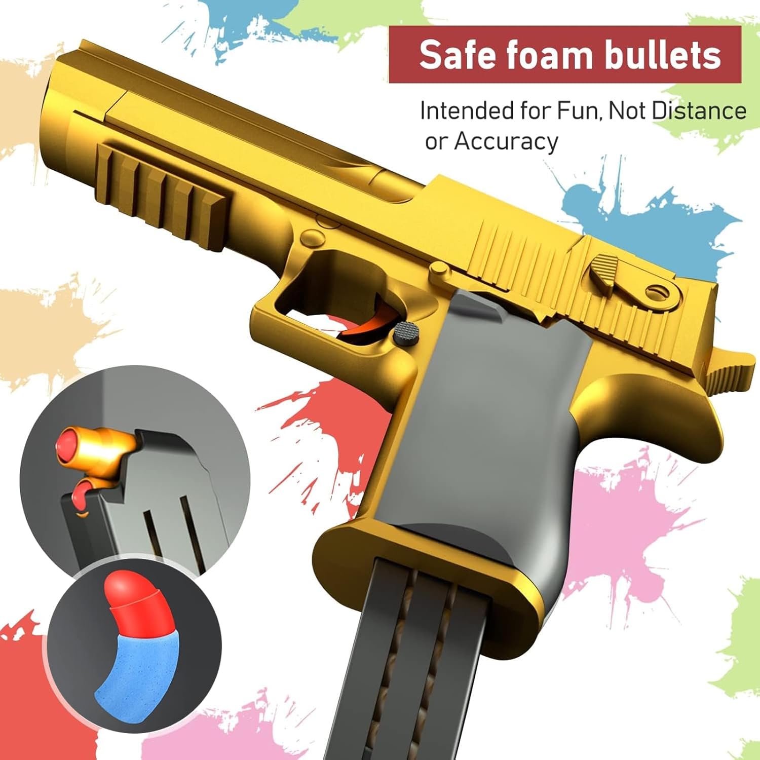 La confezione include: 1 pistola giocattolo, 1 canna lunga, 2 caricatori, 40 proiettili morbidi, 24 bossoli. Questa pistola giocattolo richiede esercizio fisico, osservazione e resistenza. Realizzata in plastica resistente e di alta qualità, con un aspetto lucido e un processo di ricarica manuale rapido e sensibile Facilità d'uso: sorprendi rapidamente i tuoi compagni di squadra con il blaster in schiuma. La pistola giocattolo è progettata per essere morbida e liscia, in modo da non ferire il corpo e poter essere utilizzata con sicurezza. Questi dardi in schiuma con cuscinetti sono morbidi e innocui e non feriranno nessuno Design adatto agli adulti: promuove la forma fisica, le capacità di mira, le capacità di osservazione e la resistenza. Offre un intrattenimento sportivo dinamico sufficiente per consentire agli adulti di combattere insieme e integrarsi meglio in squadre e famiglie, per giocare insieme, allenarsi sulla sicurezza o giocare, per età superiori ai 14 + Esperienza di tiro: il blaster in schiuma giocattolo utilizza un caricatore a molla per ricaricare i proiettili. Azione a scorrimento con ottimo suono e pulsante di sgancio del caricatore, pur essendo molto più leggero e scorrevole nelle mani. Caricatore rimovibile, ricarica manuale, espulsione automatica dei proiettili e proiettili morbidi sicuri Pistola giocattolo educativa: grazie alle sue dimensioni portatili, puoi giocarci ovunque tu voglia. Con un semplice funzionamento, puoi iniziare subito a giocare con le armi. È un ottimo regalo per compleanni, Natale, Capodanno, Pasqua o qualsiasi altra occasione
