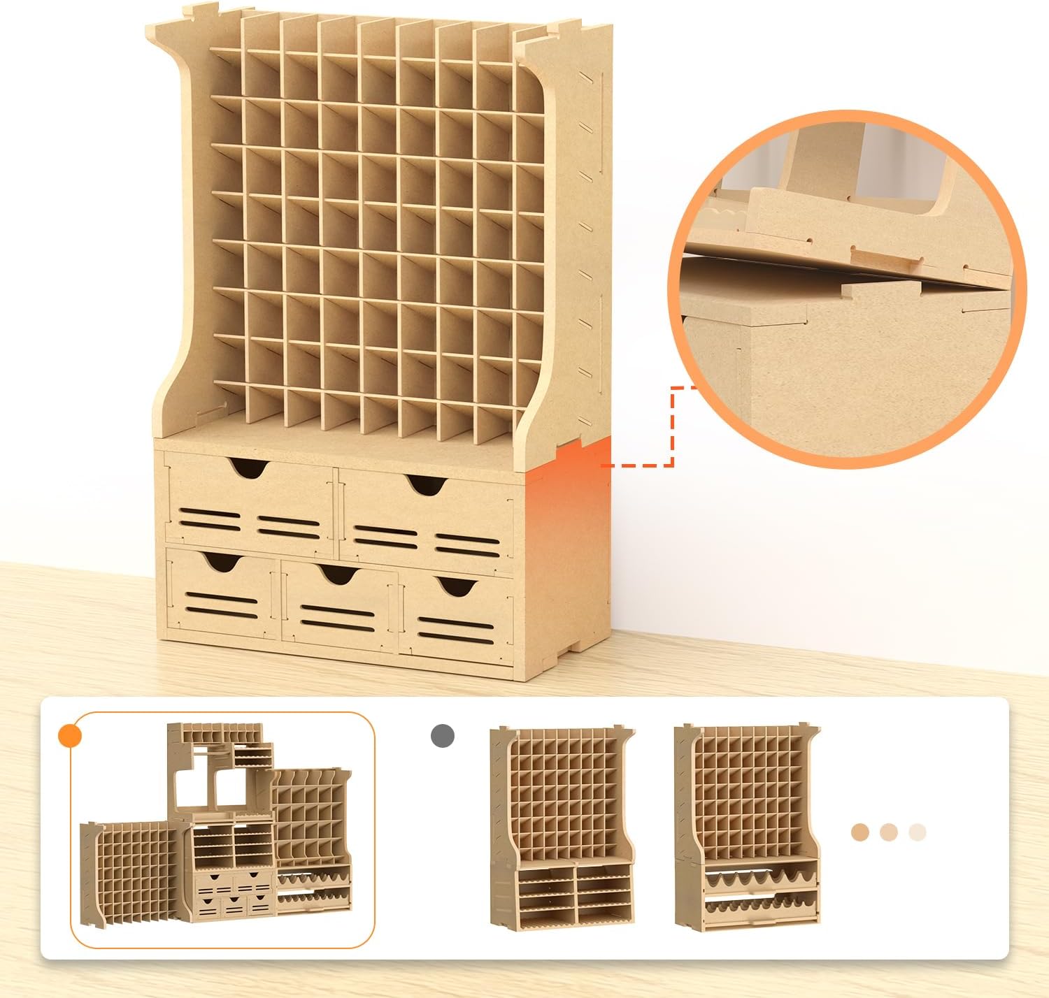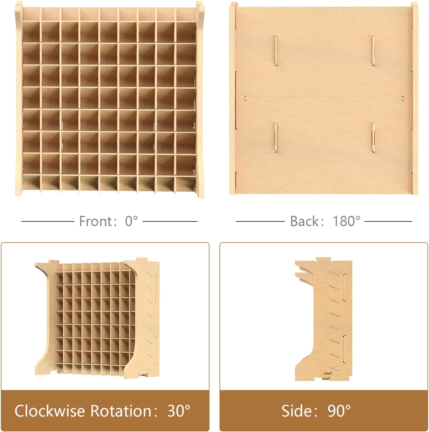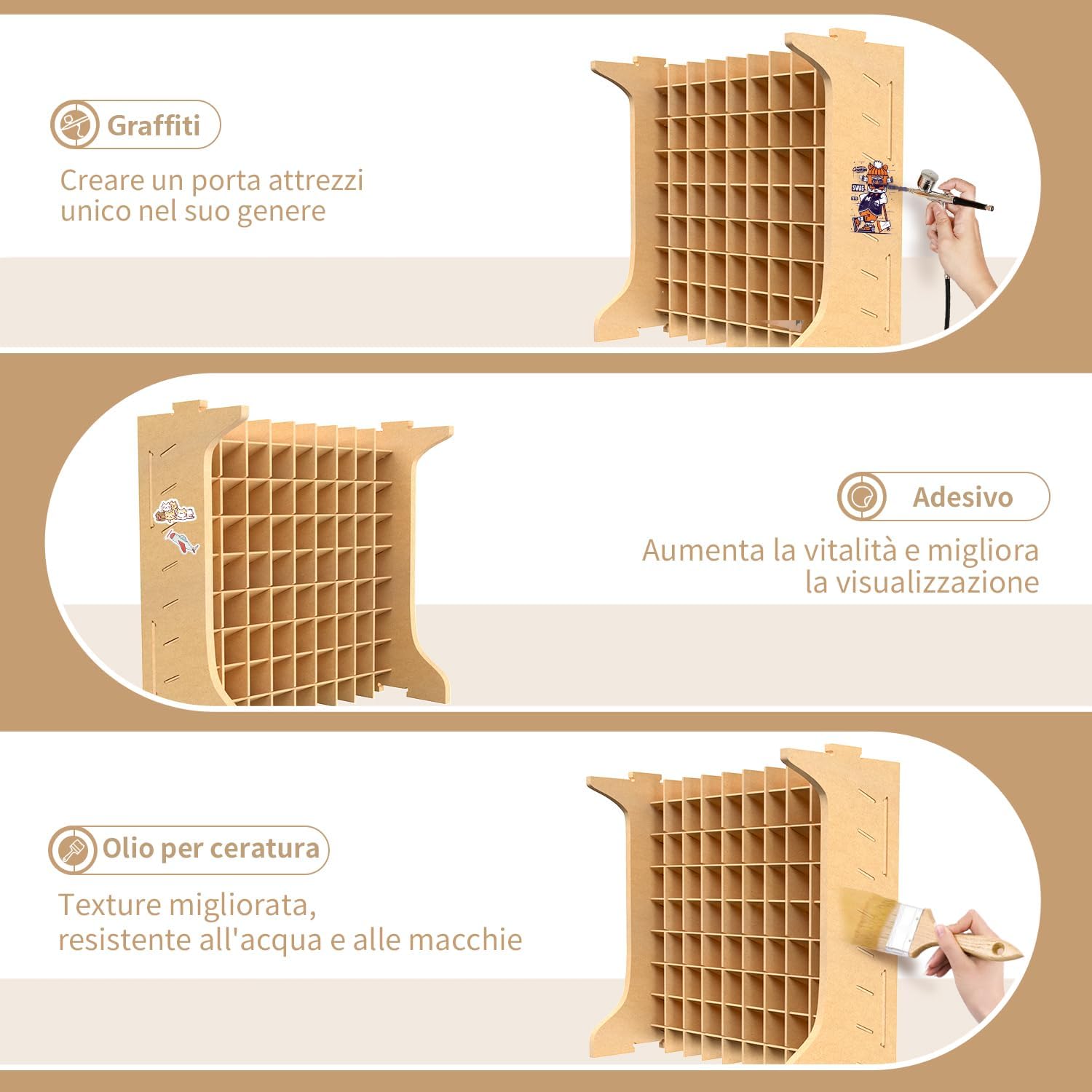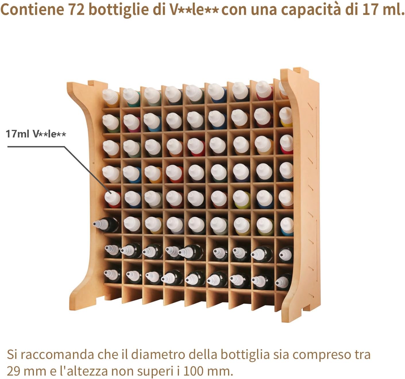 MDF100% Forte compatibilità--Il resistente scaffale per vernici GK12 misura 30 cm di lunghezza x 30 cm di altezza. I ripiani sono a 8 livelli e ogni livello può contenere 9 articoli, per un totale di 72 articoli. La dimensione di ogni griglia è di 32mm*28mm, quindi può ospitare Vallejo con una capacità di 17ml e bottiglie con un diametro inferiore a 28mm. Design con angolo di 15¡ã per un facile stoccaggio e accesso alla vernice. Banco da lavoro ordinato per un accesso rapido alle vernici: per i modelli in plastica è necessaria una grande quantità di vernice. Il portavernice GK12 di Bucasso può contenere 72 flaconi di vernice di diametro inferiore a 28 mm, il che lo rende un modo salvaspazio e altamente efficiente per riporre gli attrezzi. Un posto di lavoro pulito migliorerà sicuramente l'efficienza del lavoro. In questo modo, sarete in grado di produrre lavori migliori. Materiale di alta qualità: i portavernice Bucasso sono realizzati in MDF. L'MDF è un materiale ecologico e altamente riciclabile. L'MDF, ottenuto dalla solidificazione di fibre di legno, ha una densità uniforme ed è difficile da rompere. Inoltre, la superficie e la sezione trasversale sono lisce e prive di spazi vuoti, per cui anche se vi si appiccicano graffiti o adesivi, l'aspetto sarà bellissimo. È anche possibile trattare l'olio di cera per migliorarne la consistenza. Facile da assemblare: suggeriamo di carteggiare prima con la carta vetrata e poi di battere con un martello una volta assemblato. L'accoppiamento è stretto per garantire un'unione salda e impedire che si sfaldi. Le istruzioni per l'imballaggio e l'assemblaggio sono incluse in ogni stile, il manuale di istruzioni è anche accompagnato da diagrammi, che sono facili da capire e da assemblare. Allo stesso tempo, il processo di assemblaggio può anche godere del divertimento del fai da te. Attenzione a non ferirsi le mani, perché la superficie di taglio del legno può essere tagliente (si consiglia di raschiare leggermente con carta vetrata prima di iniziare il lavoro). ●Assemblare seguendo l'ordine delle istruzioni. A causa delle caratteristiche del legno, possono essere presenti piccoli graffi o differenze di colore, ma non si tratta di un difetto. Se avete problemi con il prodotto ricevuto, non esitate a contattare il nostro servizio clienti. Nota. Fare attenzione a non ferirsi le mani, perché la superficie tagliata del legno può essere tagliente (si consiglia di raschiare leggermente con carta vetrata prima di iniziare il lavoro).Assemblare secondo l'ordine delle istruzioni. A causa delle caratteristiche del legno, possono essere presenti piccoli graffi o differenze di colore, ma non si tratta di un difetto. In caso di problemi con il prodotto ricevuto, non esitate a contattare il nostro servizio clienti.