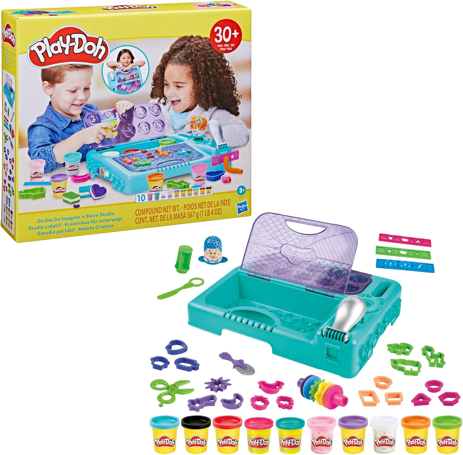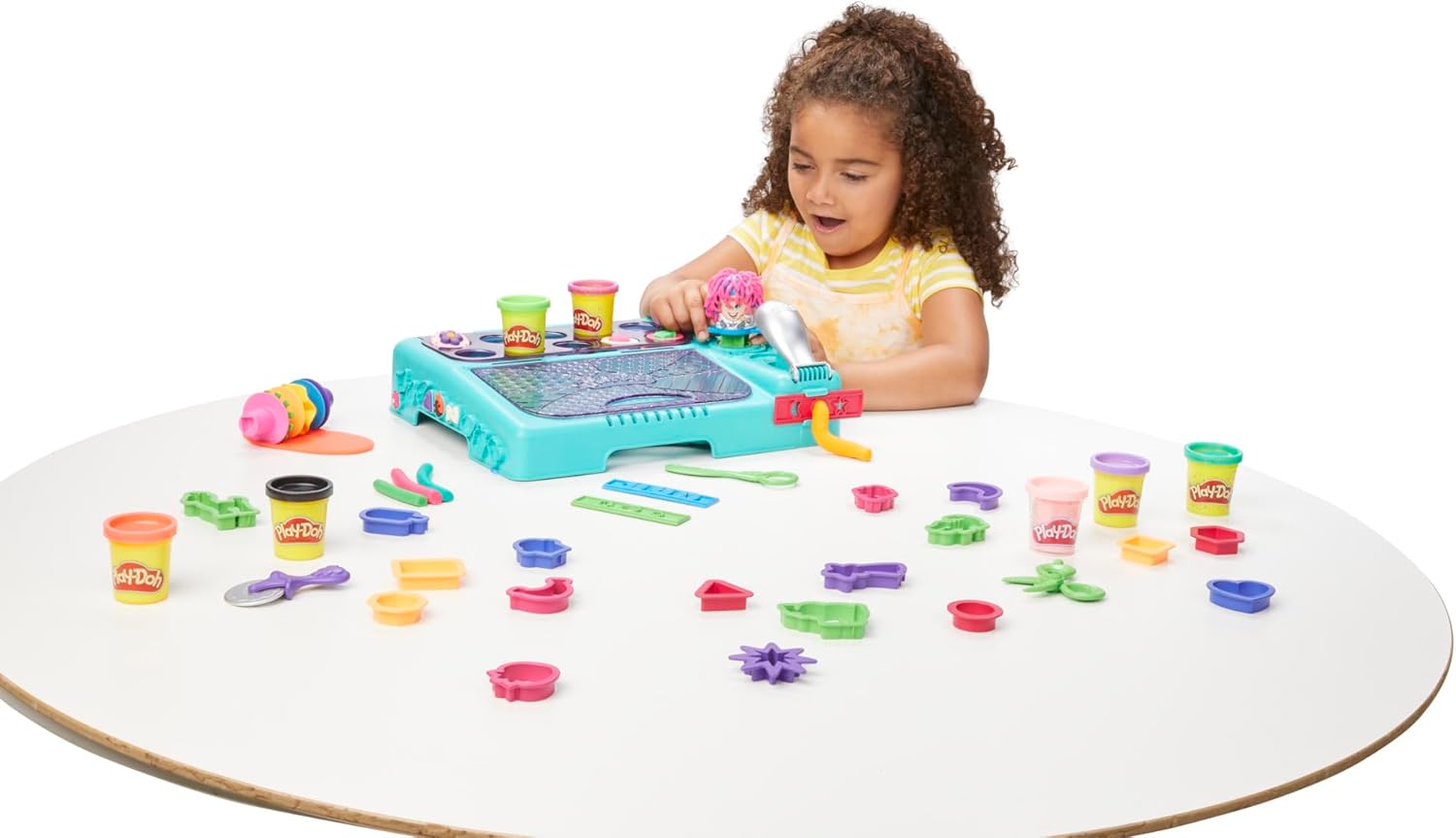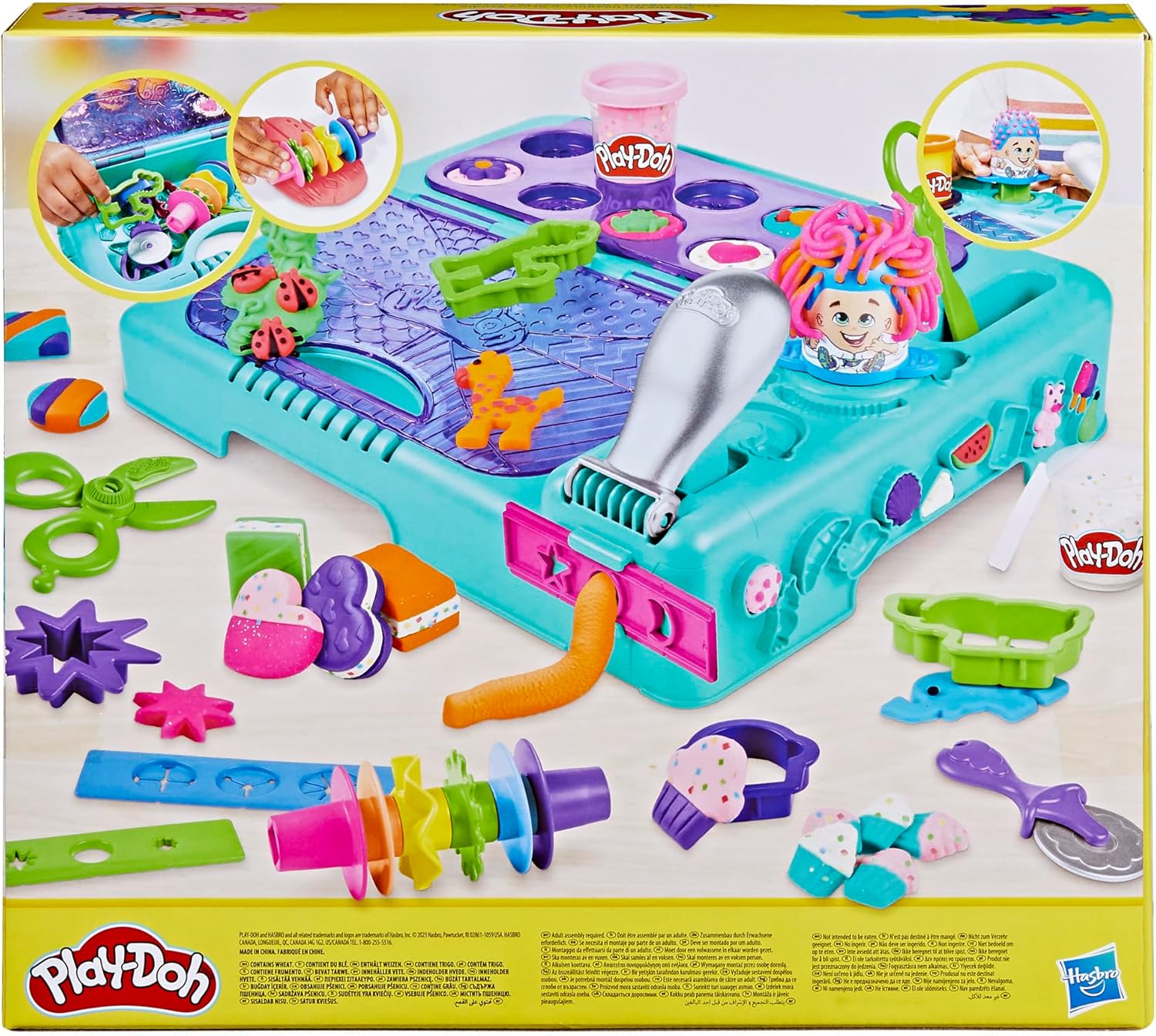 SPAZIO GIOCO TUTTO IN UNO: questa postazione di lavoro Play-Doh autonoma include superfici di gioco, strumenti, stampi e tanto spazio per riporre gli oggetti: tutto ciò di cui i bambini dai 3 anni in su hanno bisogno per tanto divertimento fantasioso! DIVERTIMENTO CREATIVO INTEGRATO: la custodia per il trasporto ha tantissime funzioni divertenti, tra cui due classici Play-Doh integrati! Lo strumento Fun Factory crea forme lunghe e buffe e lo strumento Fuzzy Pumper fa crescere esilaranti capelli Play-Doh OLTRE 30 STRUMENTI PLAY-DOH: le piccole mani adoreranno usare l'incredibile assortimento di strumenti per arrotolare, timbrare e tagliare divertenti forme Play-Doh come animali, fingere frutta e dolci, stelle cadenti e altro ancora 10 VASI PLAY-DOH: 10 colori di composto da modellare Play-Doh in vasetti da 56 g, inclusi 2 vasetti di Confetti rosa e bianchi e 2 vasetti di composto Sparkle rosso e verde. Contiene grano OTTIMO REGALO, COMODA PULIZIA: fantastico come regalo di compleanno o festivo e costituisce un'ottima attività per le giornate piovose. Perfettamente portatile, con ampio spazio di stoccaggio e superfici di lavoro per una pulizia facile e veloce"
