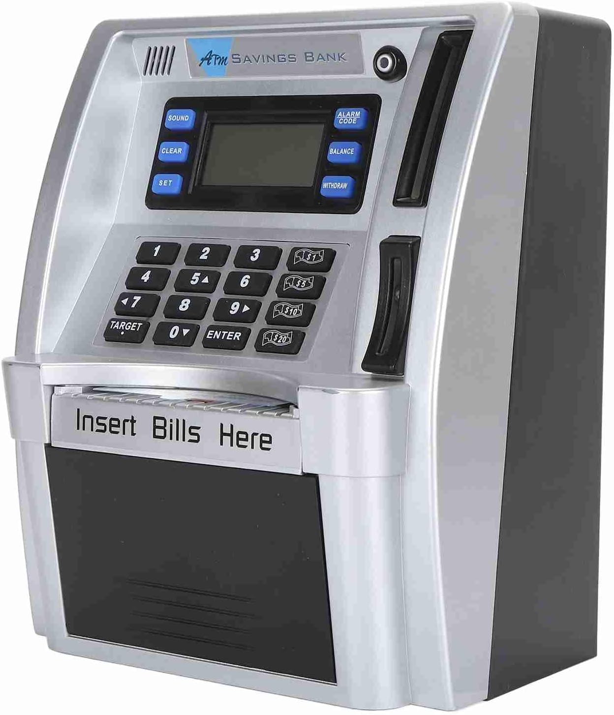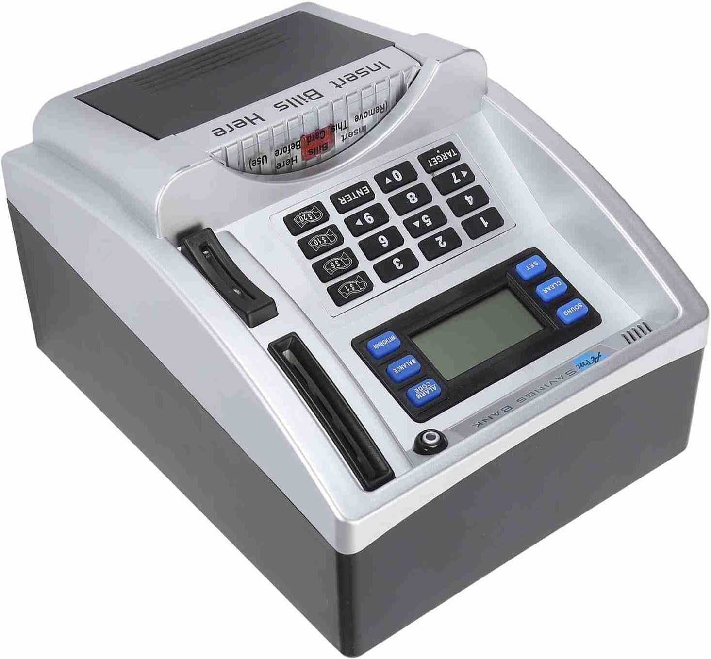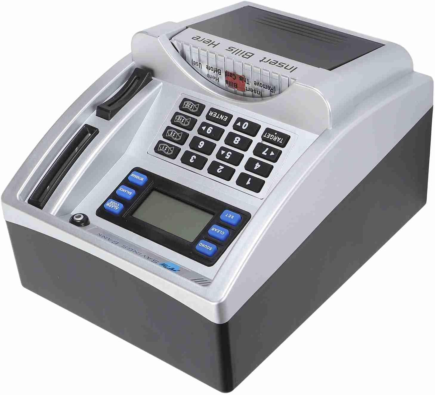 [Esperienza di divertimento ed educativo ATM] Questo bancopia elettronica ATM imita le macchine bancomat del mondo reale con istruzioni vocali e uno schermo LCD per visualizzare le transazioni. Fornisce un modo interattivo divertente per i bambini di imparare la gestione del denaro mentre monitorano depositi e prelievi in tempo reale. [Riconoscimento automatico di monete e bollette] Progettata con tecnologia avanzata Questo salvadanaio presenta uno slot di monete che identifica e calcola le monete inserite. Lo slot delle note rotola automaticamente in moneta cartacea quando il pulsante Nota viene premuto rendendo senza sforzo e coinvolgente per i bambini. [Obiettivi di risparmio personalizzabile] I bambini possono fissare obiettivi di risparmio personale fino a 9999,99 insegnando loro preziose capacità di pianificazione finanziaria. Lo schermo LCD monitora visivamente i loro progressi motivandoli a raggiungere i loro obiettivi mentre imparano le abitudini di denaro responsabili. [Protezione PIN ad alta sicurezza] dotato di un di accesso al codice a 4 cifre Questo Piggy Bank assicurano che i risparmi rimangano sicuri. Il pin può essere facilmente ripristinato se dimenticato fornendo sicurezza e comodità per i giovani utenti. [Strumento di apprendimento finanziario interattivo] Più di un semplice salvadanaio questo dispositivo combina il gioco con l'educazione. Le sue funzioni ATM realistiche tra cui monitoraggio dei depositi e aggiornamenti sull'equilibrio aiutano i bambini a comprendere i concetti bancari in modo pratico.