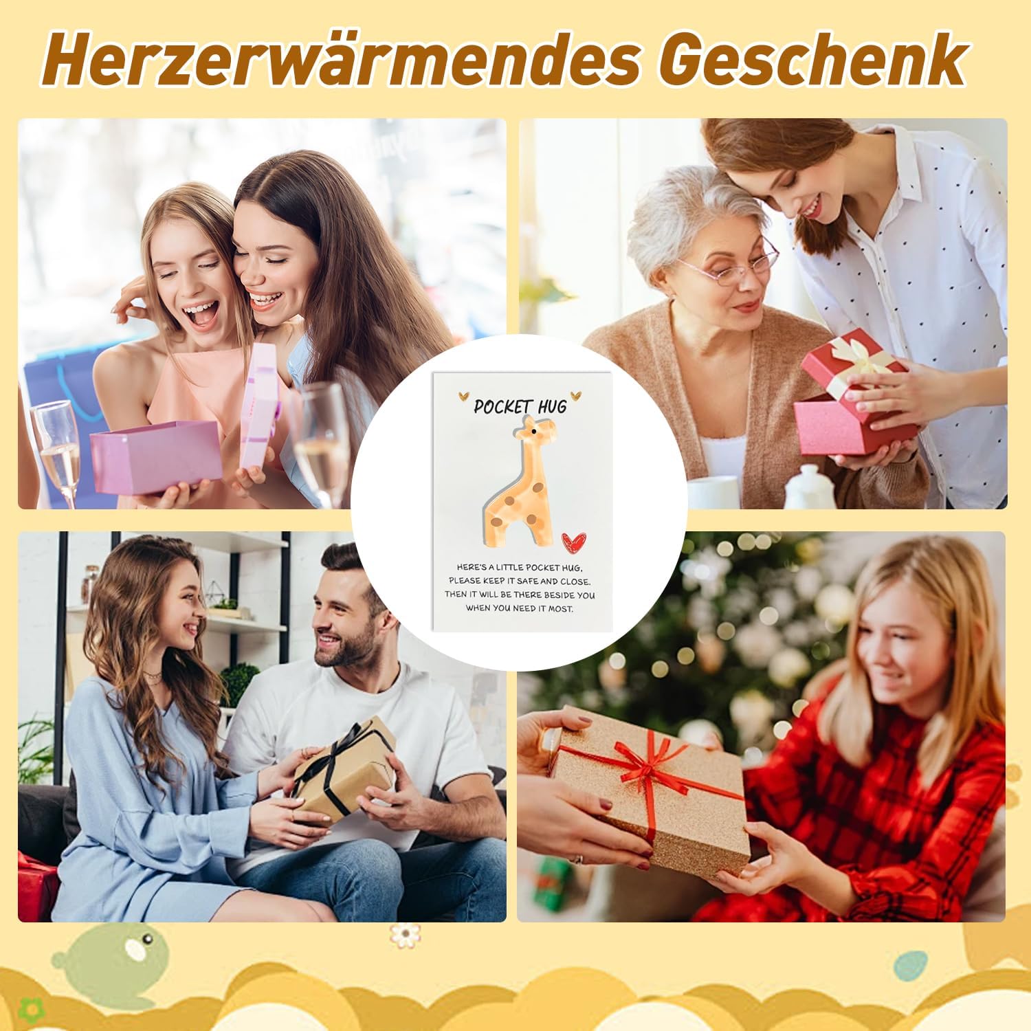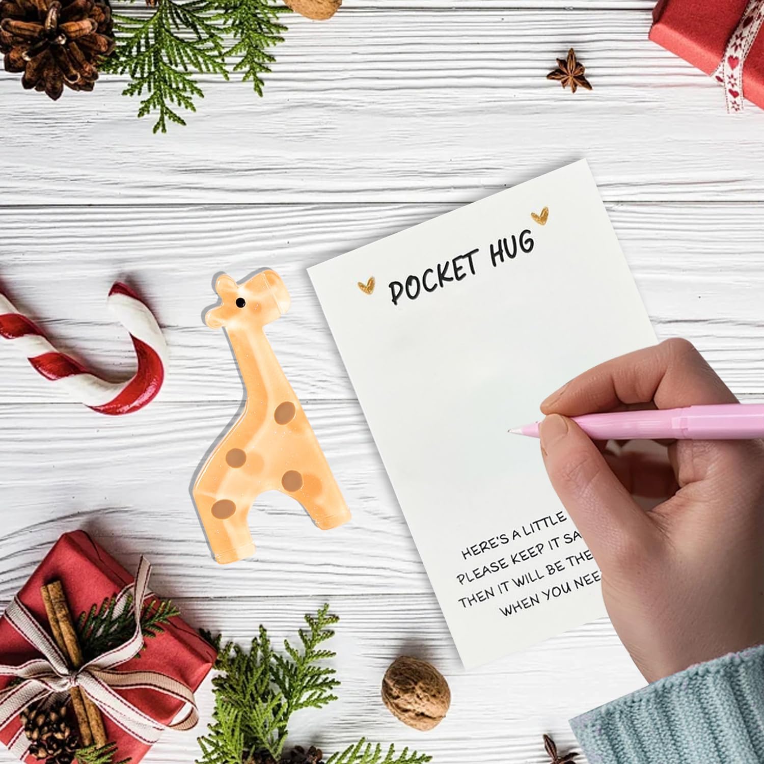 Allevia l'ansia: una piccola giraffa tascabile può alleviare l'ansia ed è sicuramente una buona scelta se hai bisogno di un po"di conforto durante il giorno. Può curare la tua sfortuna, alleviare le tue preoccupazioni e rendere la tua vita piena di fiducia Materiale di alta qualità: riceverete 1 biglietto di auguri con giraffa Pocket Hug. La piccola giraffa Pocket Hug è realizzata in resina di alta qualità, ha una dimensione adatta e un portachiavi in acciaio inossidabile. È facile da trasportare e può essere messo in borse, borse, portafogli, chiavi, ecc Abbraccio caloroso: il biglietto di auguri con giraffa con messaggio ispiratore da mettere nel palmo della mano o nella borsa farà sorridere le persone che ti stanno a cuore. Dare un caldo abbraccio a qualcuno che è in un momento difficile e incoraggiarlo/lei a uscire dal profondo Mostra la tua simpatia: Pocket Giraffe è sempre pronta ad abbracciare chiunque ne abbia bisogno. Mostra la tua simpatia con una piccola giraffa tascabile con un biglietto di auguri incoraggiante. Esprimi il tuo profondo affetto e significato per l"amicizia o l"amore Un regalo meraviglioso: la piccola giraffa viene fornita con un biglietto che lo rende un meraviglioso ricordo per te. È un piccolo regalo, ma mostra quanto qualcuno significhi per te. Un regalo cordiale, bello e significativo per i vostri cari, amici e familiari
