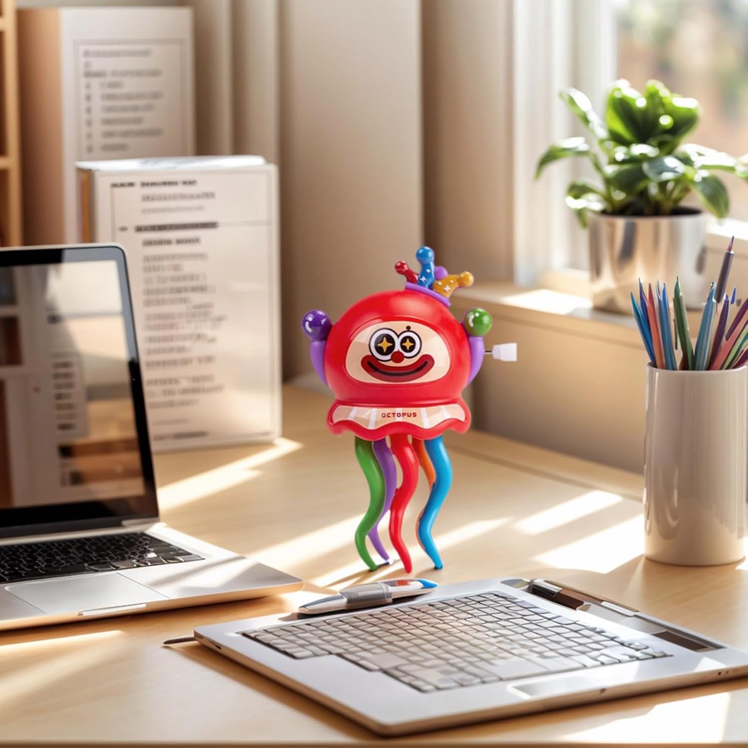 Movimento oscillante coinvolgente: Il design ibrido pagliaccio-polpo unisce colori vivaci e movimento affascinante, arricchendo il gioco con charme umoristico e presenza stimolante per l'immaginazione Gioco Durevole: Realizzato per resistere a sessioni intensive di gioco, offre esperienze interattive prolungate e diventa un compagno fidato nelle routine di divertimento domestico Maneggevolezza Sicura: Integra sicurezza antischiacciamento, bordi arrotondati e struttura antigraffio, offrendo una presa confortevole per tutte le età e una lunga durata nel Movimento a Manovella: Progettato con simulazione dei tentacoli di polpo, attiva movimenti dinamici simili a danza che forniscono dallo stress, per momenti rilassanti Adattabilità: Ibrido decorativo compatto che unisce caratteristiche funzionali e benefici anti stress, si integra con facilità in contesti diversi arricchendo l'ambiente con il suo aspetto visivo simpatico e rasserenante