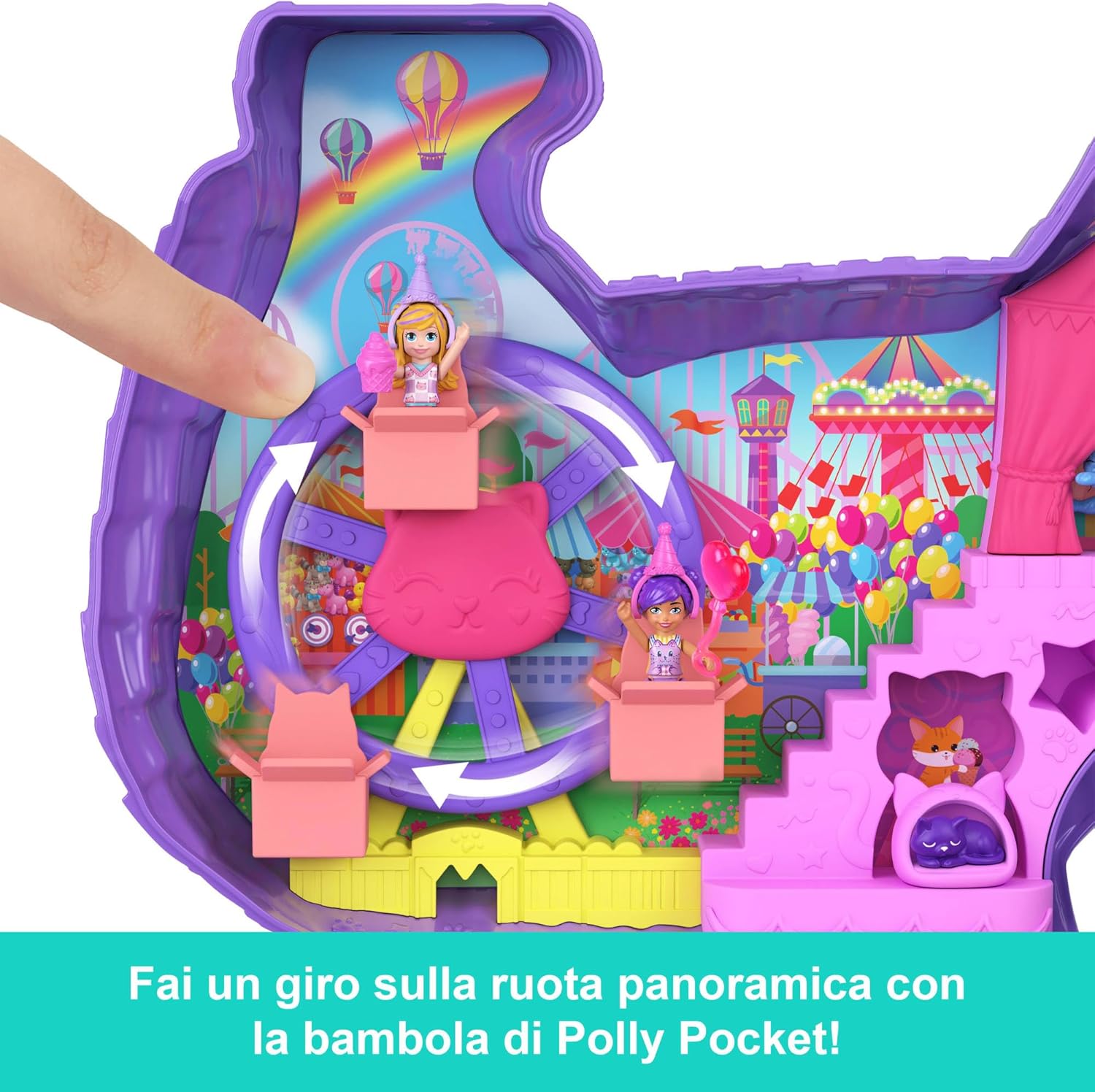 Facciamo festa! Questo playset Polly Pocket Gattino delle Feste a forma di pignatta è ricco di divertimento festivo con due mini bambole e 23 accessori, tra cui gattini L'adorabile pignatta si apre quando si tira la corda in basso! Poi, guarda come cadono i coriandoli e gli accessori dalla pignatta La festa prende vita con accessori come palloncini, cerchietti da festa, un chiosco dei gelati e naturalmente.; gattini Le bambole amano fare un giro sulla ruota panoramica che gira prima di salire sul carrello delle montagne russe che si muove lungo la pista, proprio come in un vero parco divertimenti Gioca con i gattini dietro la porta della tenda che si apre o prendi un dolcetto dal chiosco dei gelati.; delizioso Ideale per bambini dai 4 anni in su che possono festeggiare qualsiasi occasione con il playset Gattino delle Feste a forma di pignatta