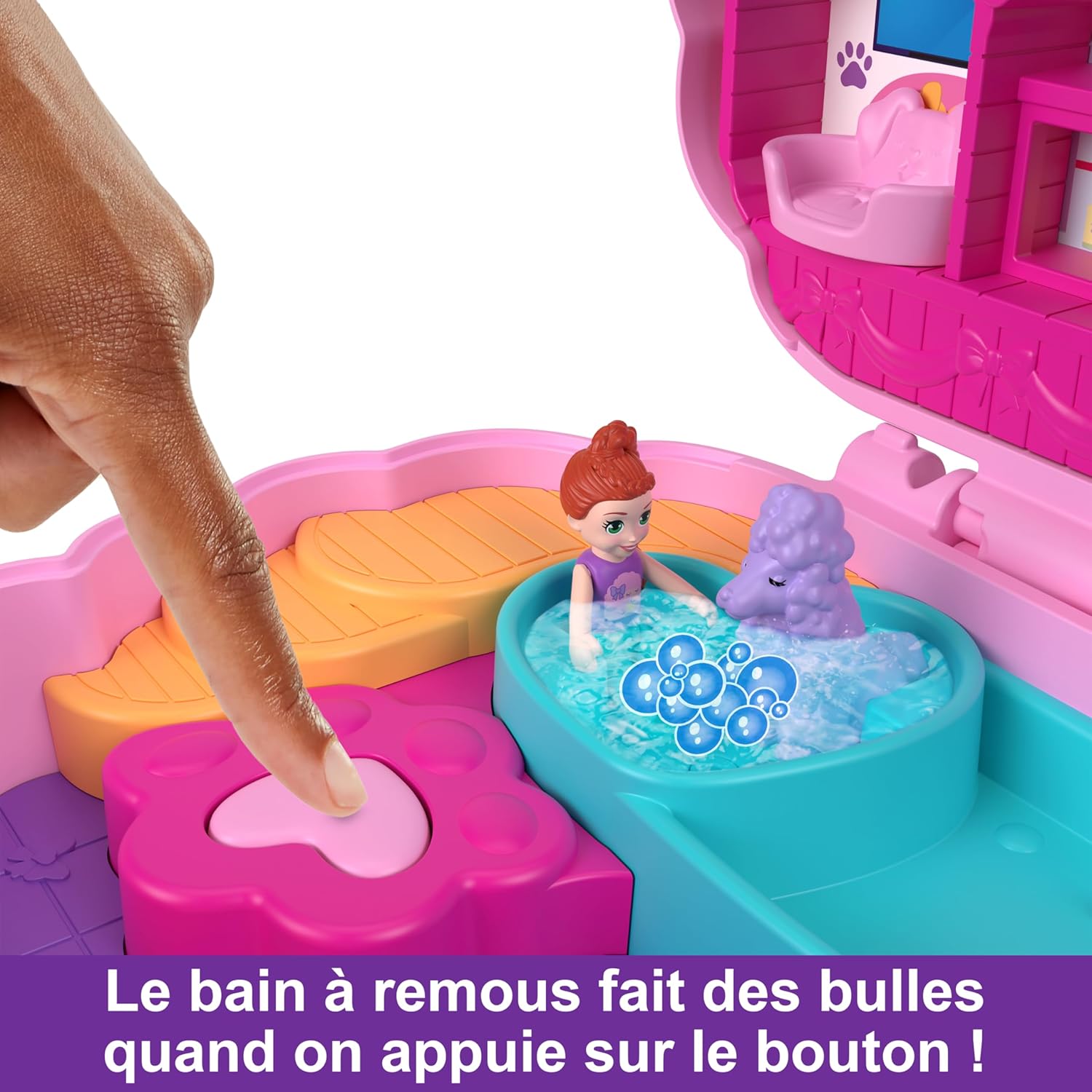Apri questa scatola per la toelettatura del barboncino di Polly Pocket per scoprire una spa per animali dove ti aspettano la minifigure di Lila e la sua amica! Le possibilità di gioco sono infinite con 12 accessori per la toelettatura e 8 elementi interattivi, tra cui barboncini che cambiano colore, una vasca da bagno per cani e sedie girevoli per la toelettatura! Versa l'acqua nella doccia o nella piscina con la tazza con beccuccio inclusa e premi il pulsante a forma di zampa per creare bolle nella vasca idromassaggio! Alcuni accessori sono dotati del sistema di fissaggio Pop & Swap per tenerli in diversi punti della scatola a seconda delle storie! La scatola è dotata di un cinturino da polso in modo che i bambini possano trasportarla facilmente e giocare ovunque! Questa scatola per la toelettatura dei barboncini è un'ottima idea regalo per i bambini dai 4 anni in su, soprattutto se amano i cani e si prendono cura di loro!