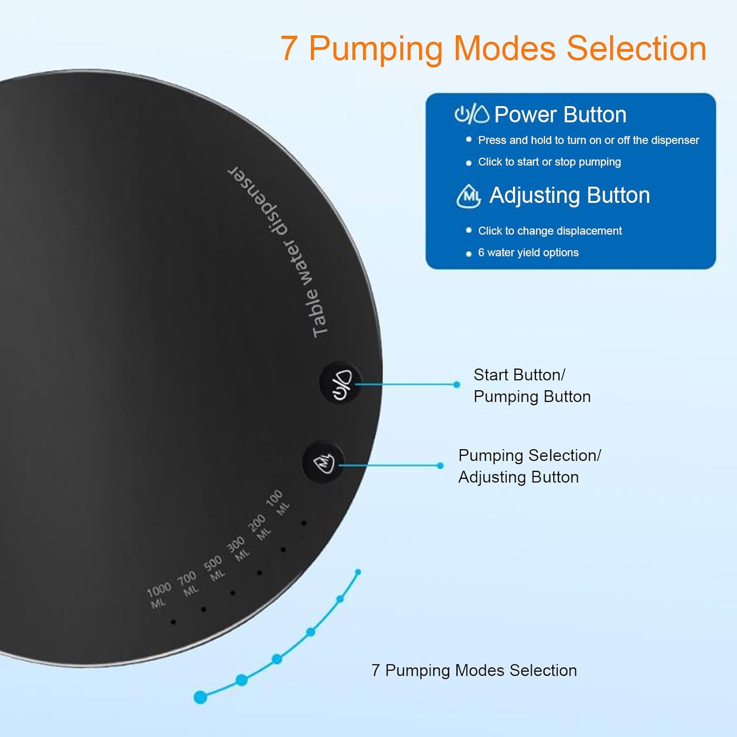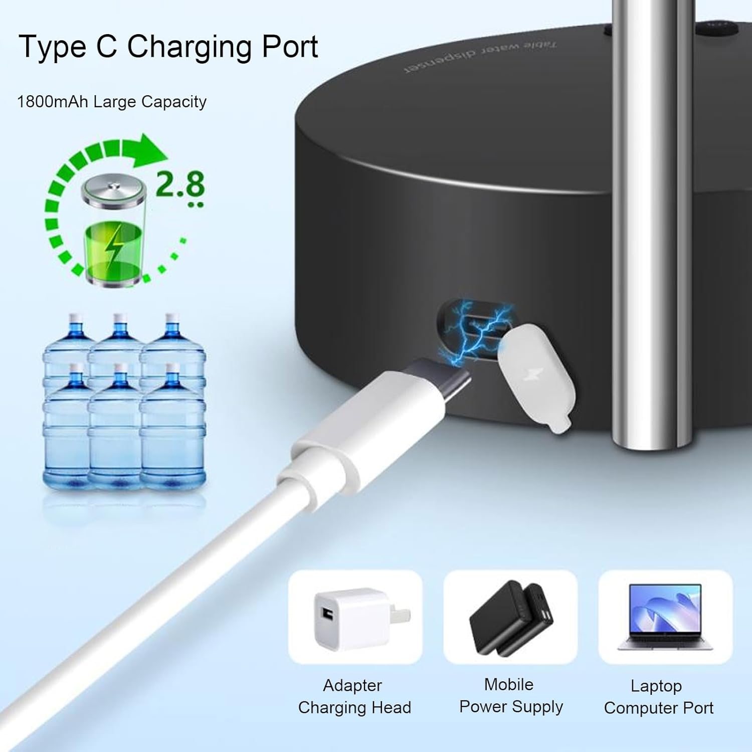 [Acqua ricca di minerali] La pompa fornisce acqua minerale pulita con una pressione perfetta per la salute e il benessere. [Erogazione 'acqua senza sforzo] Goditi un facile accesso all'acqua potabile pulita con la pompa erogatrice automatica, senza necessità di sollevare carichi pesanti o fuoriuscite. [Materiali durevoli] Realizzata in ABS e acciaio inossidabile, la pompa è durevole e affidabile con una batteria al litio da 1800 mAh per un uso continuo. [Design intuitivo] Grazie al funzionamento tramite pulsante e alla facilità di installazione, questa pompa elettrica elimina la necessità di erogazione manuale, rendendola comoda ed efficiente. [Uso versatile] Adatta per la casa, l'ufficio e gli ambienti esterni, questa pompa intelligente può essere utilizzata su barili d'acqua e scrivanie per un comodo accesso all'acqua rinfrescante.