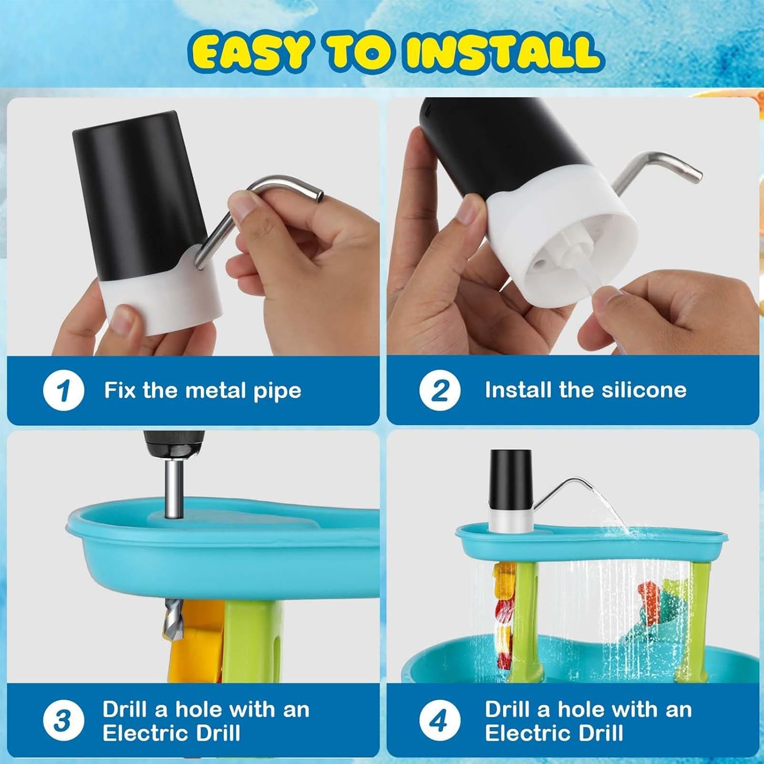 Portate gioia e divertimento: quando il caldo estivo aumenta, con la nostra pompa da tavolo senza fili facile da usare, assicuratevi che i vostri bambini rimangano freschi e divertenti, perfetta per giochi d'acqua all'aperto. Installazione comoda: integra perfettamente la pompa per acque sotterranee nel tuo sistema; basta installare il tubo di aspirazione, eseguire il tubo dell'acqua, avviare la pompa e praticare un foro nella parte superiore per un facile svuotamento. Intrattenimento ininterrotto: la nostra pompa da tavolo dell'acqua garantisce tempo di gioco e tensione alle feste di famiglia, feste di compleanno, feste in piscina e in spiaggia. Con oltre 2 ore di riproduzione ininterrotta dopo una singola carica, il divertimento non deve mai finire. Facile da usare: premere a lungo il pulsante e entro 3 secondi i bambini possono iniziare a giocare in un'area di gioco più sicura grazie alla pompa da tavolo ad acqua facile da usare. Buoni regali di Natale: abbellisci le tue celebrazioni con la nostra pompa da tavolo, il regalo ideale per i bambini per divertirsi all'aria aperta e garantire che ogni vacanza e viaggio diventi un'avventura gioiosa.