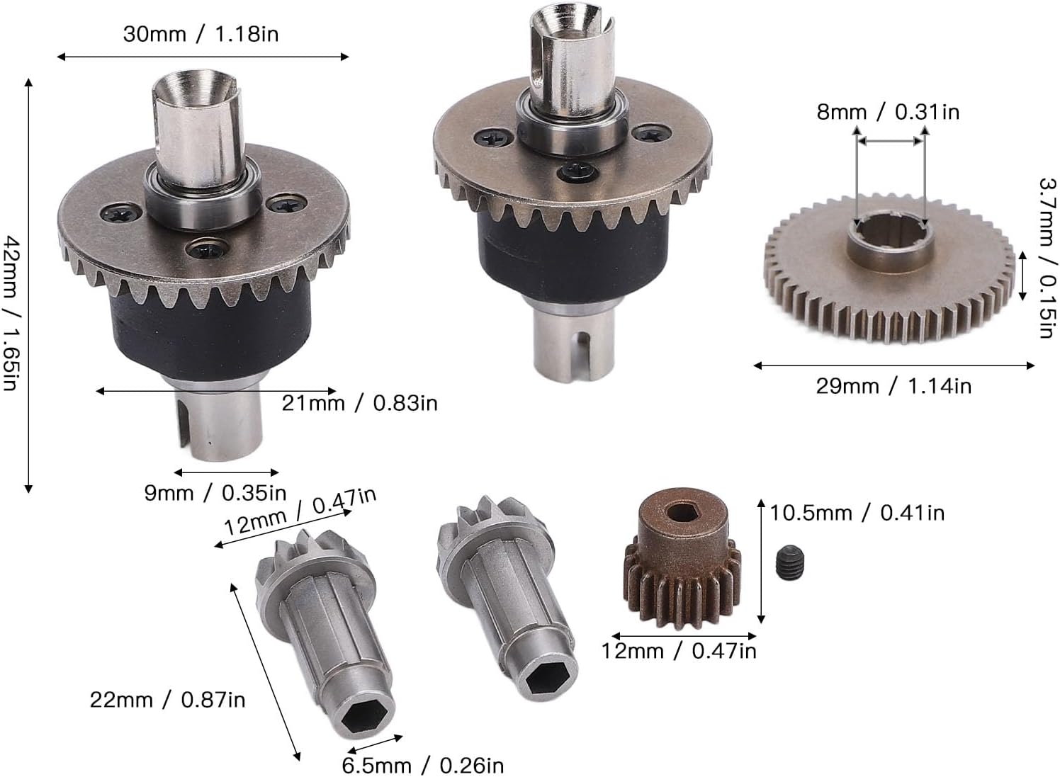[Easy Installation Process] Progettato con la comodità dell'utente in mente, questo set di ingranaggi RC presenta un semplice processo di installazione. I componenti con precisione si adattano perfettamente, permettendoti di sostituire rapidamente gli ingranaggi vecchi o usurati senza alcun strumento o competenza tecnica richiesta. [Kit di aggiornamento completo] Questo set di ingranaggi differenziali RC include tutto il necessario per un aggiornamento senza soluzione di continuità: 2 differenziali ad alte prestazioni, 1 ingranaggio di grandi dimensioni, 1 marcia motore, 1 vite di set e 2 ingranaggi di precisione. Per migliorare le prestazioni del veicolo RC con componenti metallici durevoli che resistono a intense condizioni di guida. [Costruzione in lega premium] Realizzati con materiali in lega di alta qualità, questi ingranaggi differenziali RC offrono una resistenza e una durata eccezionali. La costruzione robusta resiste all'usura, offrendo prestazioni affidabili anche durante l'uso prolungato e le corse ad alta velocità con il tuo veicolo RC. [Ad alta durezza a lungo duratura] Prodotto utilizzando la tecnologia avanzata della metallurgia in polvere, questi ingranaggi differenziali vantano una durezza superiore e una resistenza all'usura. La composizione del materiale ad alta densità garantisce una durata estesa e prestazioni coerenti, rendendoli un investimento intelligente per gli appassionati di RC seri. [Compatibilità] In particolare per le auto RC in 1/16, questo set di ingranaggi garantisce un montaggio impeccabile con SCY 16101, 16102 e 16103. Il design preciso garantisce un funzionamento regolare e un trasferimento di energia ottimale, rendendolo una sostituzione ideale o aggiornamento per il di differenziale auto RC esistente.
