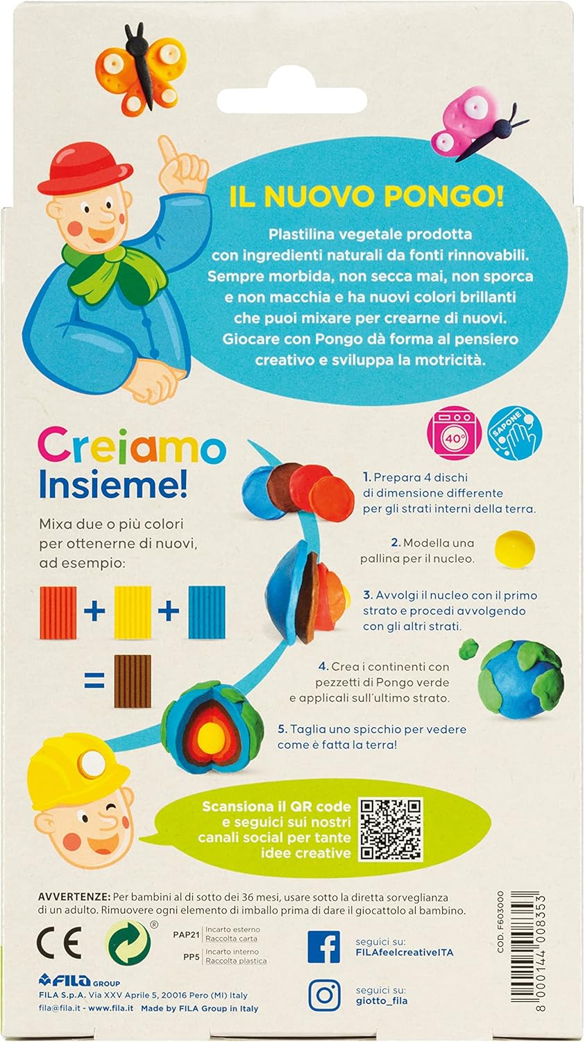 Plastilina vegetale prodotta con ingredienti naturali da fonti rinnovabili Sempre morbida, non secca mai, non macchia e ha nuovi colori brillanti da mescolare per crearne di nuovi Giocare con Pongo dà forma al pensiero e sviluppa le capacità psicomotorie Astuccio da 264 kg con 8 colori classici: giallo, rosso, verde, nero, bianco, ciano, viola, magenta Sul retro c'è il tutorial fotografico e il QR code con video link al video per creare il pianeta Terra stratificata