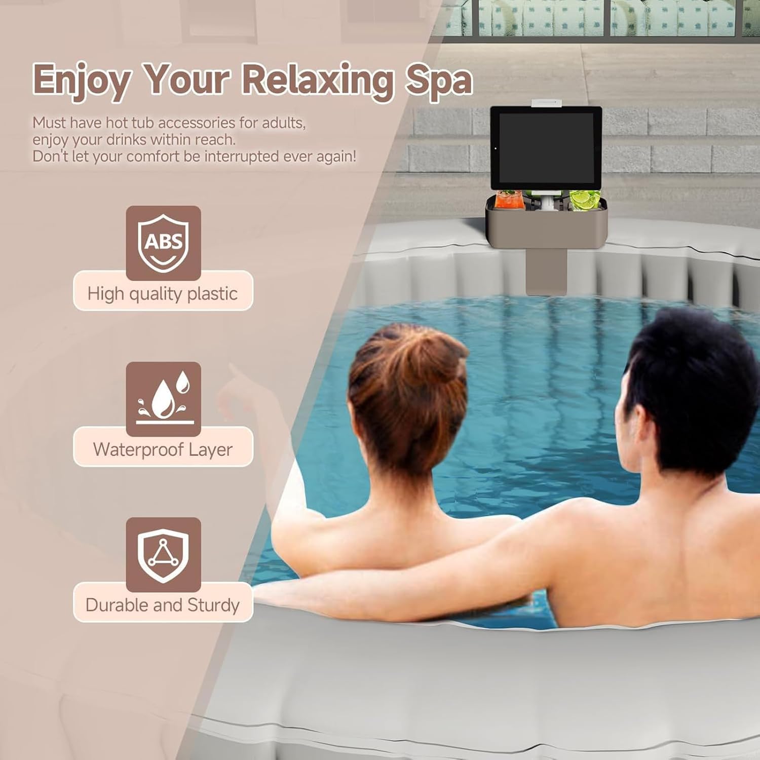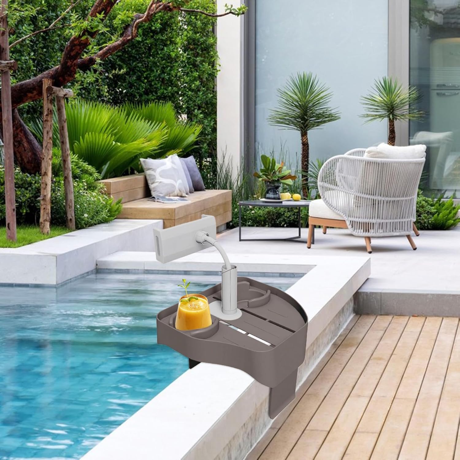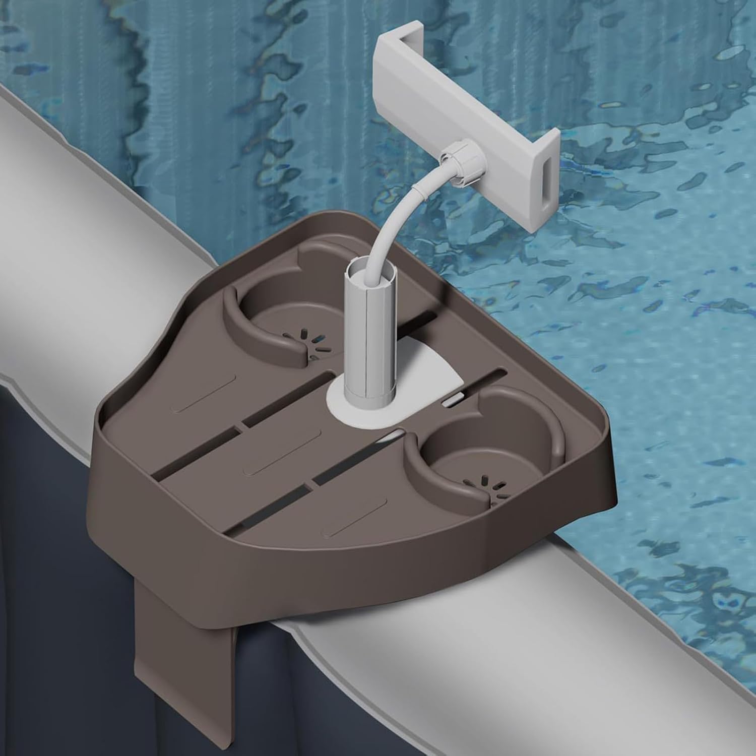 Compatibilità Universale:Adatto alla maggior parte degli smartphone, offre tenuta salda e stabilità senza compromettere funzionalità del dispositivo in ambienti acquatici Stabilità Assoluta: Materiale ABS ad alta resistenza abbinato a pastiglie antiscivolo in silicone e bordi rialzati, offre sicurezza mantenendo il telefono stabile durante attività ricreative Trasporto semplice:Unisce praticità e portabilità per uso fluido in piscina, campeggi, balconi e bagni, mantenendo un profilo sottile e maneggevole senza ingombri Relax in Piscina: Con supporto per telefono e vassoio regolabile abbinato a portabicchieri, migliora l'esperienza di svago integrando design multifunzionale in ogni configurazione per giornate in acqua Sicurezza:Dotato di meccanismo a morsetto sicuro, il supporto si adatta perfettamente a piscine gonfiabili e vasche idromassaggio, consentendo regolazioni veloci o rimozione in qualsiasi momento