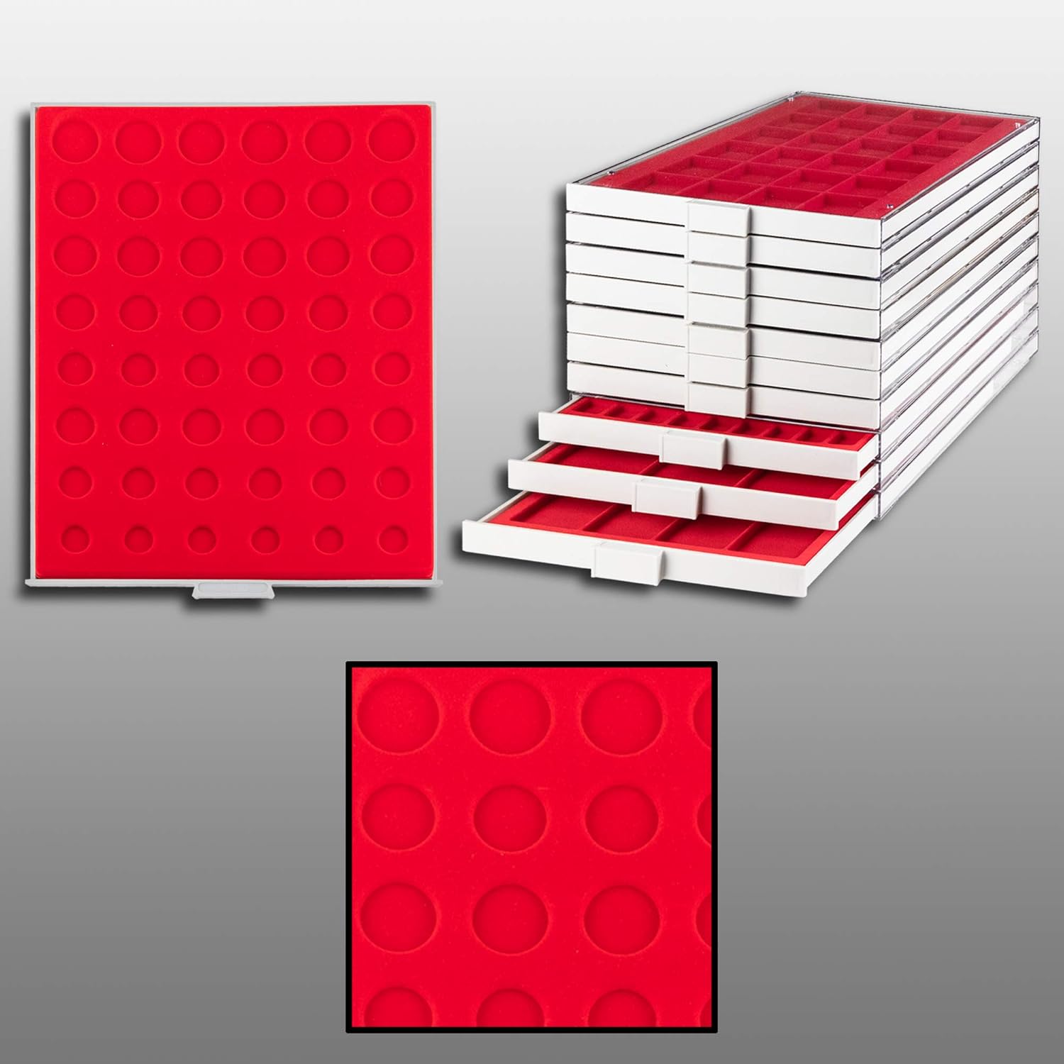 Portamonete con struttura in plastica trasparente, inserto in plastica grigia (cassetto) e inserto in velluto rosso con 48 scomparti rotondi per 6 set di monete Euro. Formato: 237 x 296 x 22 mm. Completamente combinabile con Lighthouse, Lindner ...