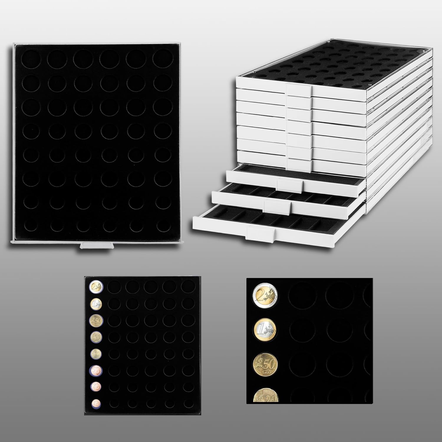 Portamonete con struttura in plastica trasparente, inserto in plastica grigia (cassetto) e inserto in velluto nero con 48 scomparti rotondi per 6 set di monete Euro. Formato: 237 x 296 x 22 mm. Completamente combinabile con Leuchtturm, Lindner ...