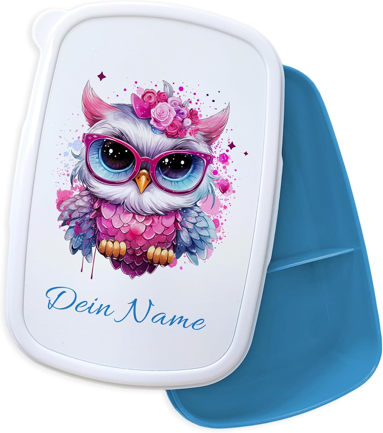 Bellissimo motivo a forma di gufo con il nome mostrato sopra. Set con portapane e borraccia. Borraccia in alluminio, rivestita di bianco, contenuto: 500 ml
