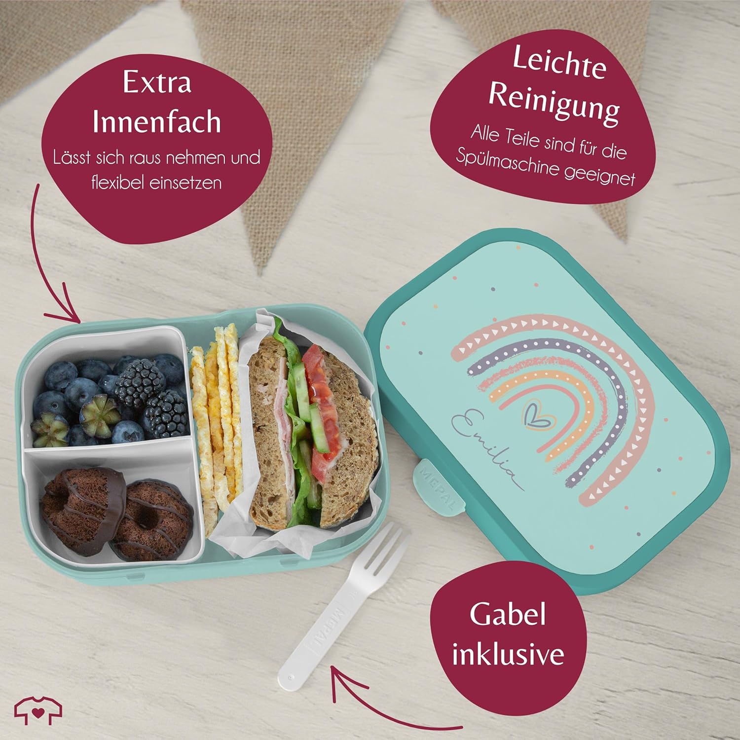 | Enthaltene Komponenten | Bento-Einsatz, Brotdose, Snack-Gabel |