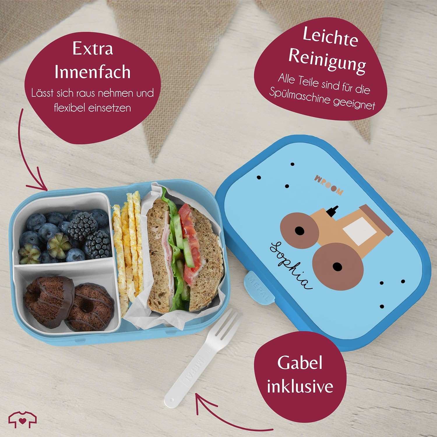 REGALO DEL TRATTORE: con questo fantastico motivo del trattore farai sicuramente sorridere i volti degli appassionati del trattore. Inserto Bento: questo bellissimo contenitore per il pranzo per bambini consente di separare il cibo grazie all'inserto Bento rimovibile e può quindi essere utilizzato in vari modi. Che si tratti del classico pranzo o della frutta fresca e secca per la scuola, grazie agli scomparti tutto rimane fresco e appetitoso. Forchetta snack: il contenitore per il pranzo ti invita a gustare un'ampia varietà di cibi con la piccola forchetta snack. Il contenitore per snack non è adatto al microonde. Per riscaldare il cibo è quindi necessario toglierlo dal contenitore del pranzo. Lavabile in lavastoviglie: la pulizia del contenitore per il pranzo dei bambini può essere effettuata facilmente in lavastoviglie dopo l'uso. Sia il contenitore per il pranzo, l'inserto bento che la forchetta sono lavabili in lavastoviglie e quindi facili e igienici da pulire. Il materiale del contenitore per il pranzo è privo di BPA e adatto agli alimenti, quindi non dovrai preoccuparti delle sostanze chimiche nocive. Leggero: con un peso di soli 250 grammi, il contenitore per il pranzo stampato può essere facilmente portato ovunque. Con una dimensione di 132 mm di larghezza, 178 mm di lunghezza e 61 mm di altezza, il contenitore per il pranzo è compatto e perfetto per la borsa della scuola o lo zaino. Con una stampa divertente, il contenitore per il pranzo è perfetto per l'inizio della scuola e per ogni altra pausa pranzo