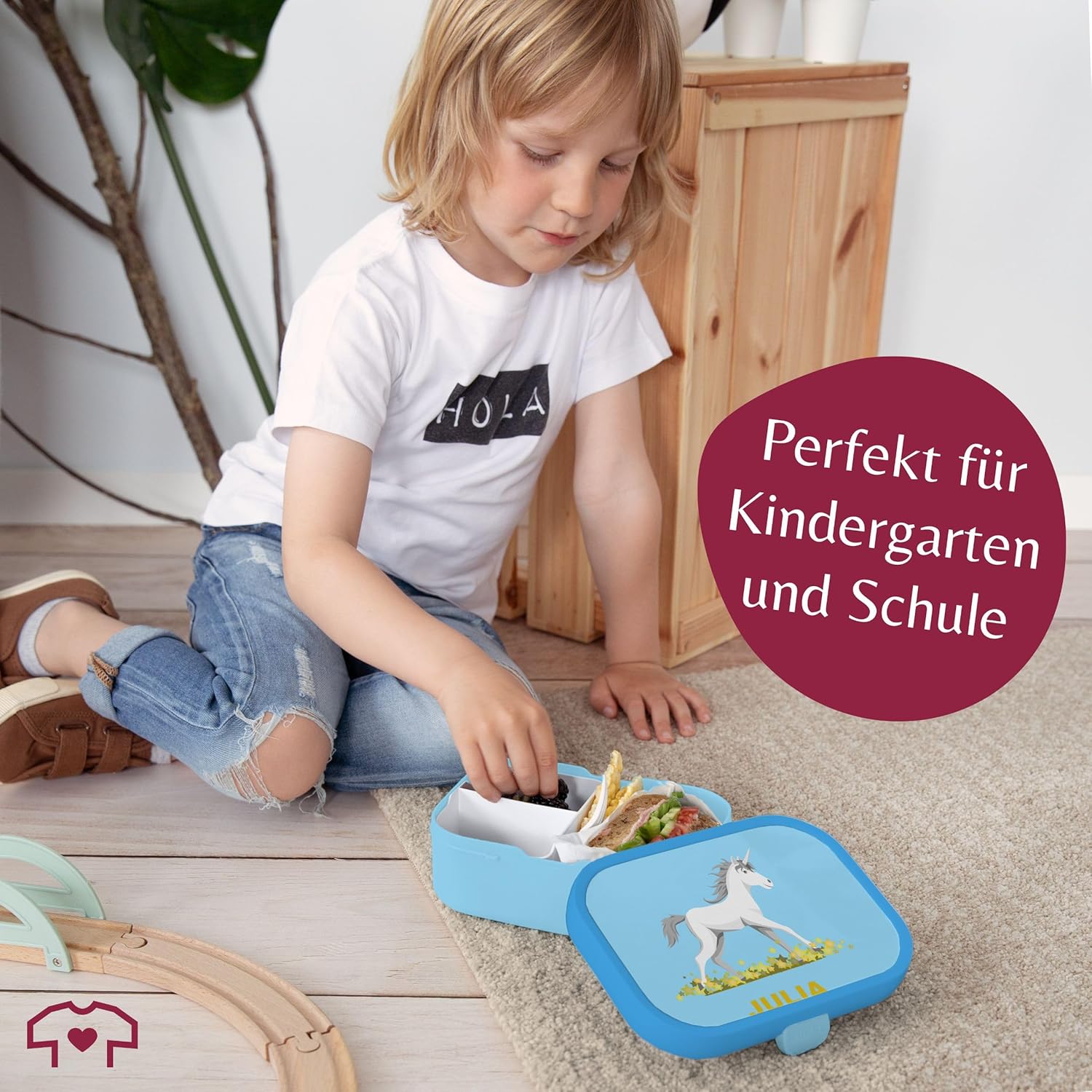Inserto Bento: questo bellissimo contenitore per il pranzo per bambini consente di separare il cibo grazie all'inserto Bento rimovibile e può quindi essere utilizzato in diversi modi. Che si tratti del classico pranzo o della frutta fresca e secca per la scuola, grazie agli scomparti tutto rimane fresco e appetitoso. Forchetta snack: il contenitore per il pranzo ti invita a gustare un'ampia varietà di cibi con la piccola forchetta snack. Il contenitore per snack non è adatto al microonde. Per riscaldare il cibo è quindi necessario toglierlo dal contenitore del pranzo. Lavabile in lavastoviglie: la pulizia del contenitore per il pranzo dei bambini può essere effettuata facilmente in lavastoviglie dopo l'uso. Sia il contenitore per il pranzo, l'inserto bento che la forchetta sono lavabili in lavastoviglie e quindi facili e igienici da pulire. Il materiale del contenitore per il pranzo è privo di BPA e adatto agli alimenti, quindi non dovrai preoccuparti delle sostanze chimiche nocive. Leggero: con un peso di soli 250 grammi, il contenitore per il pranzo stampato può essere facilmente portato ovunque. Con una dimensione di 132 mm di larghezza, 178 mm di lunghezza e 61 mm di altezza, il contenitore per il pranzo è compatto e perfetto per la borsa della scuola o lo zaino. Con una stampa divertente, il portapranzo è perfetto per l'inizio della scuola e per ogni altra pausa pranzo. Facile da aprire: grazie al sistema di chiusura, aprire il portapranzo è un gioco da ragazzi. Il coperchio può essere completamente rimosso, il che è particolarmente pratico quando si mangia fuori dal contenitore per il pranzo. Gli inserti separatori e la forchetta snack inclusa assicurano che il tuo spuntino rimanga appetitoso e fresco