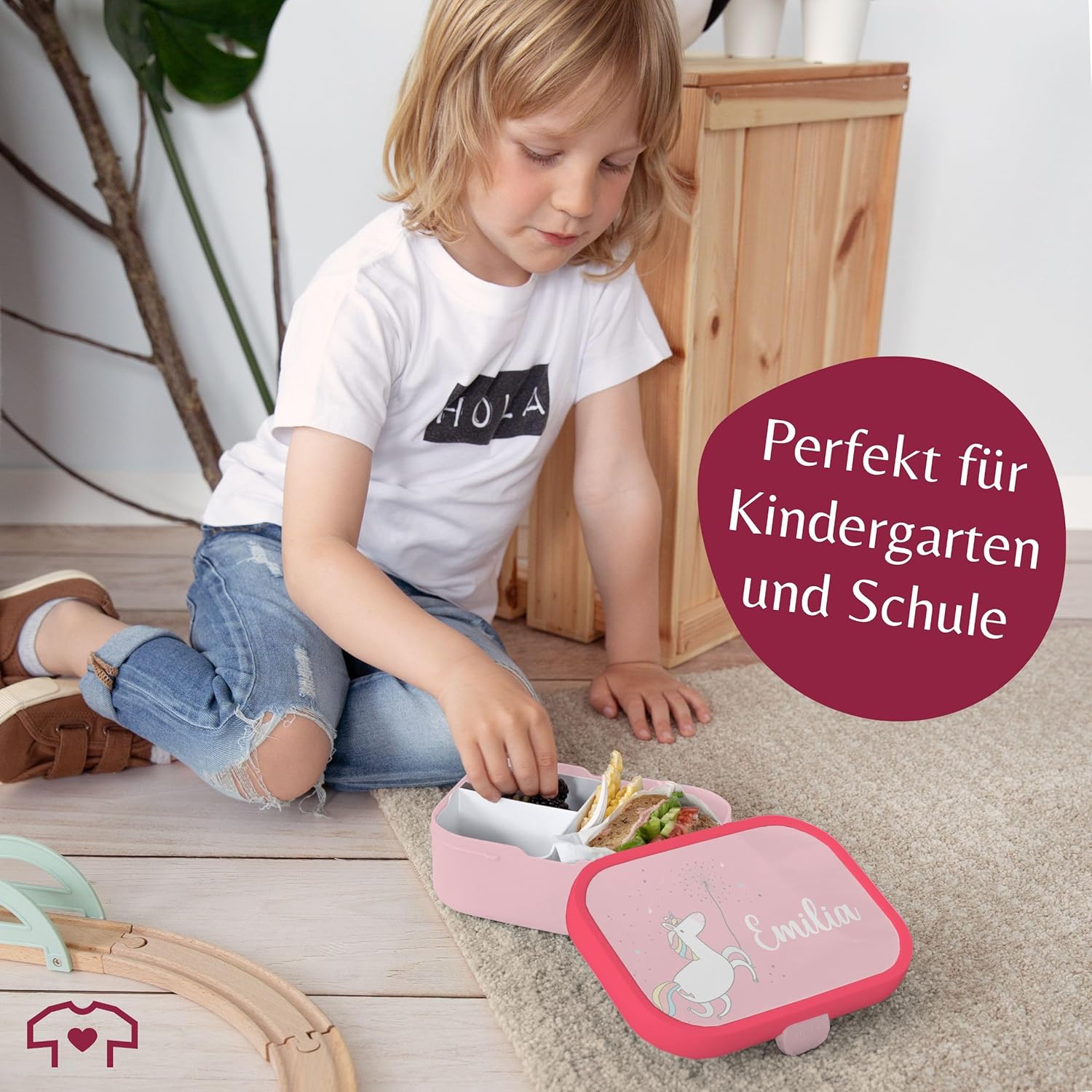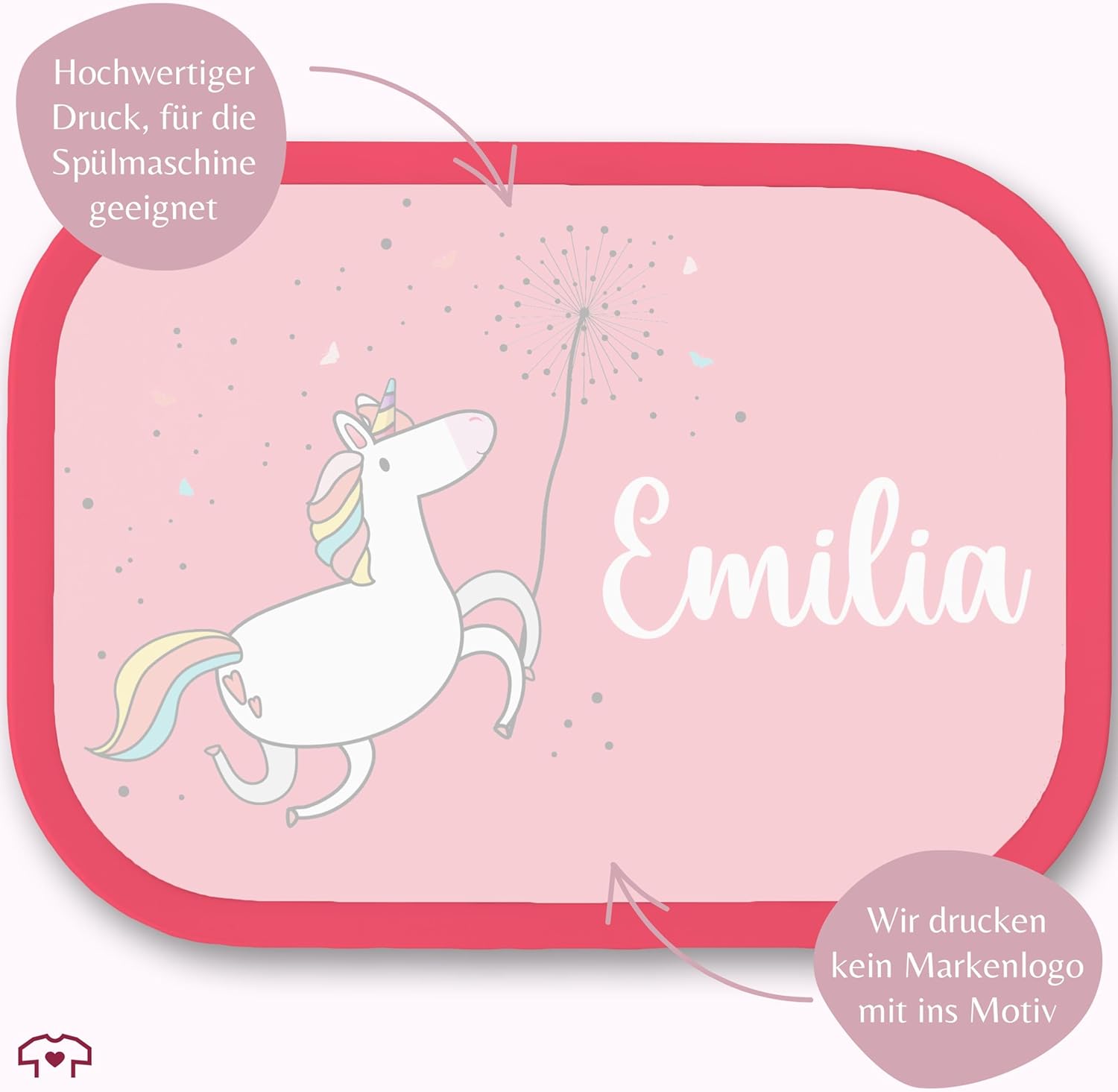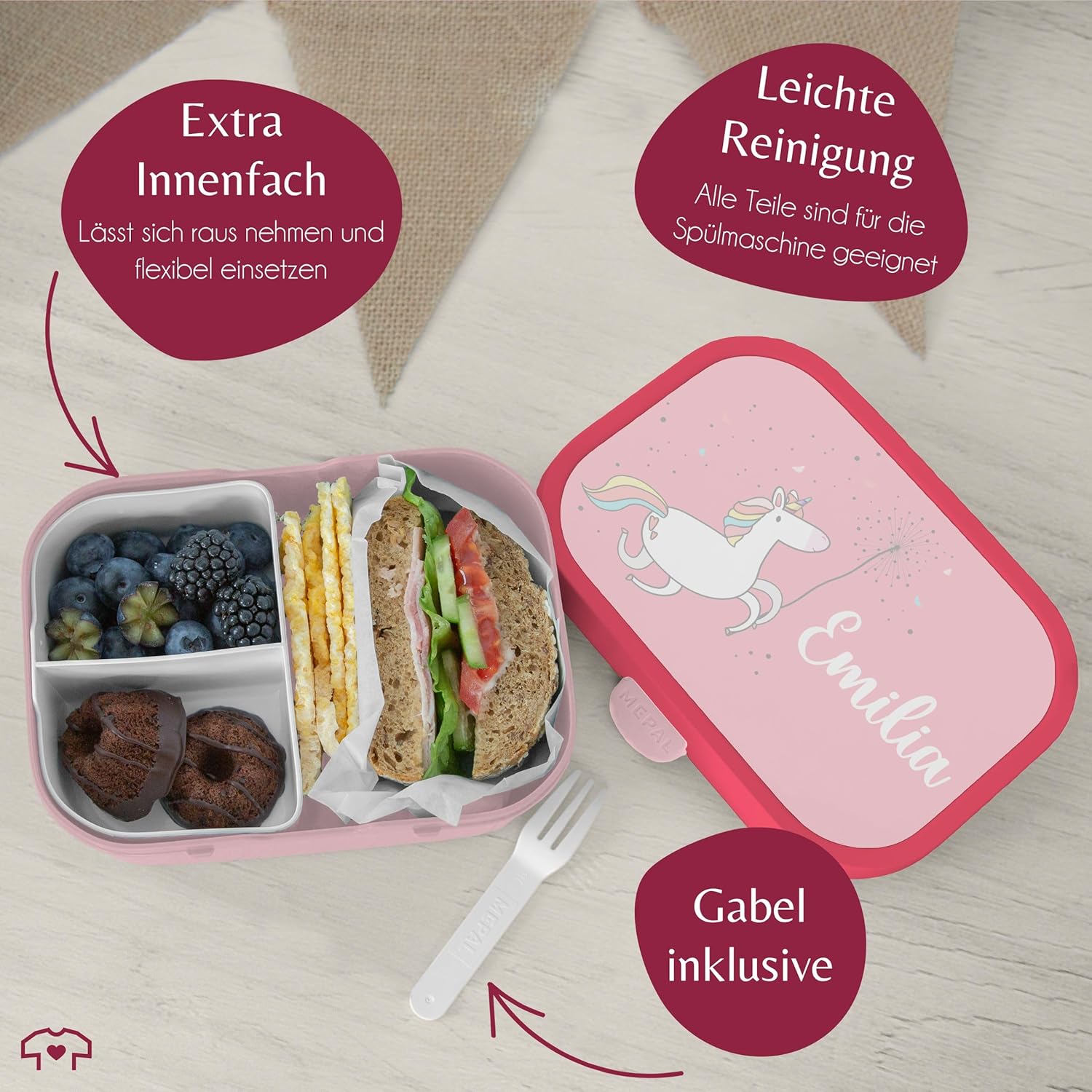 ✔️ REGALI UNICORNO: questo dolce motivo con unicorno, nome e dente di leone è un'ottima idea regalo personalizzabile per grandi e piccini. Inserto Bento: questo bellissimo contenitore per il pranzo per bambini consente di separare il cibo grazie all'inserto Bento rimovibile e può quindi essere utilizzato in vari modi. Che si tratti del classico pranzo o della frutta fresca e secca per la scuola, grazie agli scomparti tutto rimane fresco e appetitoso. Forchetta snack: il contenitore per il pranzo ti invita a gustare un'ampia varietà di cibi con la piccola forchetta snack. Il contenitore per snack non è adatto al microonde. Per riscaldare il cibo è quindi necessario toglierlo dal contenitore del pranzo. Lavabile in lavastoviglie: la pulizia del contenitore per il pranzo dei bambini può essere effettuata facilmente in lavastoviglie dopo l'uso. Sia il contenitore per il pranzo, l'inserto bento che la forchetta sono lavabili in lavastoviglie e quindi facili e igienici da pulire. Il materiale del contenitore per il pranzo è privo di BPA e adatto agli alimenti, quindi non dovrai preoccuparti delle sostanze chimiche nocive. Leggero: con un peso di soli 250 grammi, il contenitore per il pranzo stampato può essere facilmente portato ovunque. Con una dimensione di 132 mm di larghezza, 178 mm di lunghezza e 61 mm di altezza, il contenitore per il pranzo è compatto e perfetto per la borsa della scuola o lo zaino. Con una stampa divertente, il contenitore per il pranzo è perfetto per l'inizio della scuola e per ogni altra pausa pranzo
