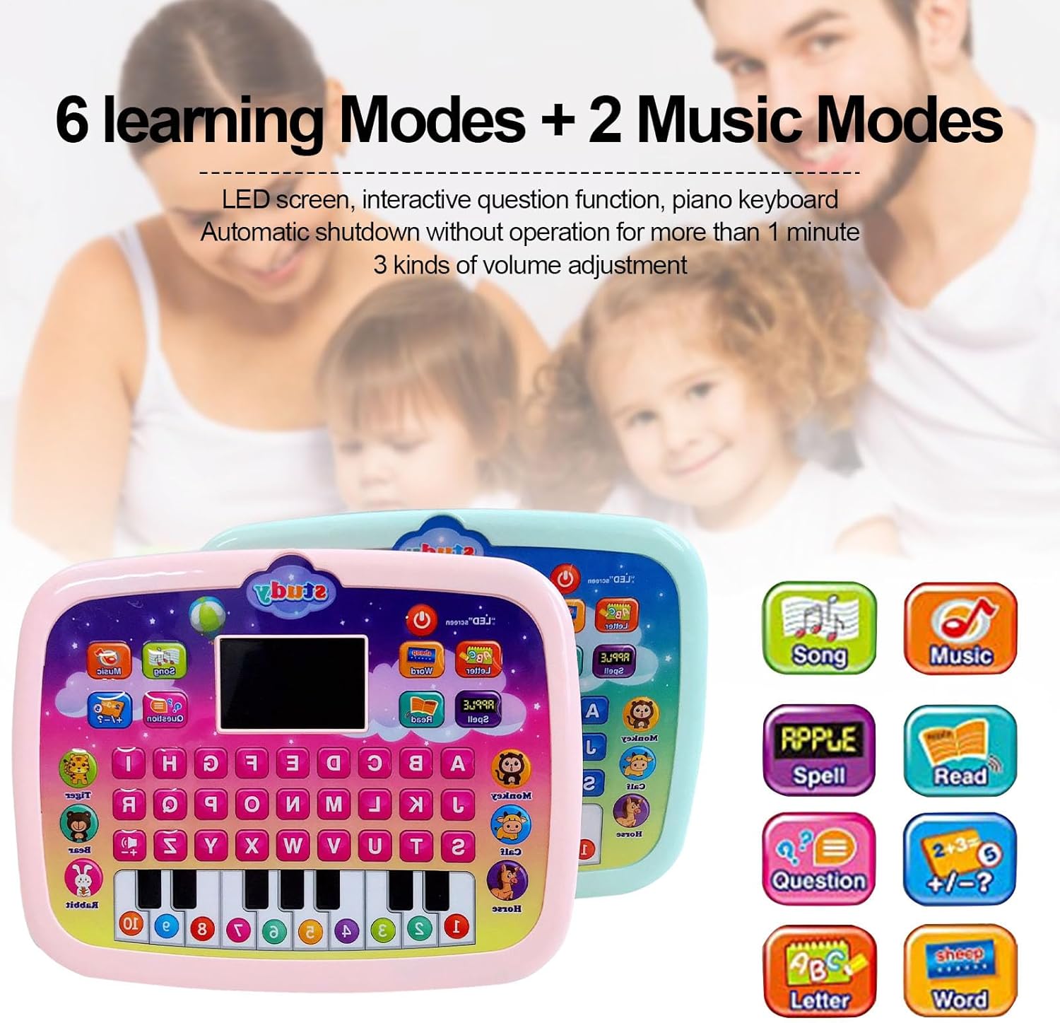 Giocattolo portatile a 8 modalità per bambini piccoli: giocattolo per tablet per bambini con 6 modalità di apprendimento + 2 modalità musicali, display LED, tastiera per pianoforte, spegnimento automatico senza funzionamento per più di 1 minuto e 3 impostazioni di volume. Ideale per l'educazione precoce: Toy Laptop include lettere, numeri e parole come animali, cibo, frutta, personaggi e beni, i bambini possono imparare molte abilità da esso. Utile giocattolo musicale: il laptop per bambini piccoli è dotato di più di 30 melodie, canzoni e suoni di animali interessanti, che sono molto attraenti per i bambini. Il tuo piccolo pianista può persino suonare la propria musica usando la tastiera del pianoforte simulata! Impressionante funzione domande: Baby Toys Tablet può aiutare a consolidare la conoscenza dei bambini ponendo alcune domande su lettere, parole e numeri, incoraggiando i bambini a essere tirocinanti attivi. Regalo ideale per i bambini: il tablet di apprendimento per bambini piccoli è adatto per bambini di 1, 2, 3 e 4 anni, in modo che i bambini possano iniziare un viaggio di apprendimento interessante da soli.