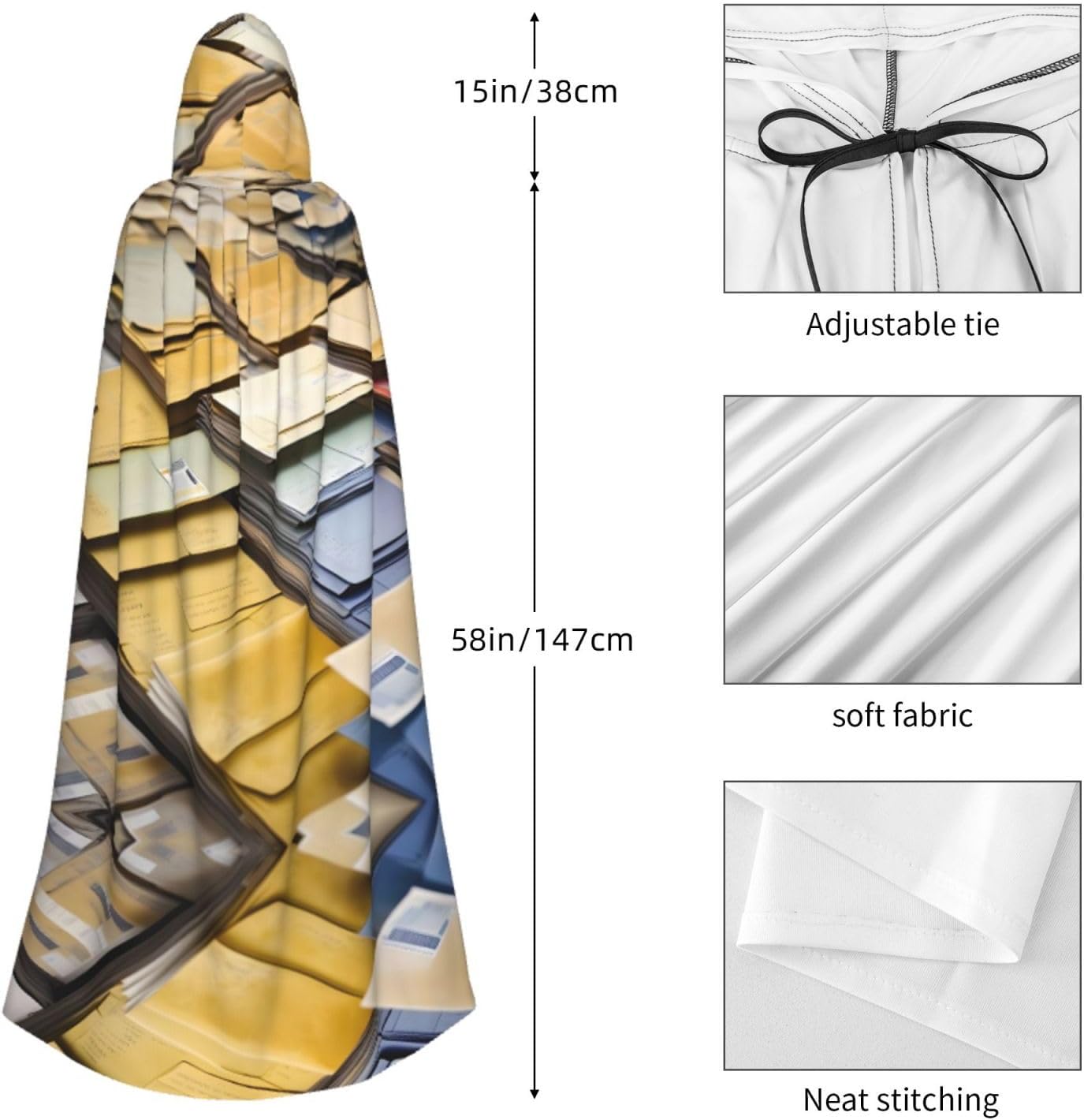 Il mantello con cappuccio per Halloween è realizzato con tessuto in poliestere morbido anche sulla pelle, prevenendo qualsiasi irritazione. Il mantello presenta un ampio cappuccio e uno stile annodato senza cerniere per un design sofisticato ed elegante. Con la sua dimensione universale, offre una copertura completa, adatta a tutti, assicurandoti di distinguerti tra la folla. Questo mantello con stampa di cancelleria postale non è solo per Halloween; è abbastanza versatile per cosplay, spettacoli teatrali, balli in maschera, feste a tema e molto altro ancora.