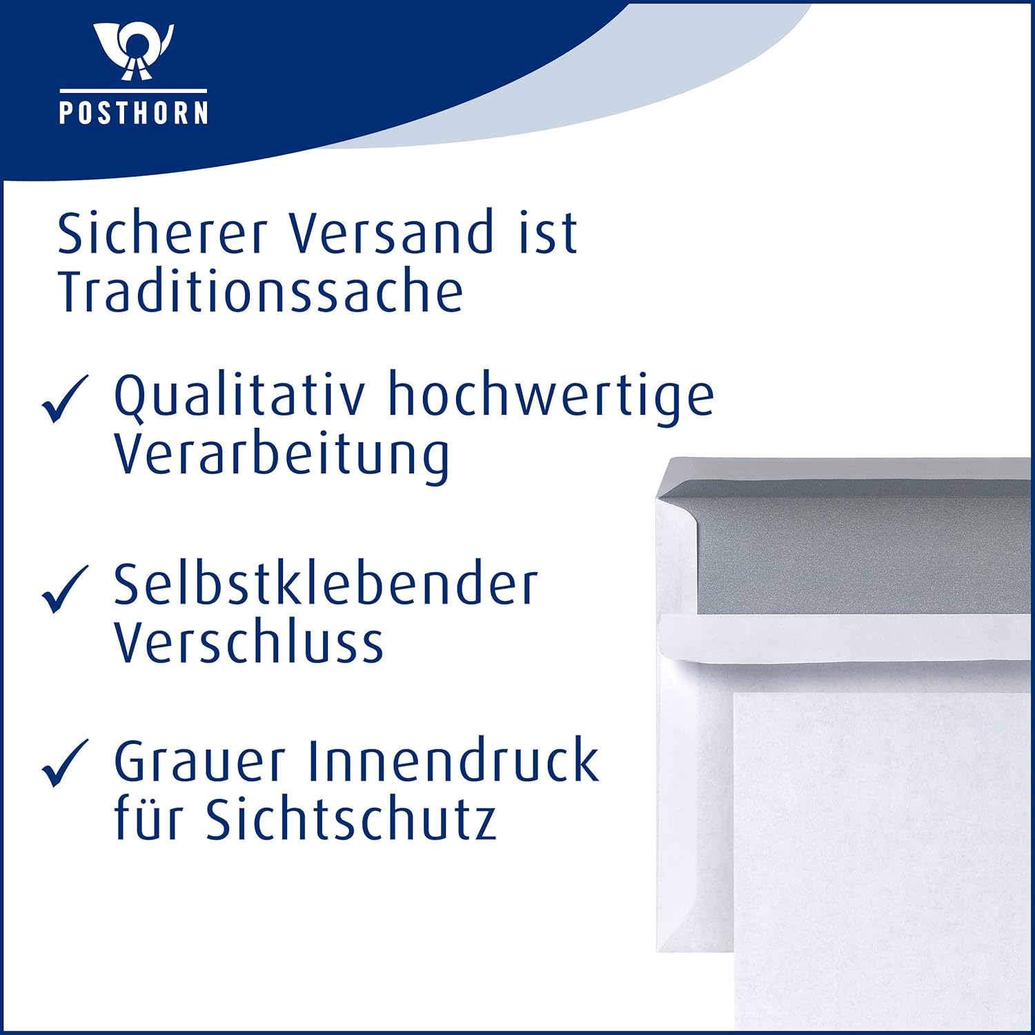 Tradizionalmente buono: come marchio tradizionale, Posthorn è noto da decenni per buste di alta qualità in varietà e di altissima qualità, realizzate in Germania. Protezione extra: la busta Posthorn C6 protegge il contenuto da occhi indiscreti con stampa interna grigia e garantisce una spedizione sicura grazie alla lavorazione di alta qualità. Forte aderenza: la chiusura autoadesiva consente di chiudere facilmente la busta piegando la parte inferiore del lembo verso l'alto e premendo la parte superiore. Spedizione versatile: che si tratti di corrispondenza quotidiana, posta aziendale, mailing o inviti, le buste neutre C6 sono la scelta giusta per molte preoccupazioni. Contenuto della confezione e dettagli: buste Posthorn C6 (114 x 162 mm), buste senza finestra e con doppia aletta autoadesiva, stampa interna grigia per una spedizione sicura, 1000 pezzi
