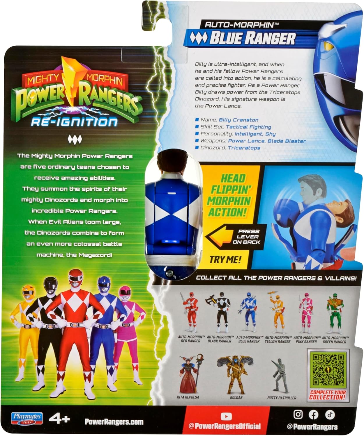 NUOVE POWER RANGERS: I tuoi eroi preferiti tornano in versioni inedite ispirate alla nuova serie rimasterizzata Mighty Morphin! PERSONAGGIA: L'intelligente e metodico Billy Cranston, alias il Ranger Blu. Funzione auto morphin: 2 statuette in 1! Stringe le gambe per attivare il cambio di testa e guardala trasformarsi all'istante, passando dal viso del Ranger al suo casco iconico. ACCESSORI INCLUSI: La tua figura viene fornita con le sue 2 armi da combattimento. Dimensioni: la tua figura misura 15 cm.