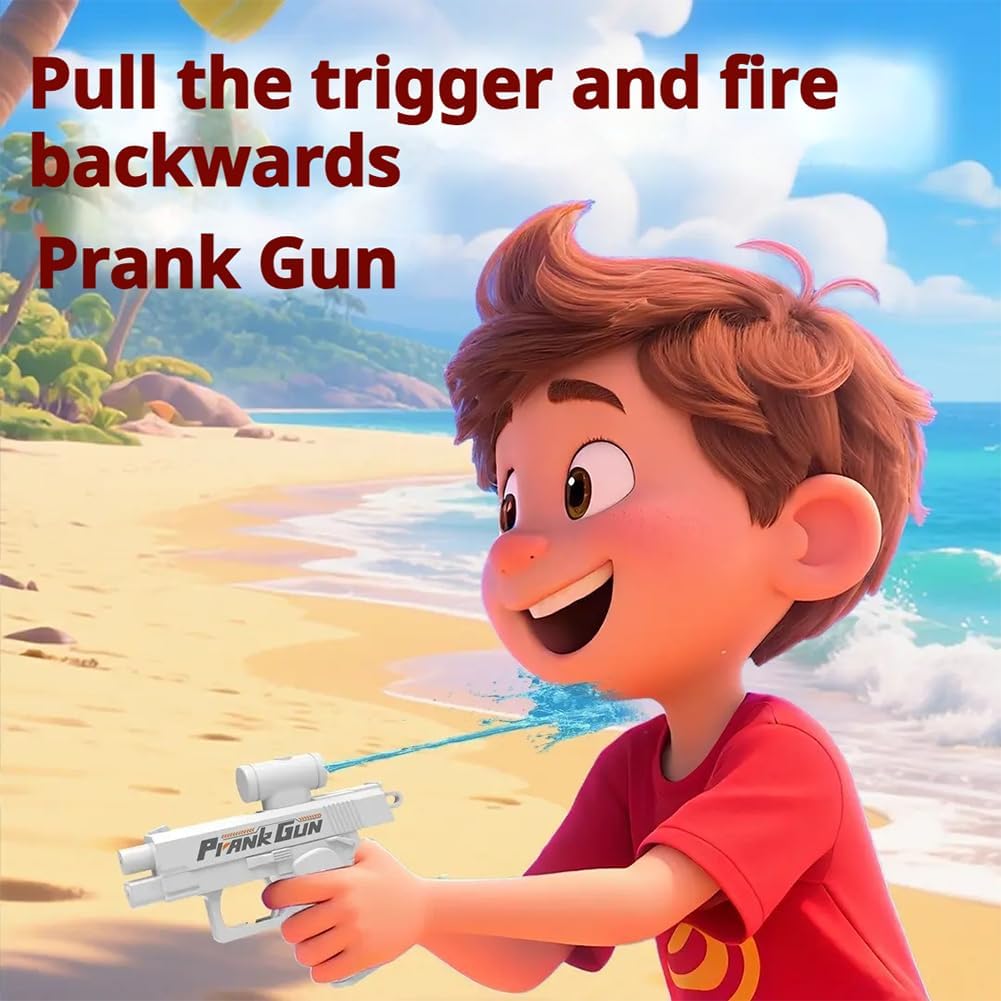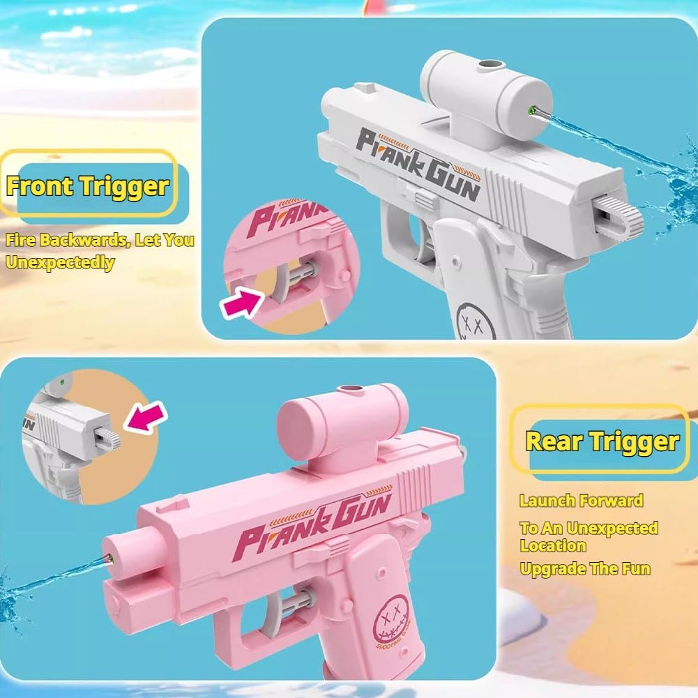 Fun-filled Prank Water Gun — Perfect for lighthearted tricks and hilarious water battles! Great for parties, family gatherings, and summer outings—bring endless laughs everywhere you go! Unique Reverse Spray Design — Surprises everyone with a water that shoots water back at the shooter, creating hilarious and unforgettable moments Dual-Switch Operation — Features two separate switches: the front switch sprays water backwards, including towards the user, while the rear switch fires water forward as expected—multiple ways to play! Durable & Safe Material — Made with high-quality, sturdy plastic, this water gun is built to withstand rough play and drops, ensuring hours of safe fun without worry Lightweight & Portable — Compact and easy to carry, perfect for parks, pools, beaches, or backyard fun—enhance your outdoor water battles and create unforgettable summer memories!