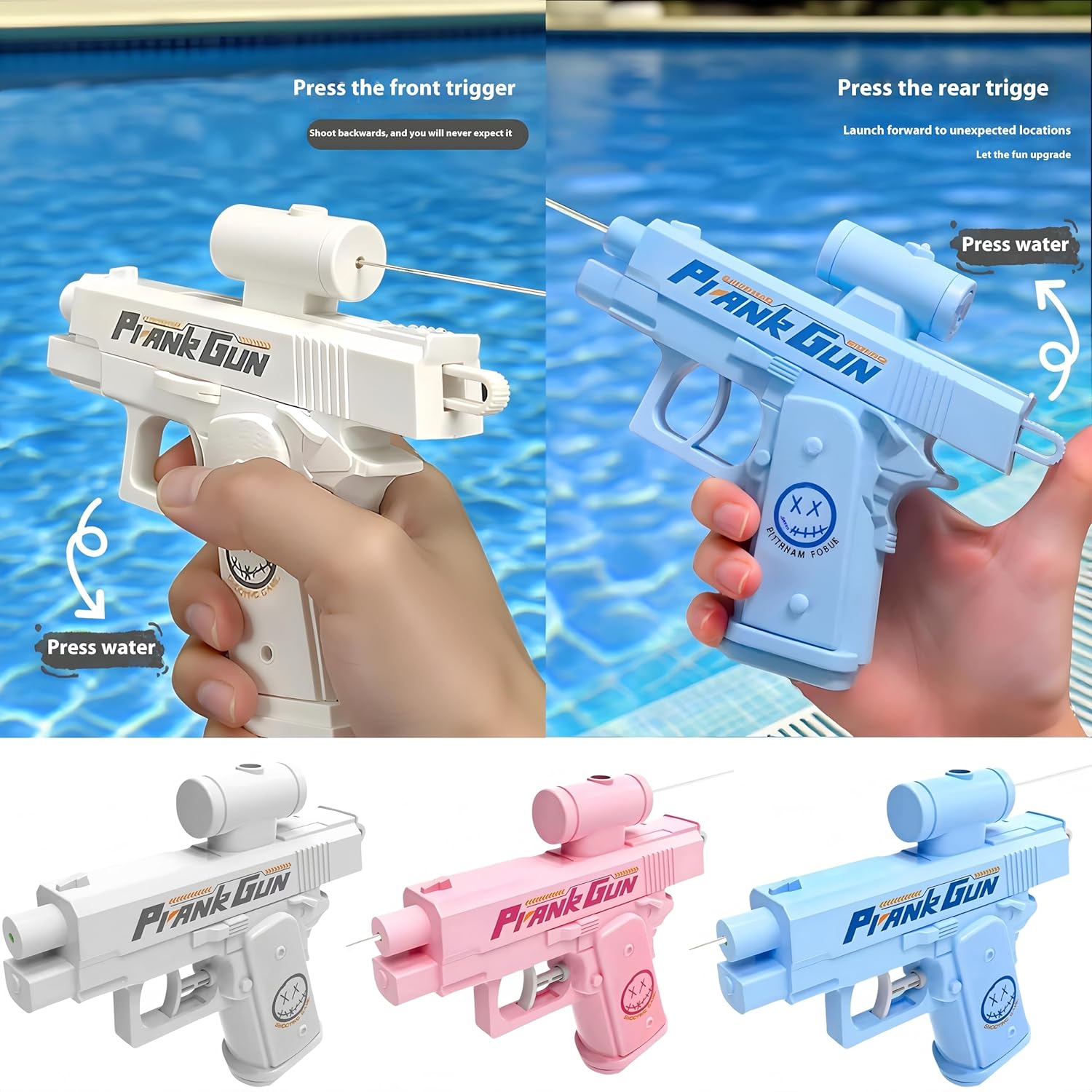 Materiale durevole e sicuro: realizzato in plastica resistente di alta qualità, questa pistola ad acqua è progettata per resistere a giochi violenti e cadute e garantire ore di divertimento sicuro. Divertente pistola ad acqua: perfetta per divertenti trucchi e divertenti battaglie d'acqua. Ideale per feste, riunioni di famiglia e gite estive, per ridere folli su ogni lato Design unico del getto invertito: sorprendi tutti con un getto d'acqua che reindirizza l'acqua al lanciatore, creando momenti divertenti e indimenticabili. Funzionamento a doppio interruttore: con due interruttori separati: l'interruttore anteriore spruzza l'acqua all'indietro, anche all'utente, mentre l'interruttore posteriore spruzza l'acqua in avanti come previsto. Molteplici possibilità di gioco Leggero e portatile: compatto e facile da trasportare, ideale per parchi, piscine, spiagge o giochi in giardino. Abbellisci le tue battaglie d'acqua all'aperto e crea indimenticabili ricordi estivi