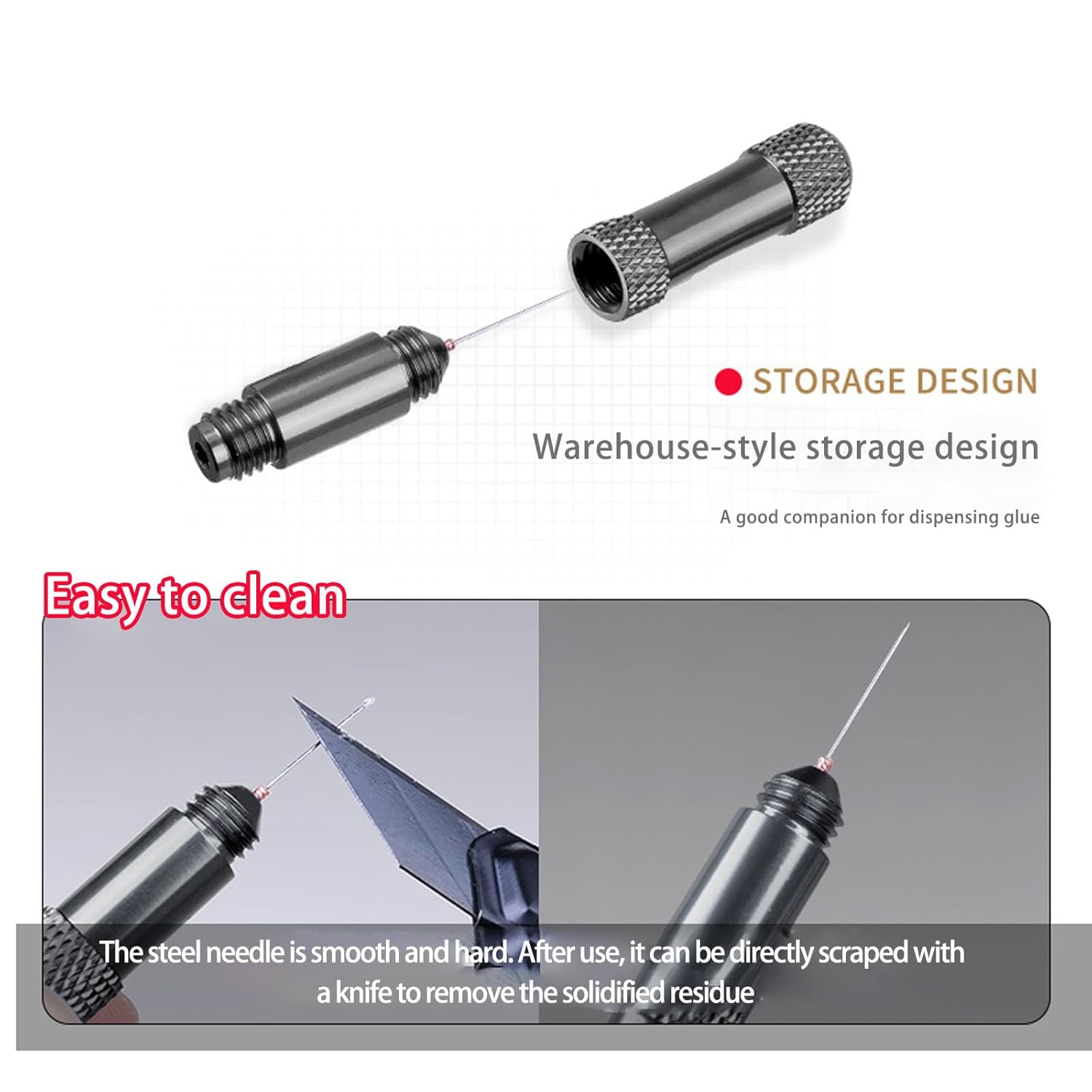 Ideale per gli appassionati di modelli di scala e la precisione del livello millimetro necessaria nelle applicazioni di rilegatura in miniatura Questo modello di Premium Metal, realizzato in metallo di alta qualità, garantisce prestazioni precise e durature per compiti di colla complicati con il suo design sottile a punta ad ago Il corpo ergonomico a forma di penna consente adesivi controllati, rendendo difficili da raggiungere mantenendo le dita pulite durante i progetti di hobby dettagliati Perfetto per il fissaggio di parti delicate del modello, componenti elettronici o gioielli in cui le tradizionali bottiglie di colla causano fuoriuscite disordinate Questo dispenser di colla leggera contiene una maniglia di stoccaggio in cui l'ago in acciaio è alloggiato in modo sicuro