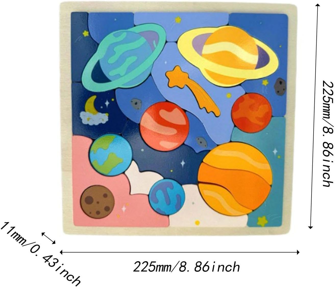 【Design divertente】: presenta otto pianeti del solare, aiutando i bambini a conoscere lo spazio in modo coinvolgente e pratico 【Dimensioni】: Misura 22,5 cm x 22,5 cm x 1,1 cm / 8,86 pollici x 8,86 pollici x 0,43 pollici, ideale per le mani piccole da afferrare e assemblare facilmente 【Puzzle educativi per bambini】: questo giocattolo didattico prescolare è un'attività educativa divertente che consente ai bambini di 【Migliora la cognizione】: questo puzzle in legno aiuta a sviluppare la coordinazione occhio-mano dei bambini, le capacità di problem solving e il pensiero spaziale 【Materiale】: Questo puzzle è realizzato in legno di qualità che resiste al gioco frequente mantenendo una lunga durata