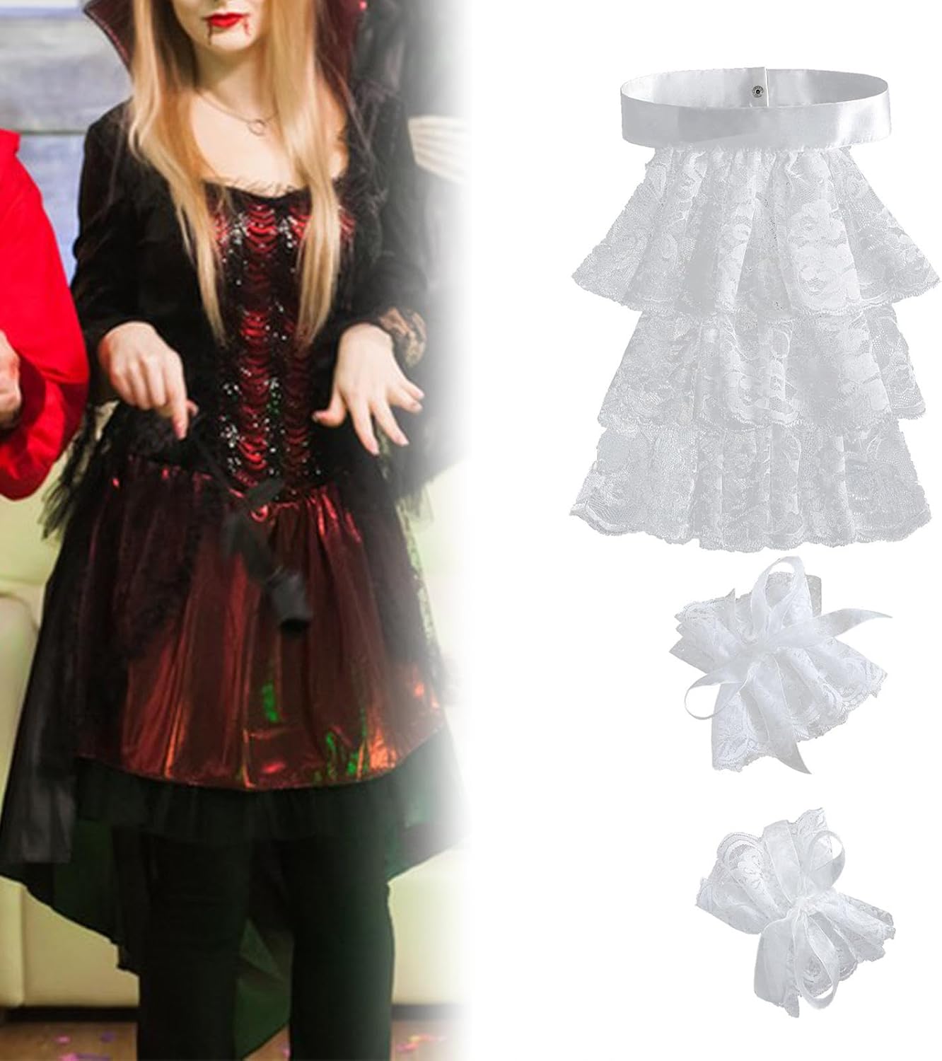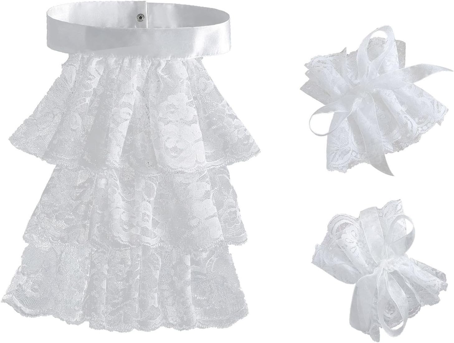 【Accessori versatili per costumi】: Set di jabot e polsini in pizzo, ideale per arricchire outfit steampunk, pirata o rivoluzionari. Ideale per costumi da pirata, feste a tema storico, abiti da vittoriano, eventi cosplay e balli in maschera. 【Materiale di qualità】: collo in pizzo coloniale realizzato in poliestere per garantire comfort e longevità mantenendo un aspetto elegante 【Set di accessori per costumi】: include un collo in pizzo bianco a tre strati e due polsini in pizzo bianco, che forniscono un aspetto coeso con questo set da tre pezzi 【Ideale per eventi a tema】: che tu stia partecipando a una rievocazione storica o a una festa in costume a tema, questo set di polsini in pizzo Jabot aggiunge un tocco al tuo ensemble 【Dimensioni del design elegante】: il collo misura 42 cm di circonferenza, con polsini delle maniche che misurano 19 cm di circonferenza e 12 cm di larghezza per la vestibilità