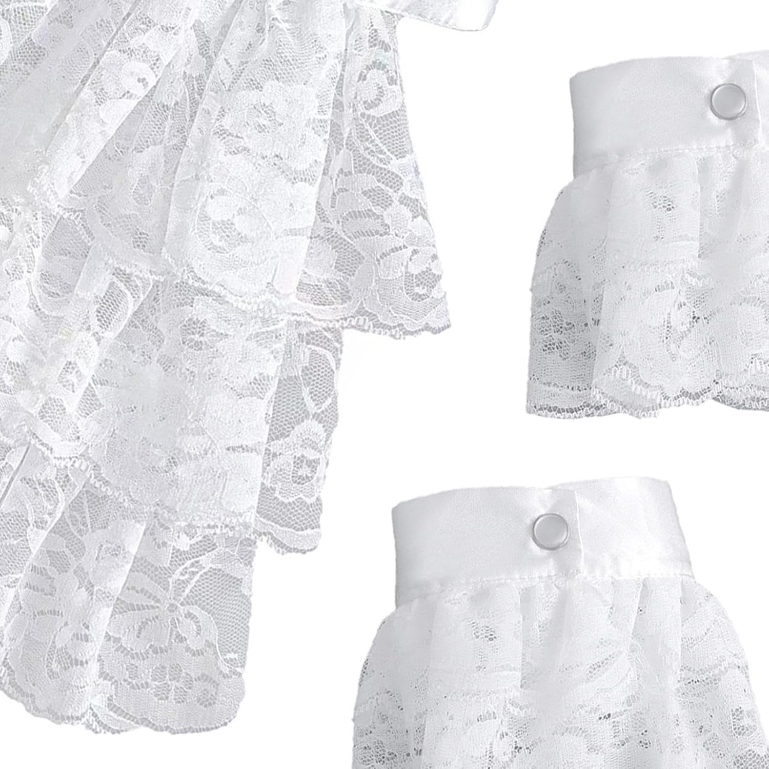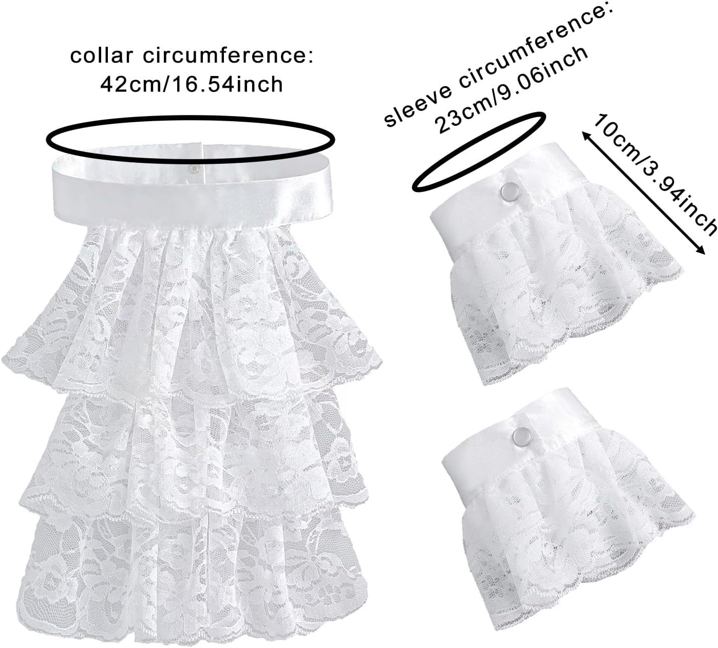 【Materiale di qualità】: collo in pizzo coloniale realizzato in poliestere per garantire comfort e longevità mantenendo un aspetto elegante 【Dimensioni del design elegante】: il collo misura 42 cm di circonferenza, con polsini delle maniche che misurano 23 cm di circonferenza cm di larghezza per la vestibilità 【Set di accessori per costumi】: include un collo in pizzo bianco a tre strati e polsini in pizzo bianco a due strati, che forniscono un aspetto coeso con questo set da tre pezzi 【Accessori versatili per costumi】: Set di jabot e polsini in pizzo, ideale per arricchire outfit steampunk, pirata o rivoluzionari. Ideale per costumi da pirata, feste a tema storico, abiti da vittoriano, eventi cosplay e balli in maschera. 【Ideale per eventi a tema】: che tu stia partecipando a una rievocazione storica o a una festa in costume a tema, questo set di polsini in pizzo Jabot aggiunge un tocco al tuo ensemble