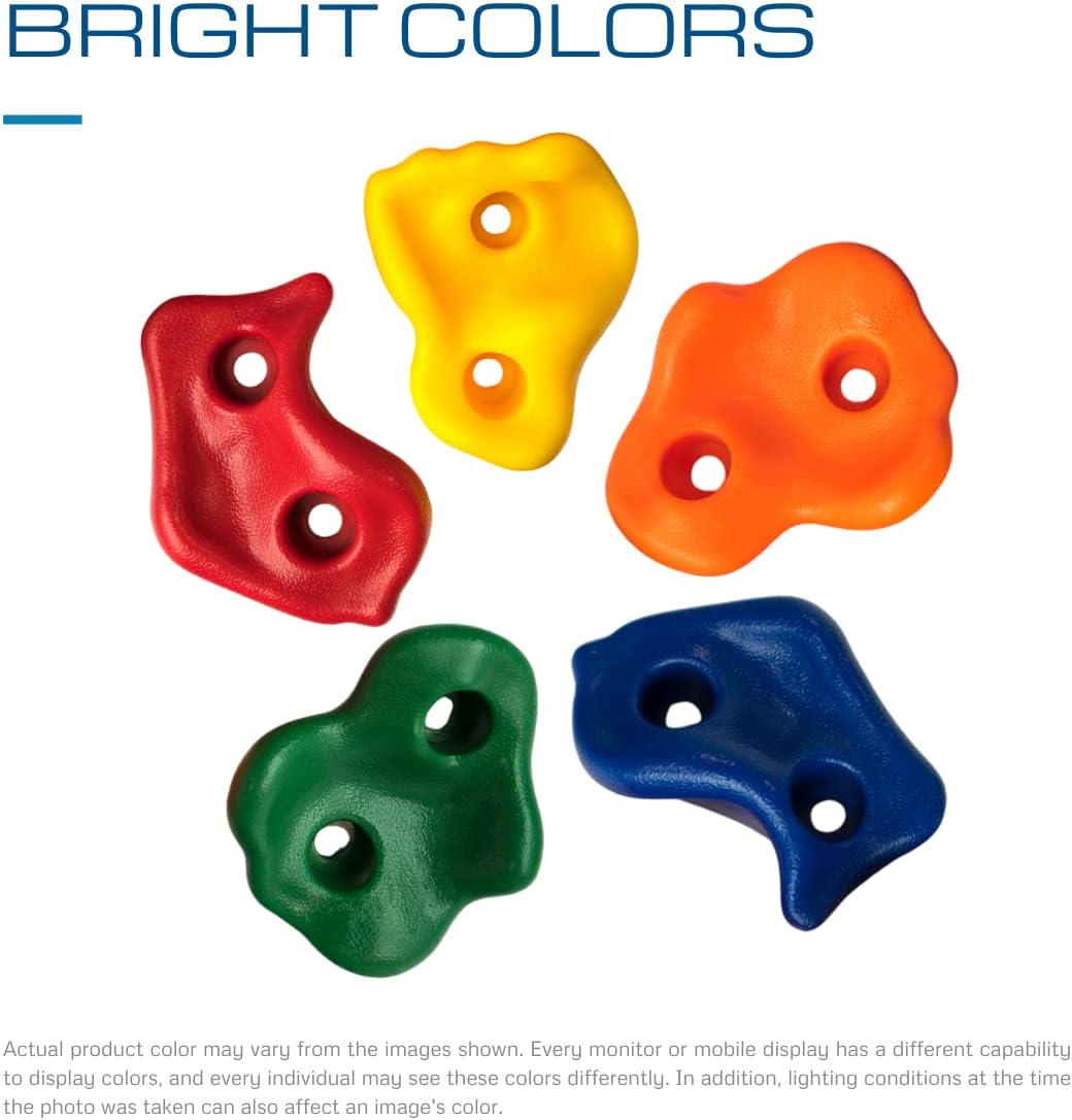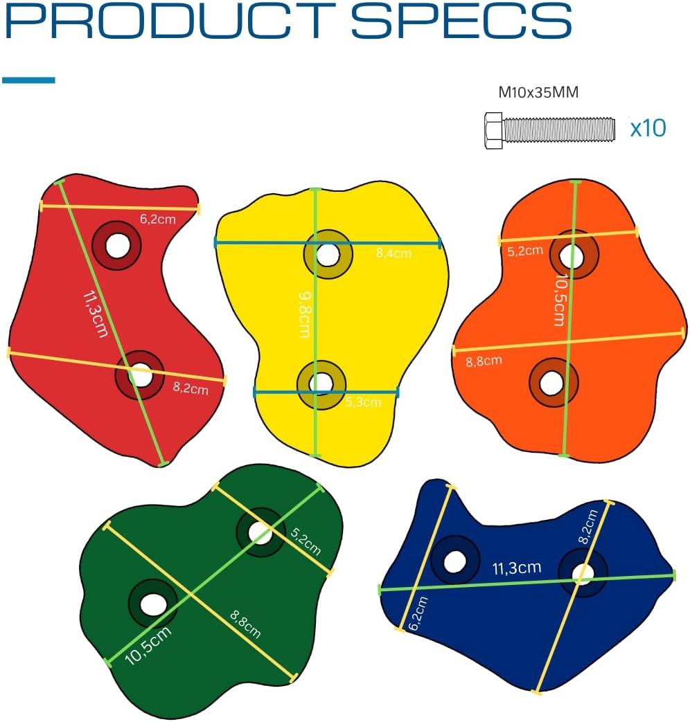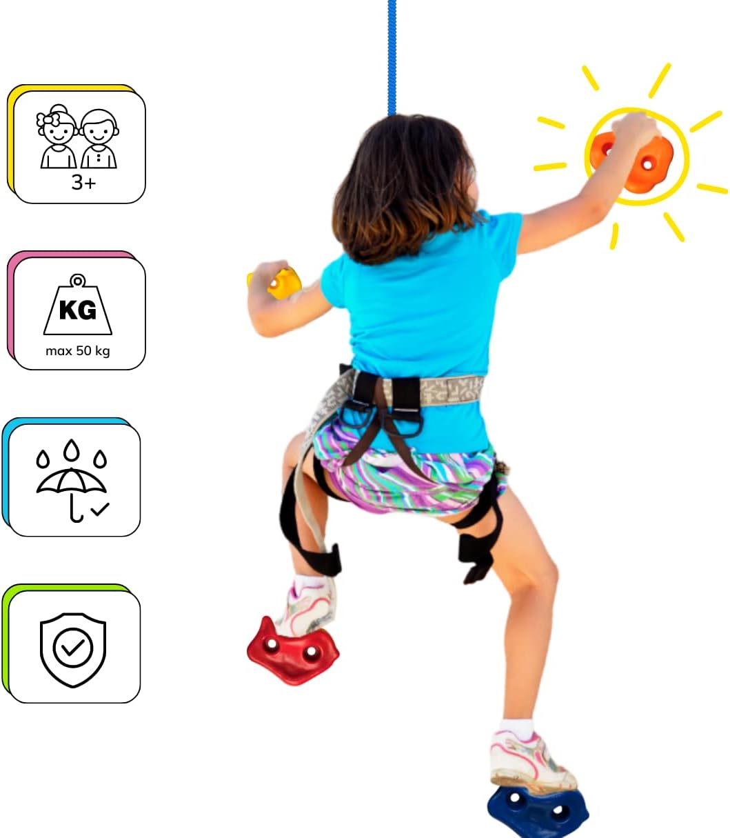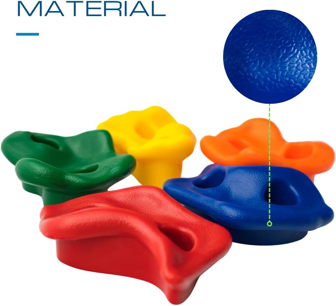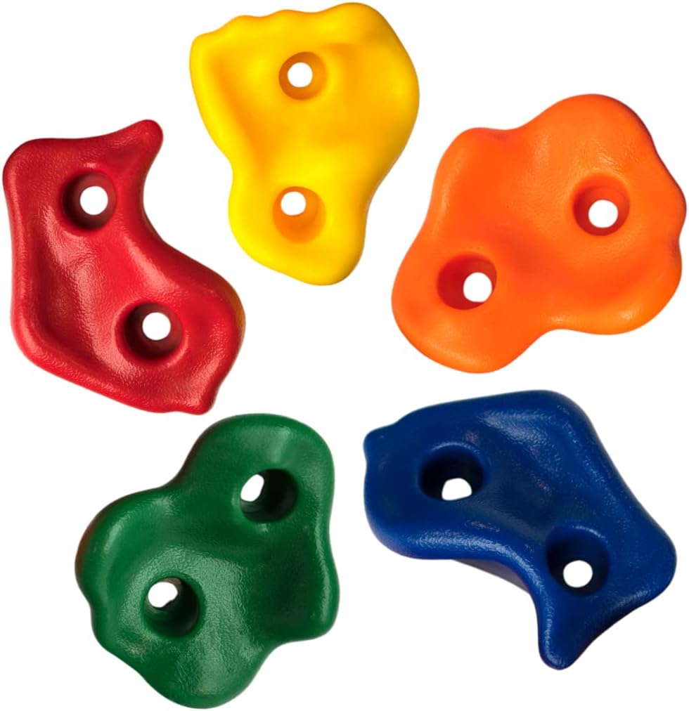 [PROMUOVE L'ATTIVITÀ E IL DIVERTIMENTO] - Le nostre pietre da arrampicata resistenti agli agenti atmosferici realizzate in robusta plastica offrono ai bambini un'emozionante avventura di gioco e stimolano la loro attività fisica e coordinazione. [DESIGN VERSATILE PER LA CREATIVITÀ] - Il set comprende 5 prese da arrampicata colorate di diverse forme e dimensioni, che possono essere montate su qualsiasi parete. I bambini possono creare la propria parete da arrampicata e affrontare costantemente nuove sfide. [LA SICUREZZA PRIMA] - Le nostre pietre da arrampicata sono accuratamente testate e forniscono una presa sicura. I genitori possono rilassarsi mentre i bambini rafforzano i muscoli e acquisiscono sicurezza attraverso il gioco. [DIVERTIMENTO INTERNO ED ESTERNO] - In giardino, nella stanza dei bambini o nel parco giochi, queste prese da arrampicata sono perfette per uso interno ed esterno. I bambini possono arrampicarsi e giocare tutto l'anno. [VALORE EDUCATIVO] - Il nostro kit da arrampicata non solo promuove lo sviluppo fisico, ma anche la creatività e le capacità di risoluzione dei problemi dei bambini. Un regalo ideale per avventurieri giovani e attivi!