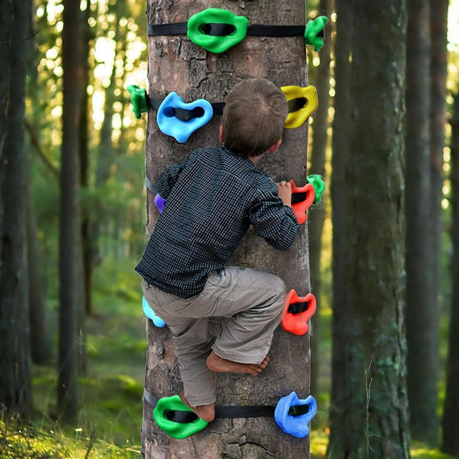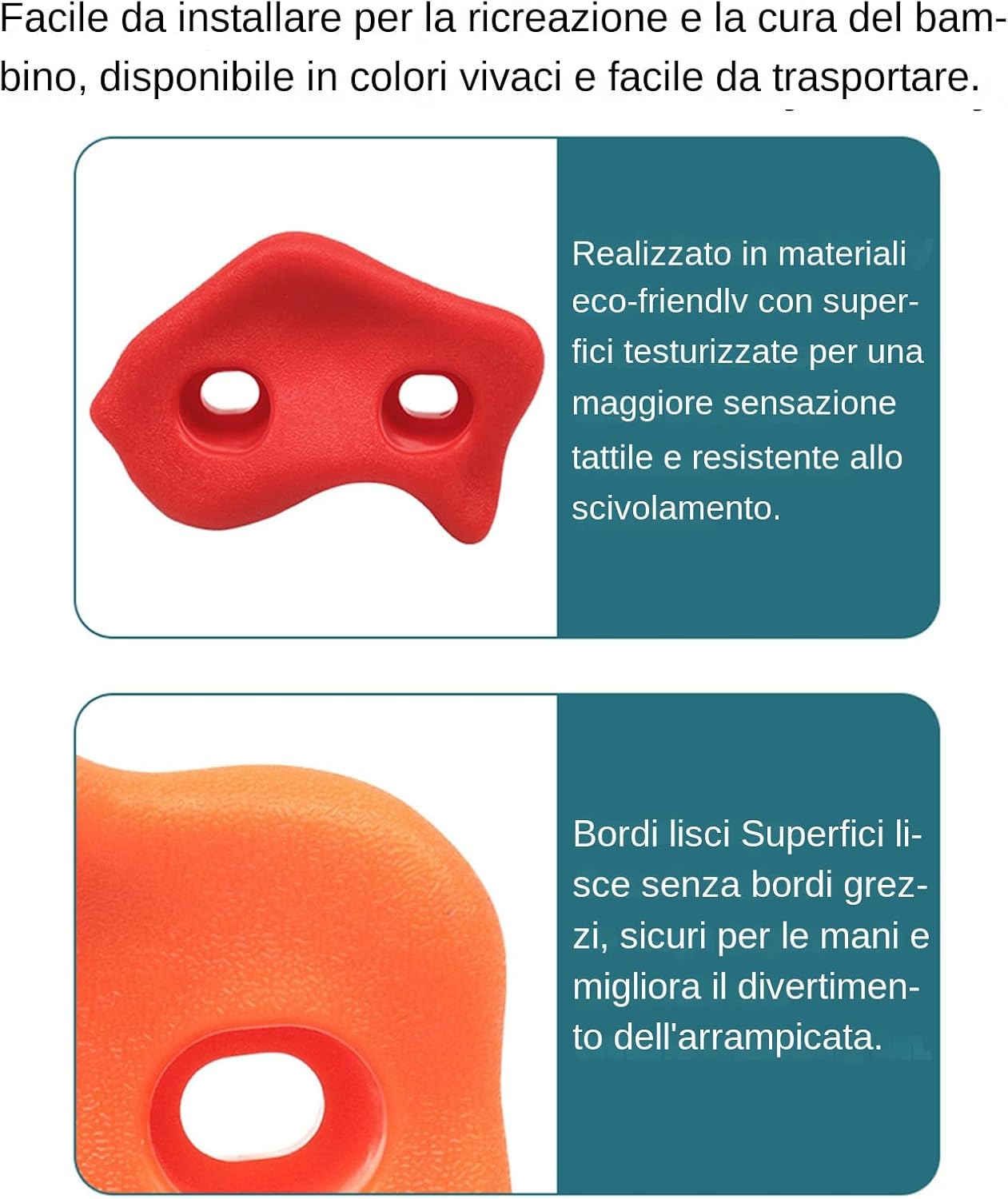 Sicurezza e Comfort: Progettate per sicurezza e comfort con texture antiscivolo e finitura anti-sbavatura che migliorano la presa e la stabilità dei piedi durante l'arrampicata su alberi per bambini Adattabilità agli alberi: di fissaggio con cinghia intelligente abbinato a strumento di serraggio garantisce montaggio rapido e tensione regolabile, si adatta a diverse dimensioni degli alberi mantenendo la facilità d'uso per tutti gli appassionati di arrampicata Divertimento a Misura : Ottimi per aree pubbliche e giardini residenziali, questi appigli garantiscono vasta applicabilità, ideali per parchi giochi ragazzi promuovendo di gioco attivo Vantaggi Evolutivi: Favorisce fisica ed equilibrio a una coordinazione occhio-mano ottimizzata, incoraggiando maggiore sicurezza, concentrazione e sviluppo infantile globale durante il gioco. Struttura Stabile: Progettato per uso intensivo, offre eccellente assistenza agli arrampicatori con telaio stabile e cintura rinta a doppio aggancio sicuro per massima stabilità durante l'uso