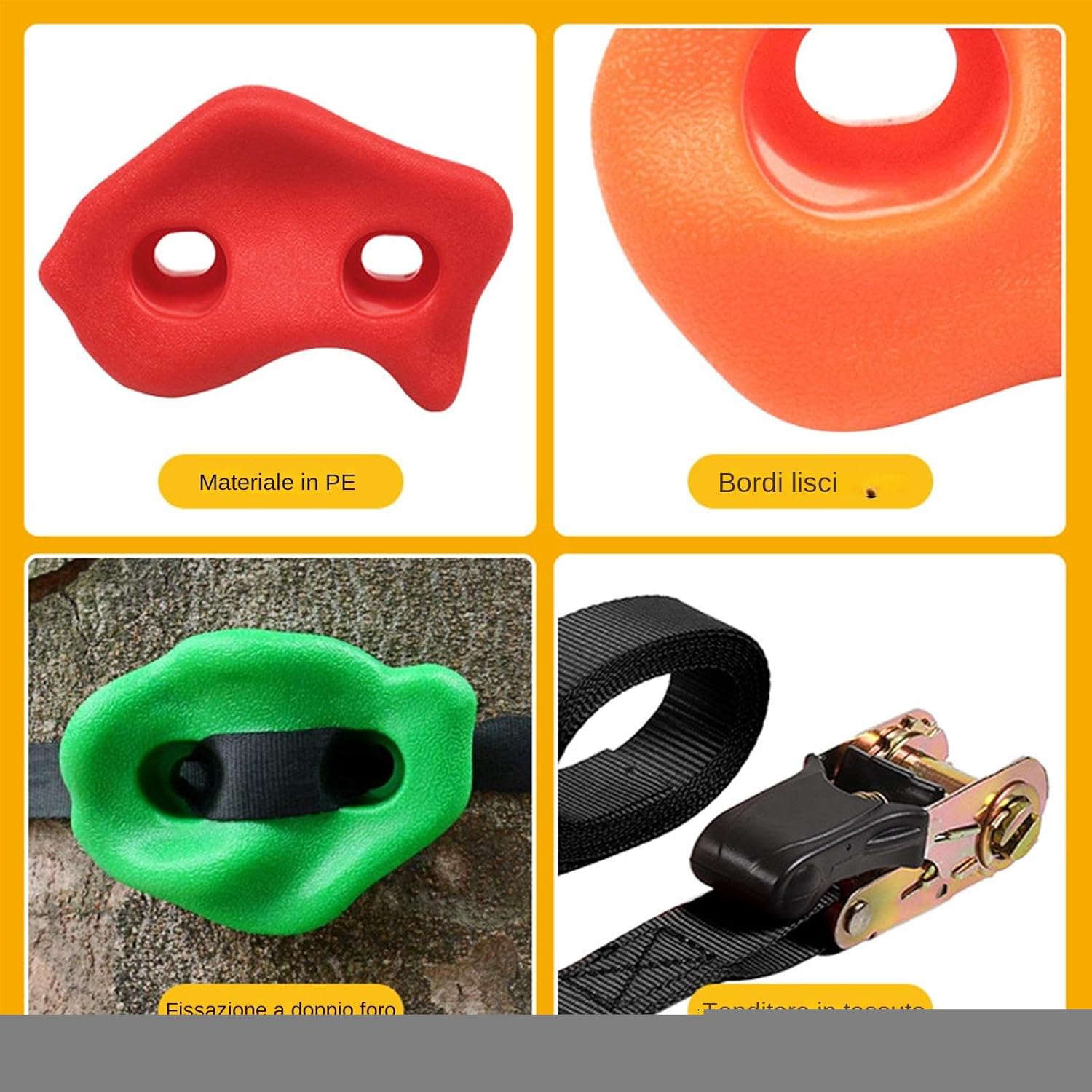 Sicurezza e Comfort: Progettate per sicurezza e comfort con texture antiscivolo e finitura anti-sbavatura che migliorano la presa e la stabilità dei piedi durante l'arrampicata su alberi per bambini Configurazione semplice: di fissaggio a cinghia diretto con strumento di serraggio per montaggio veloce offre tensione regolabile adatta a diverse dimensioni degli alberi, garantendo utilizzo pratico durante le attività all'aperto Divertimento a Misura : Ottimi per aree pubbliche e giardini residenziali, questi appigli garantiscono vasta applicabilità, ideali per parchi giochi ragazzi promuovendo di gioco attivo Vantaggi Evolutivi: Favorisce fisica ed equilibrio a una coordinazione occhio-mano ottimizzata, incoraggiando maggiore sicurezza, concentrazione e sviluppo infantile globale durante il gioco. Robustezza Garantita: Ingegnerizzato per stabilità e , supporta fino a 100 kg con cintura robusta a doppio foro che aumenta la sicurezza durante l'arrampicata